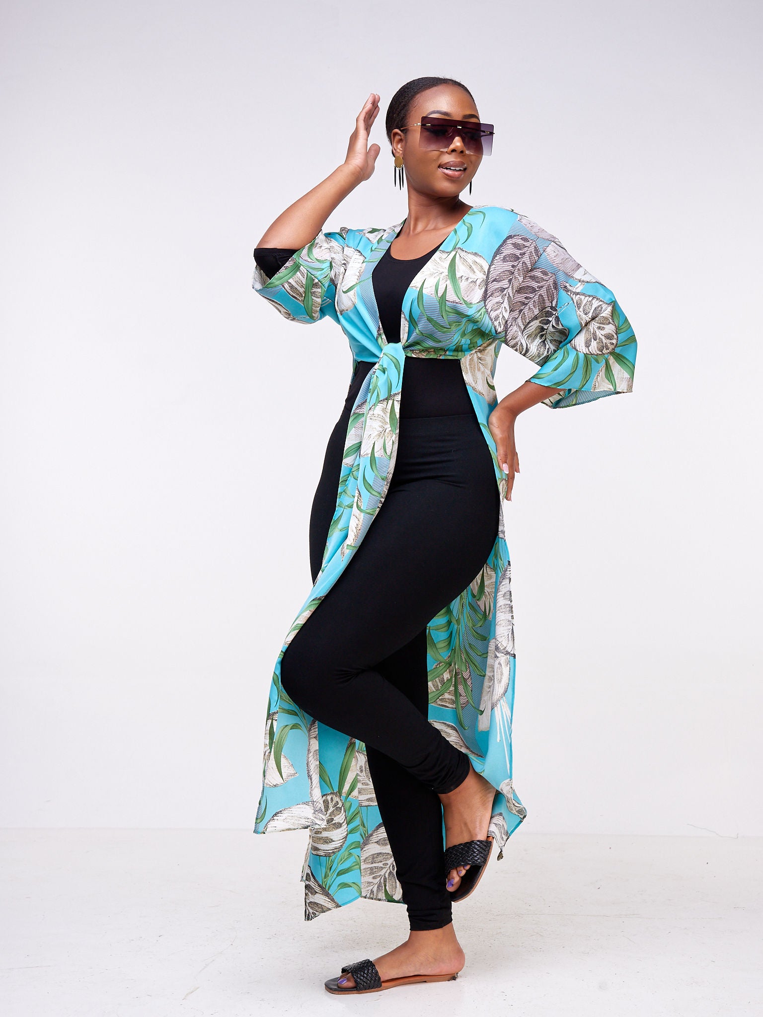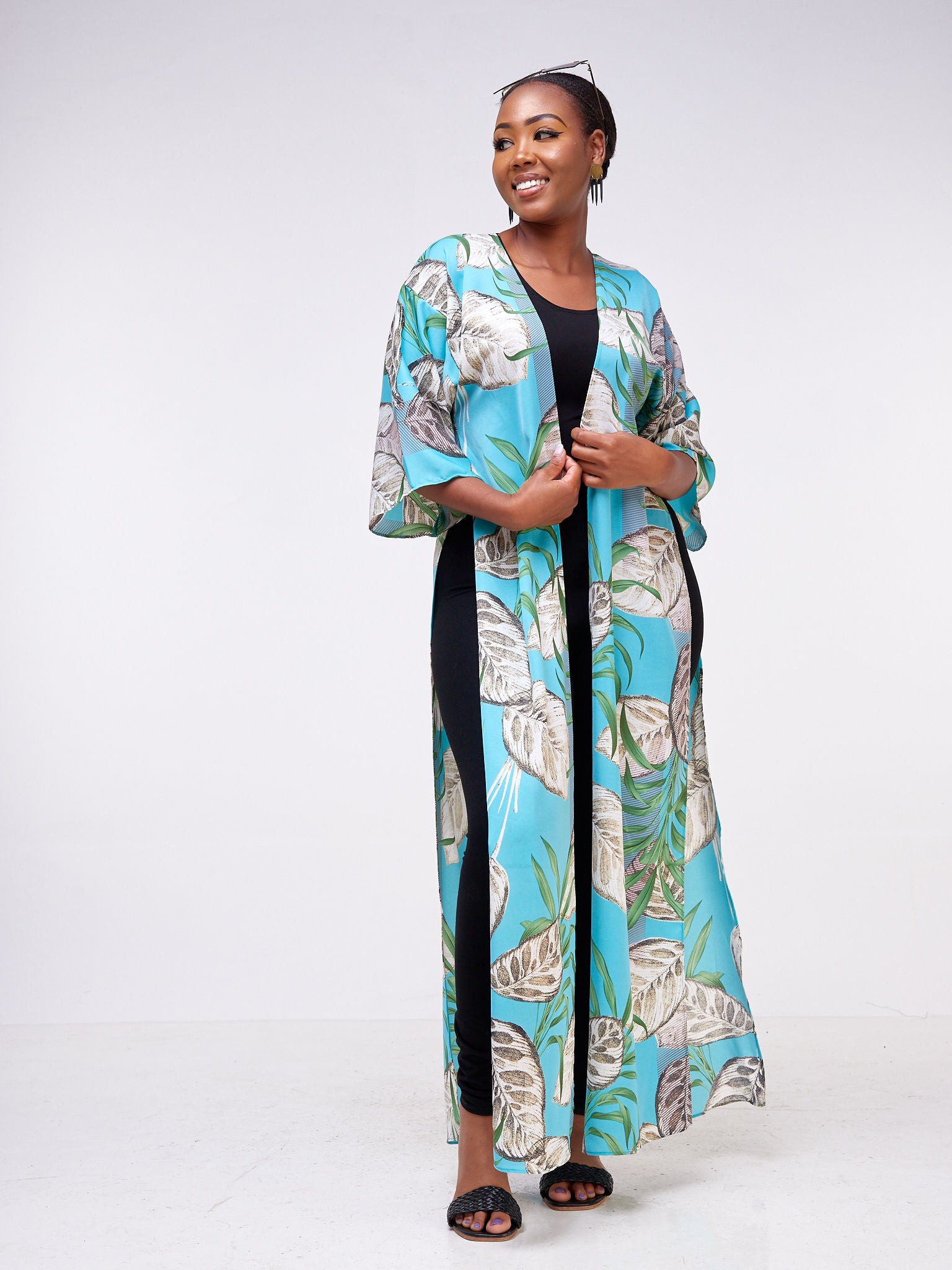 Vivo Basic Nandi High Slit Kimono - Blue / Green Leaf Print