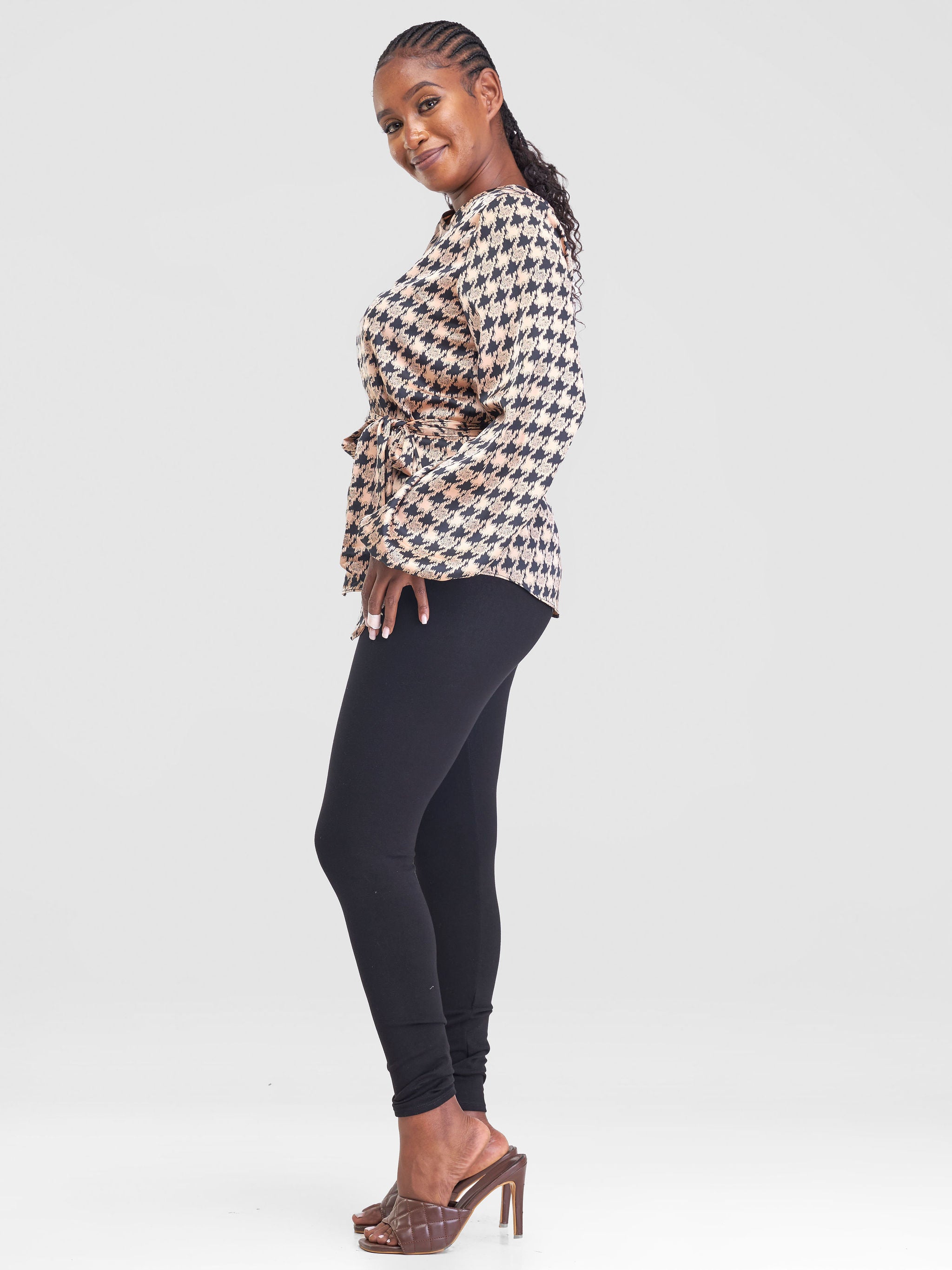 Vivo Basic Satin Bishop Sleeved Top - Peach / Black Print