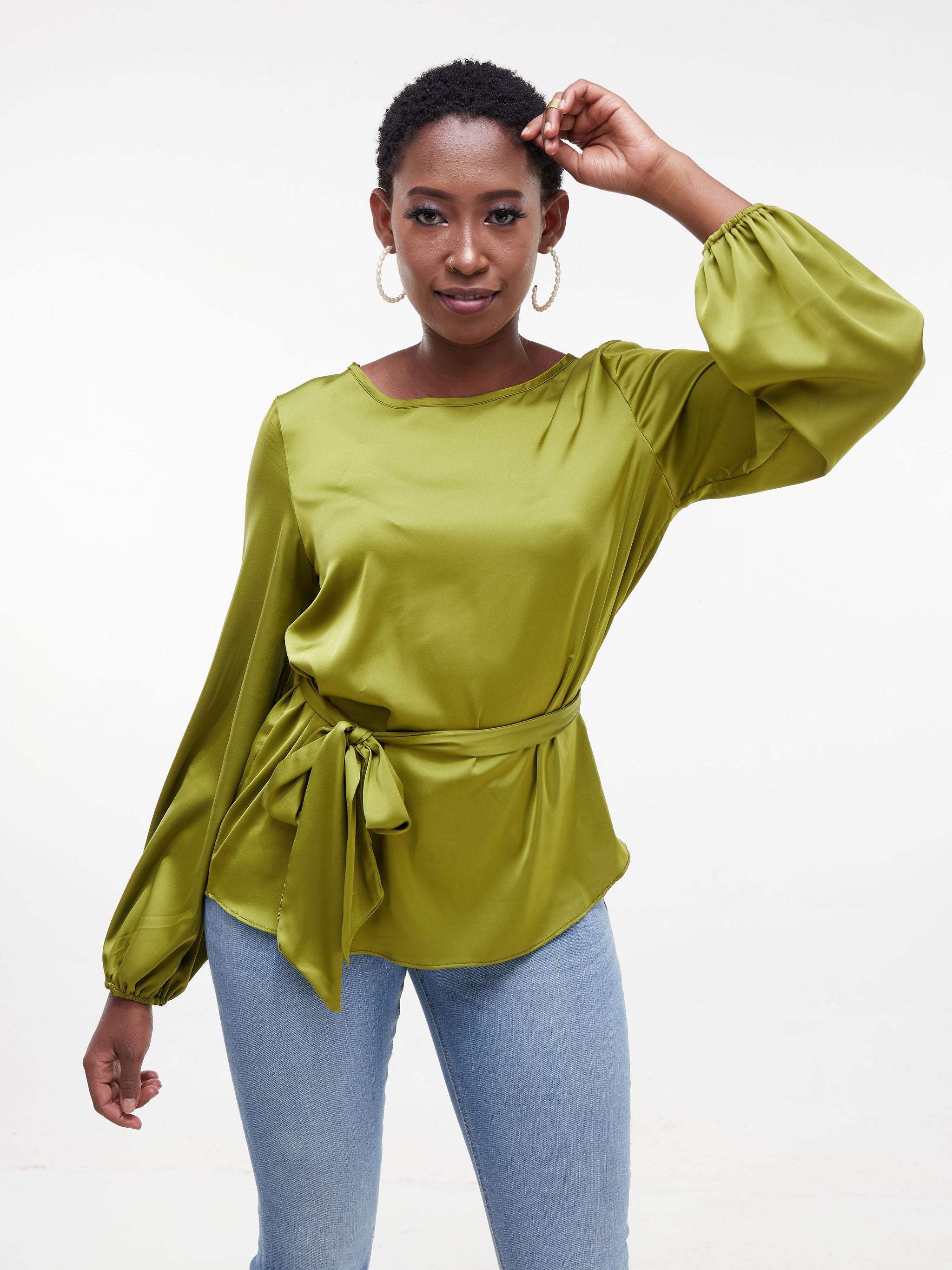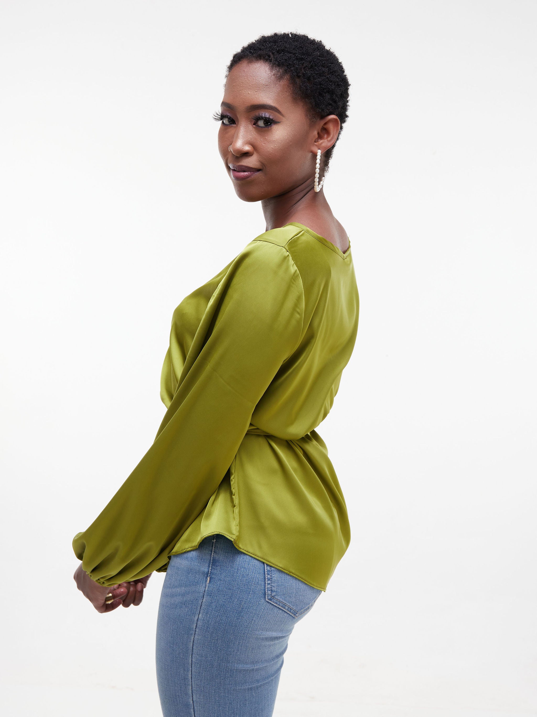 Vivo Basic Satin Bishop Sleeved Top - Olive Green
