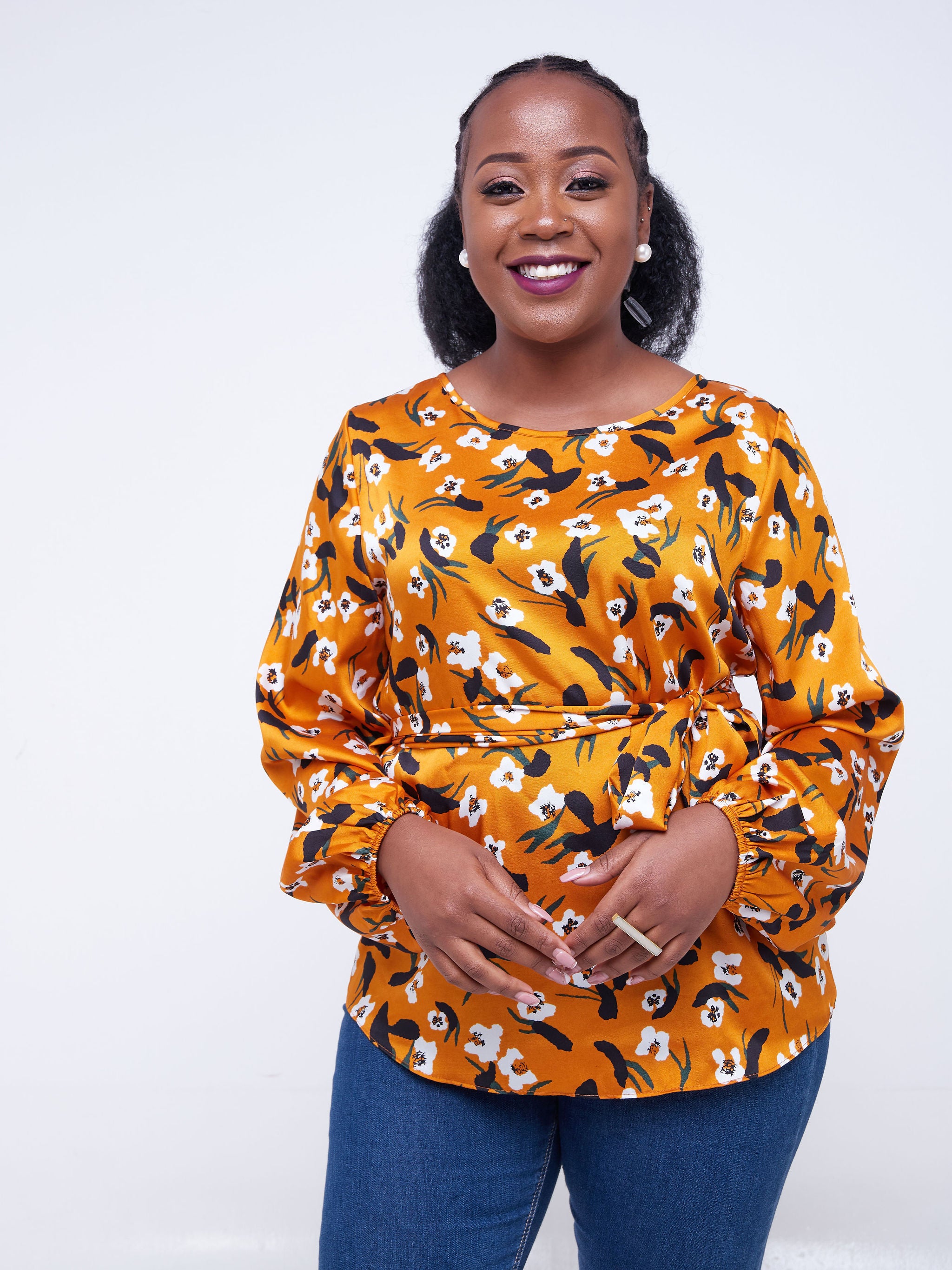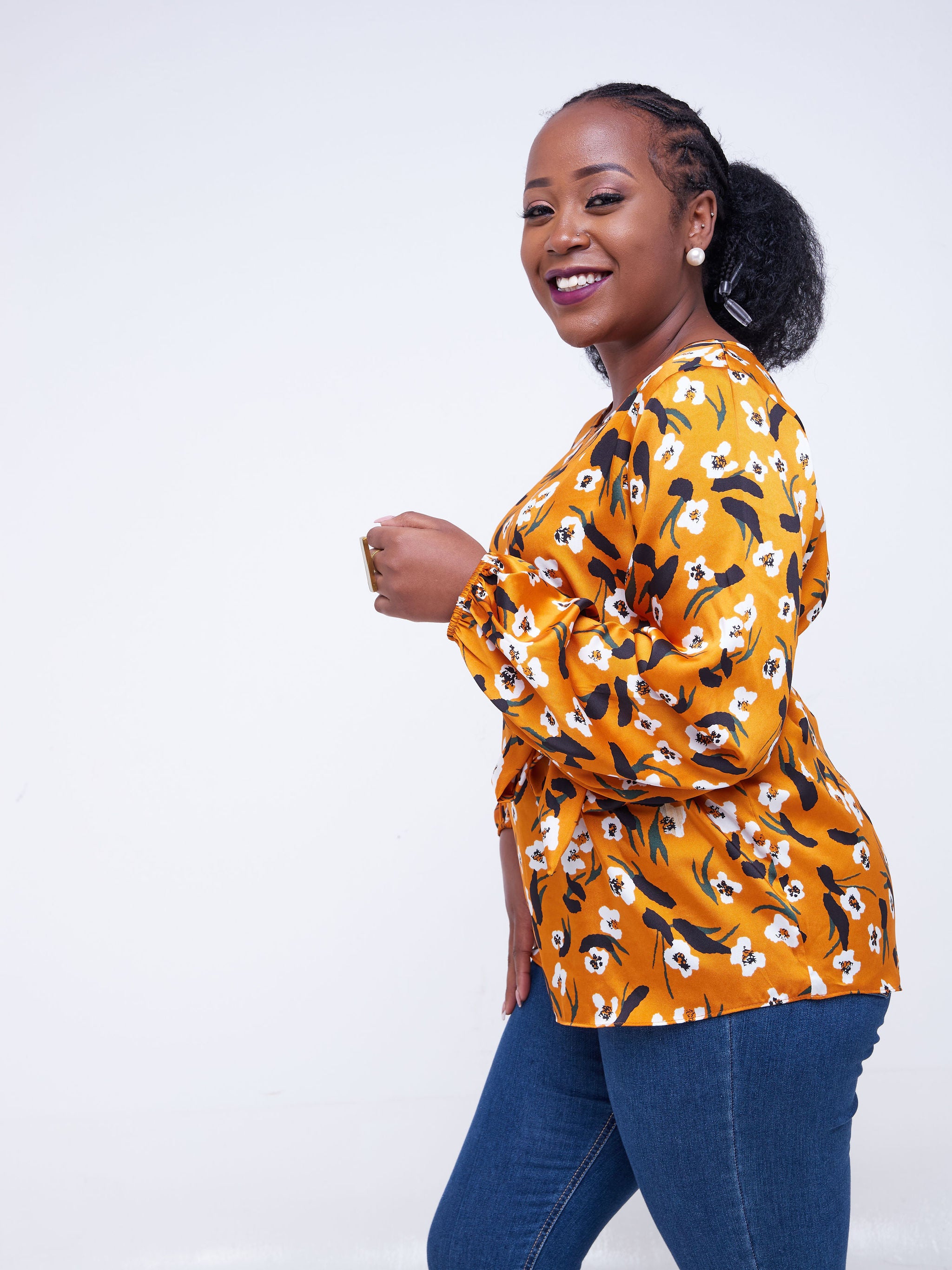 Vivo Basic Satin Bishop Sleeved Top - Orange / Black Floral Print