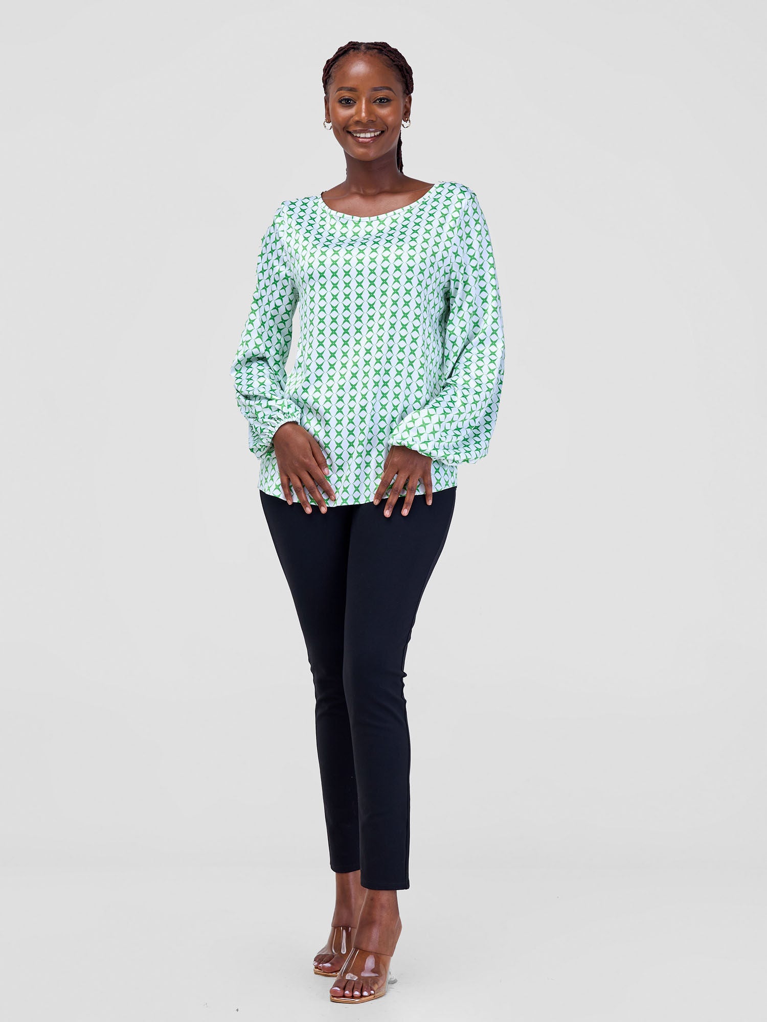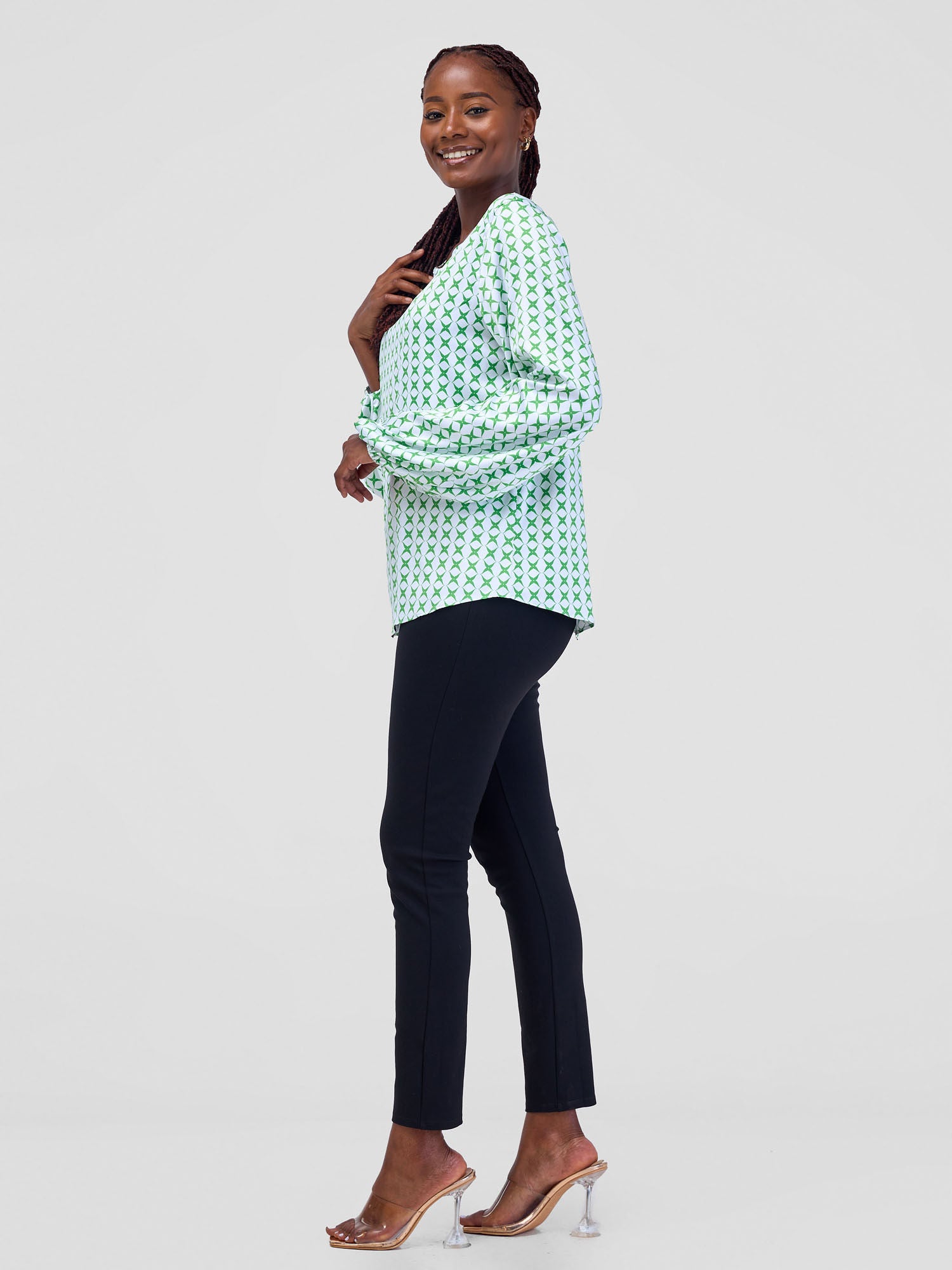 Vivo Basic Satin Bishop Sleeved Top - White / Green Clover Print