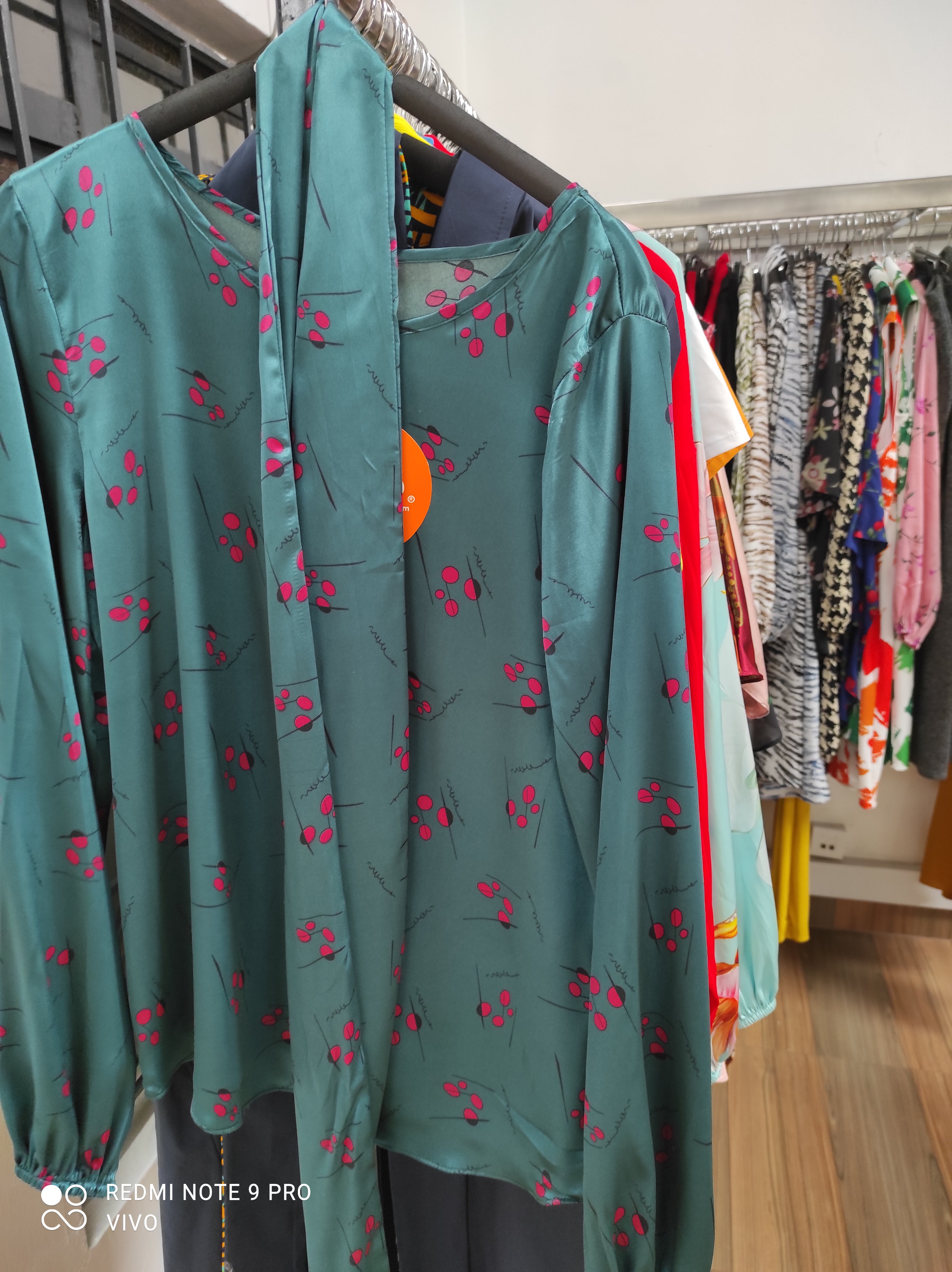 Vivo Basic Satin Bishop Sleeved Top - Teal / Pink Print