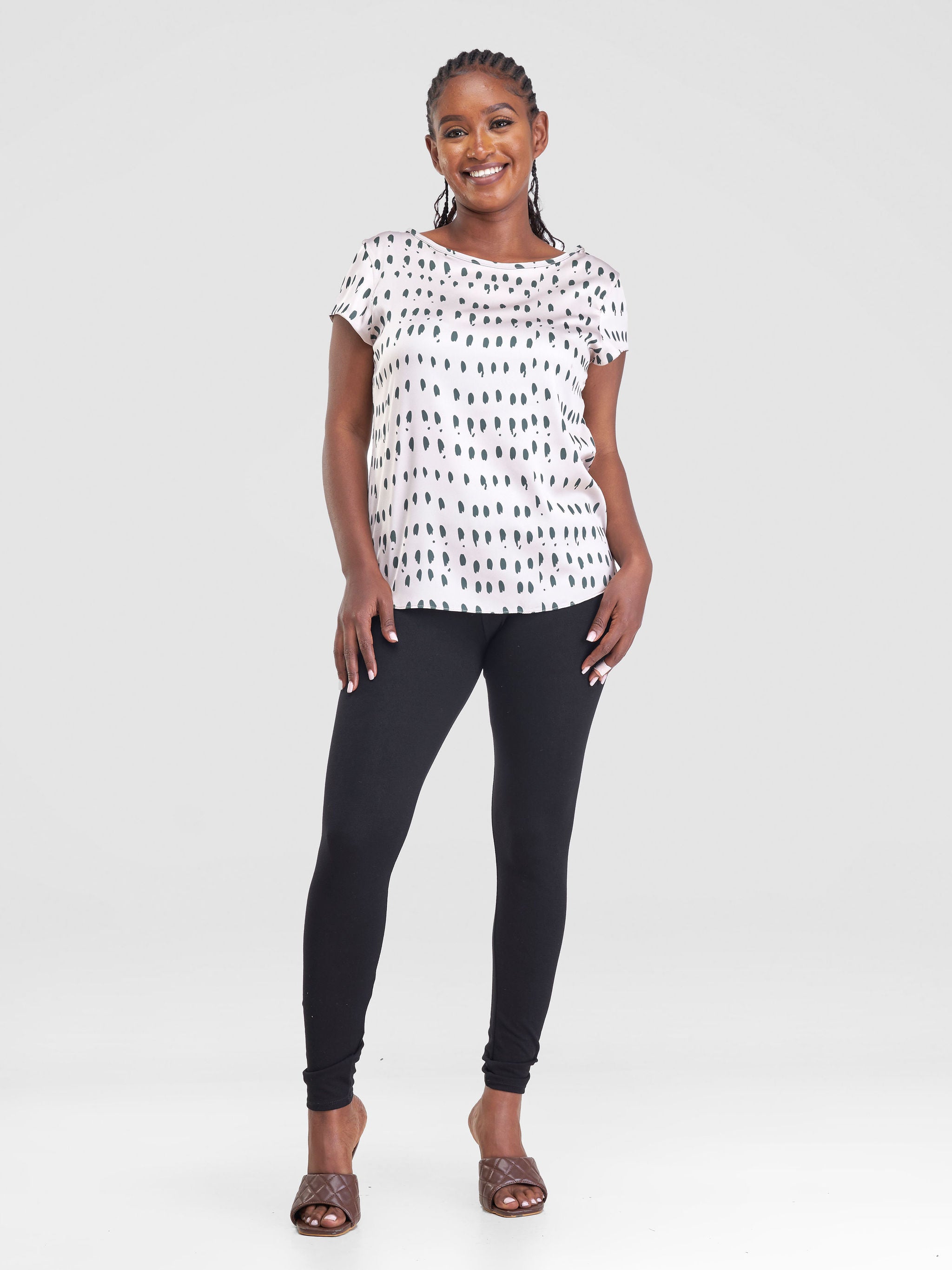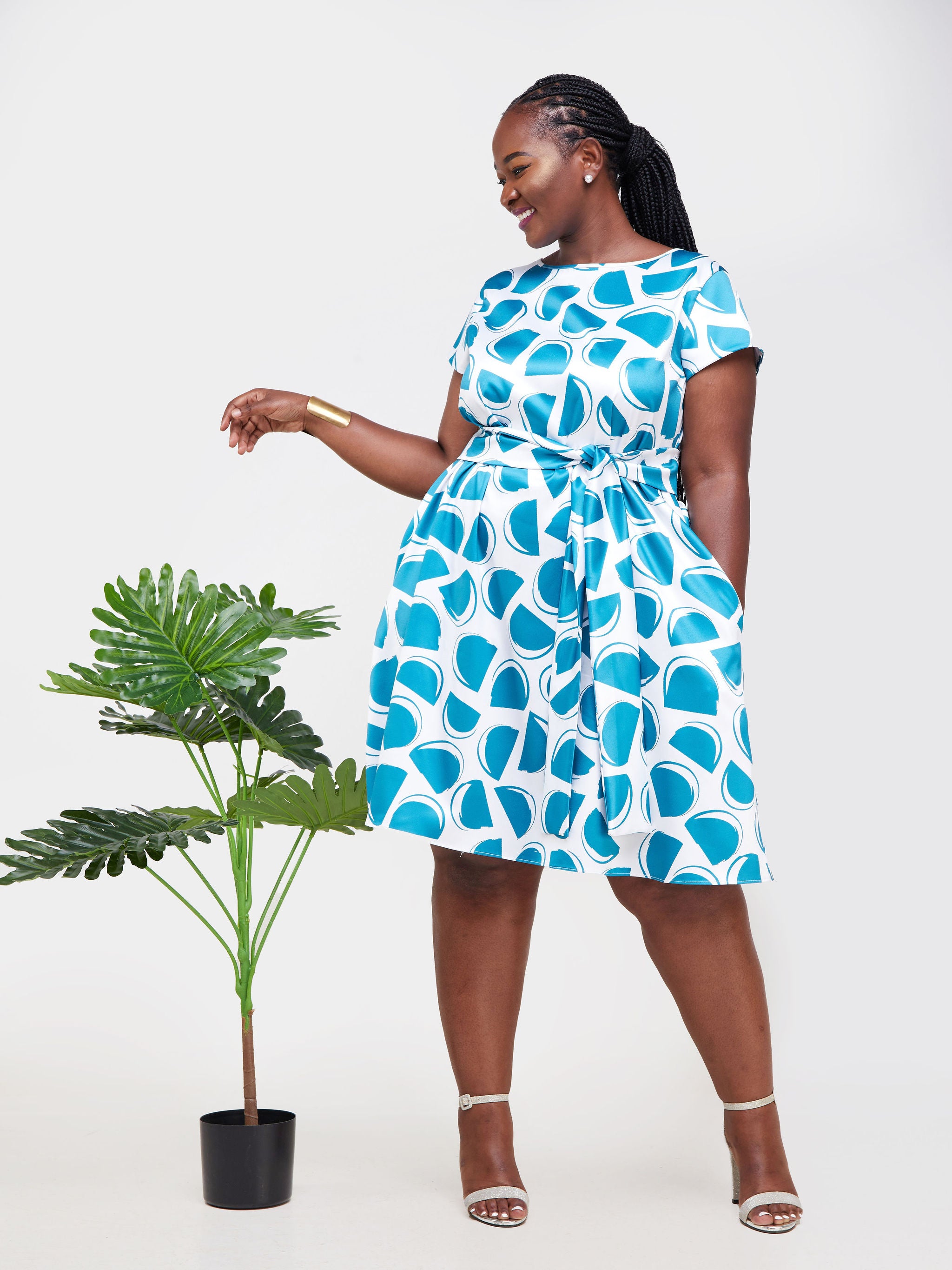 Vivo Basic Satin Cap Sleeve Knee Length Dress - White / Teal Abstract Print