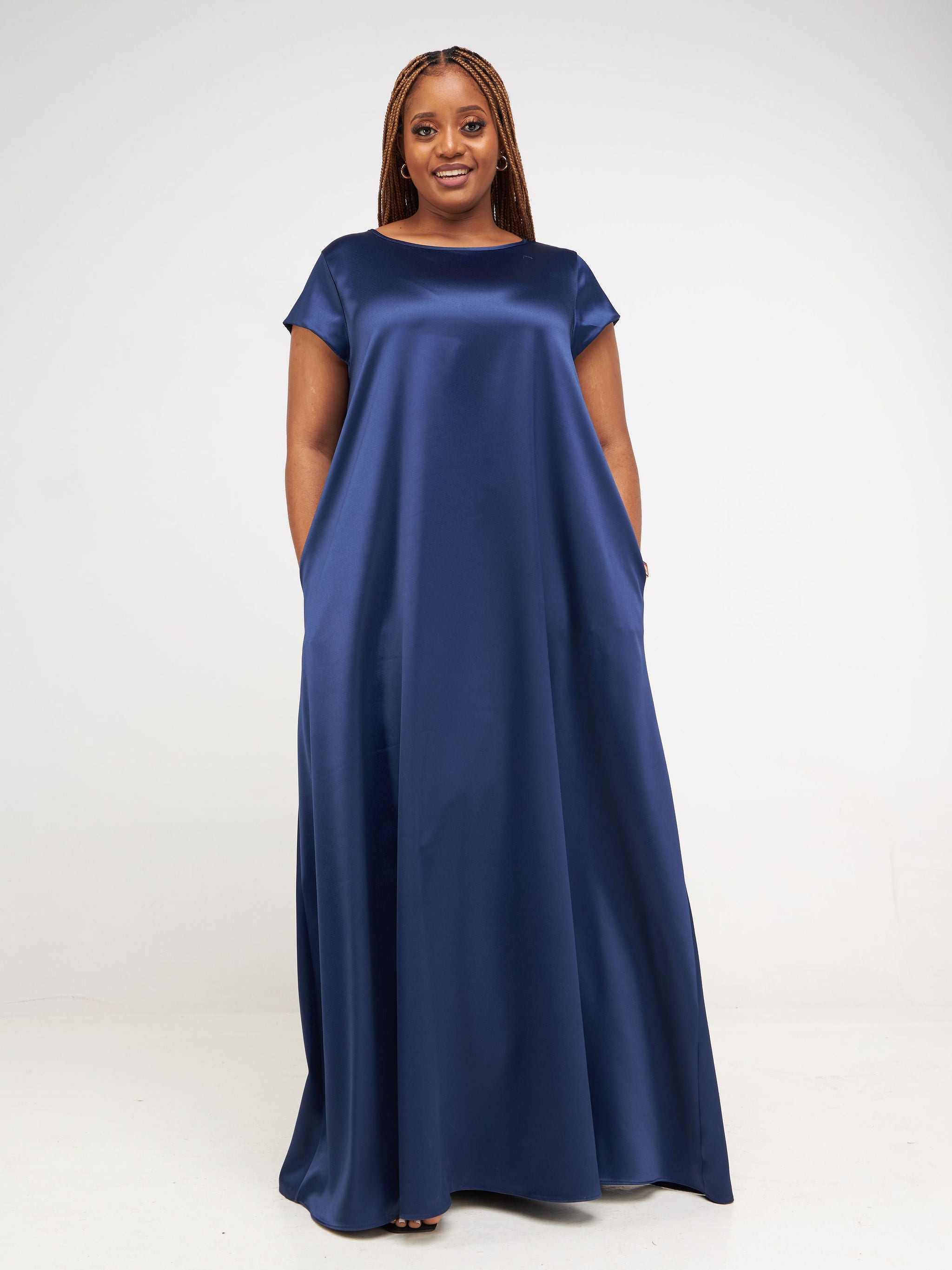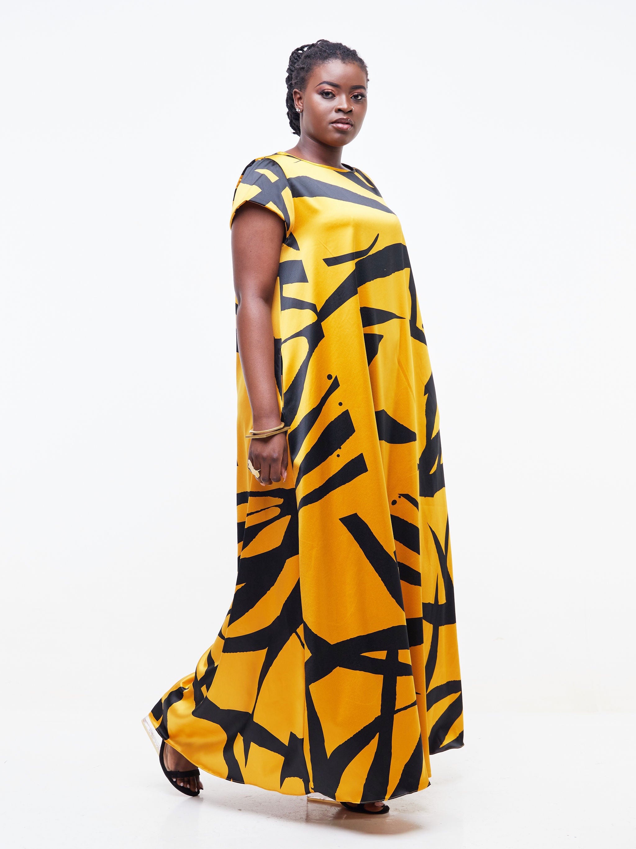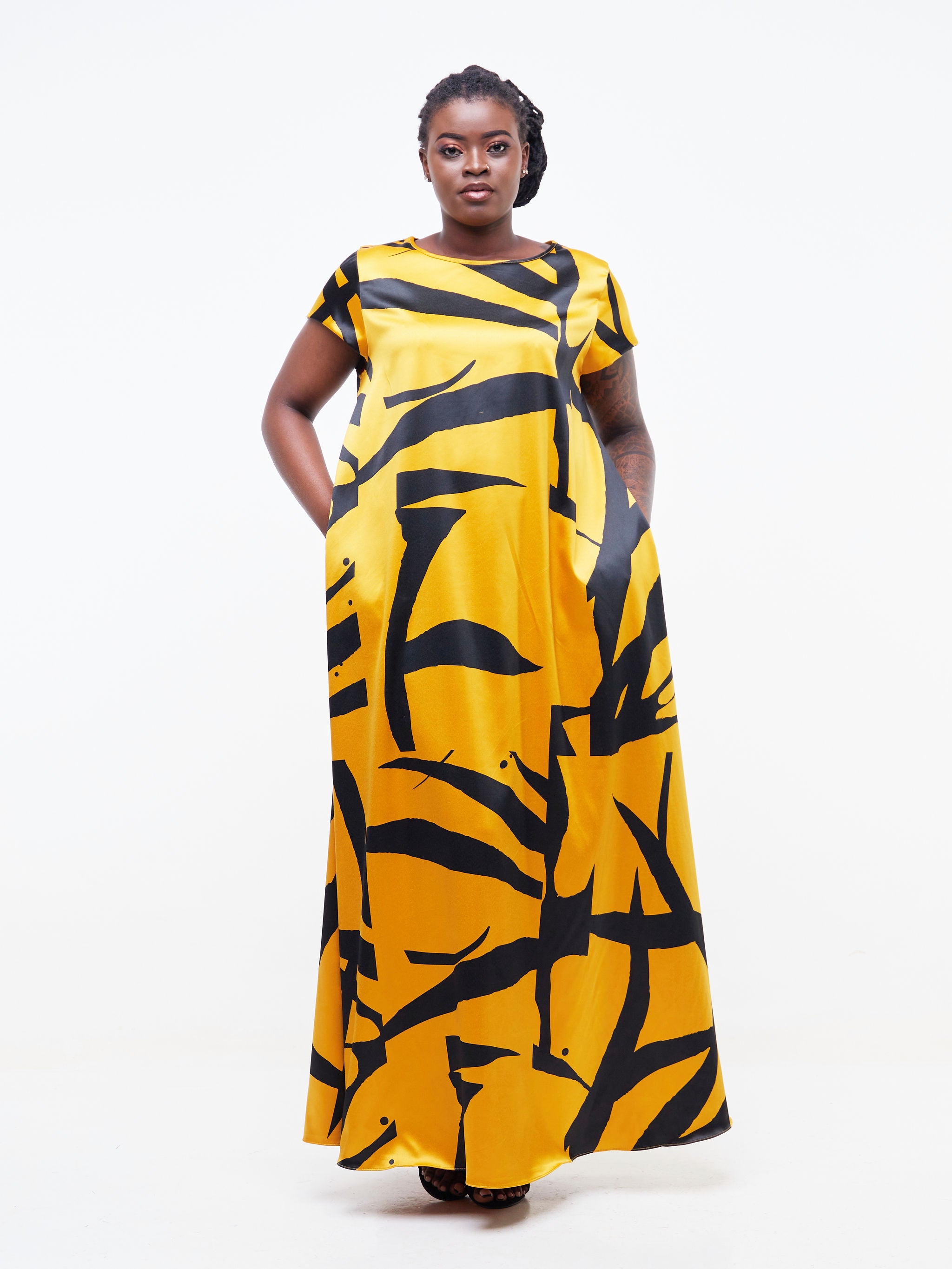 Vivo Basic Satin Cap Sleeve Tent Maxi Dress - Mustard / Black Abstract Print