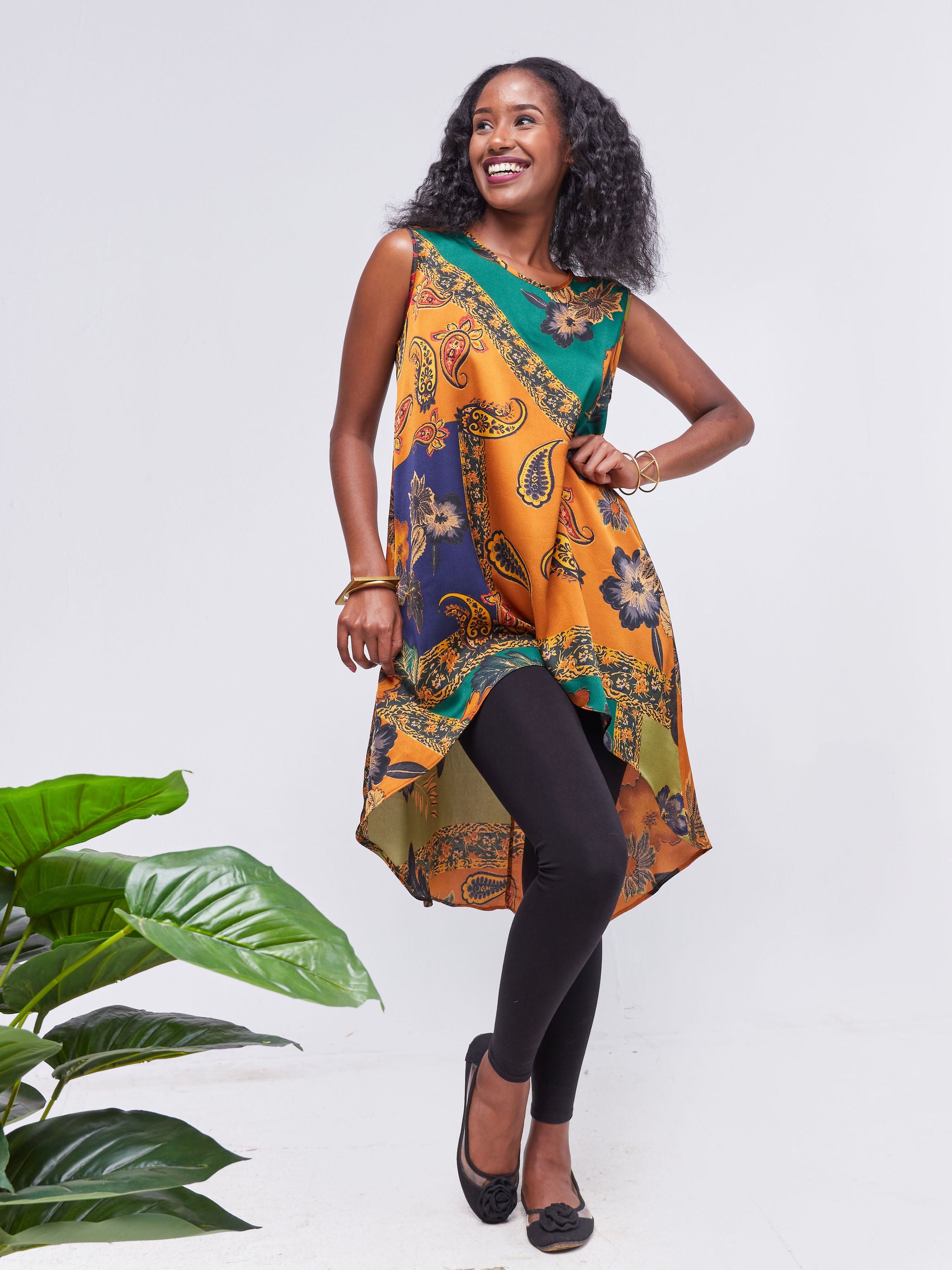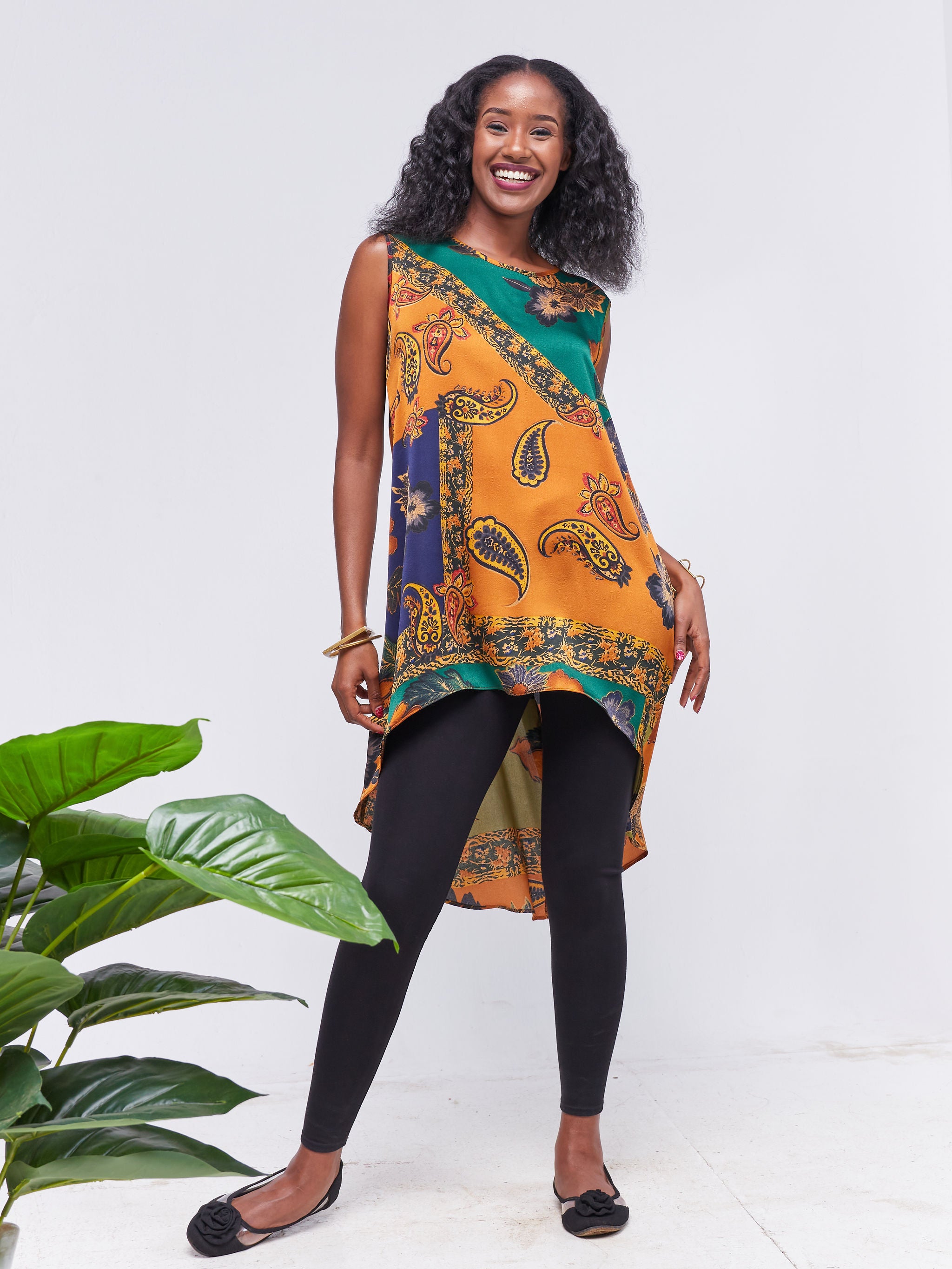 Vivo Basic Sleeveless High Low Top - Rust / Hunters Green Floral Print