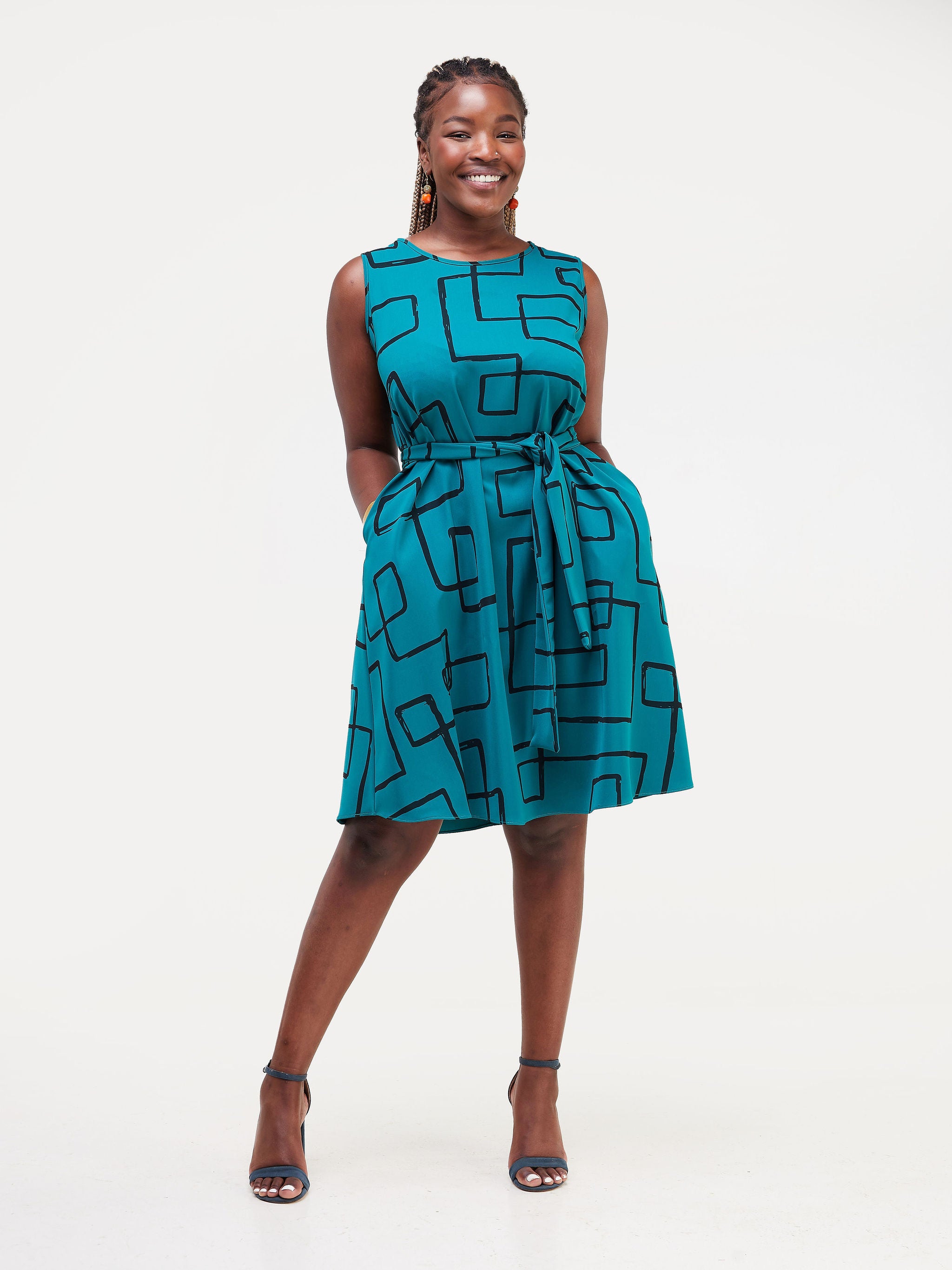 Vivo Basic Sleeveless Tent Dress - Teal / Black Geometric Print