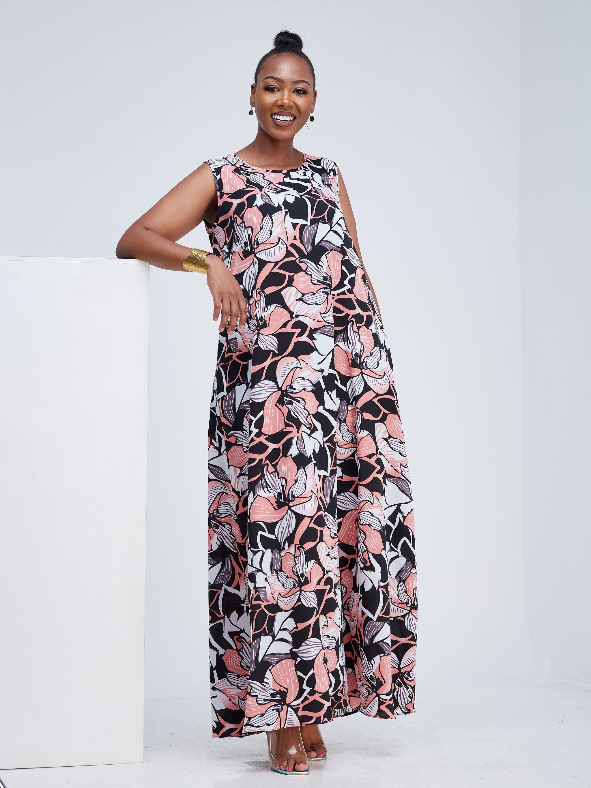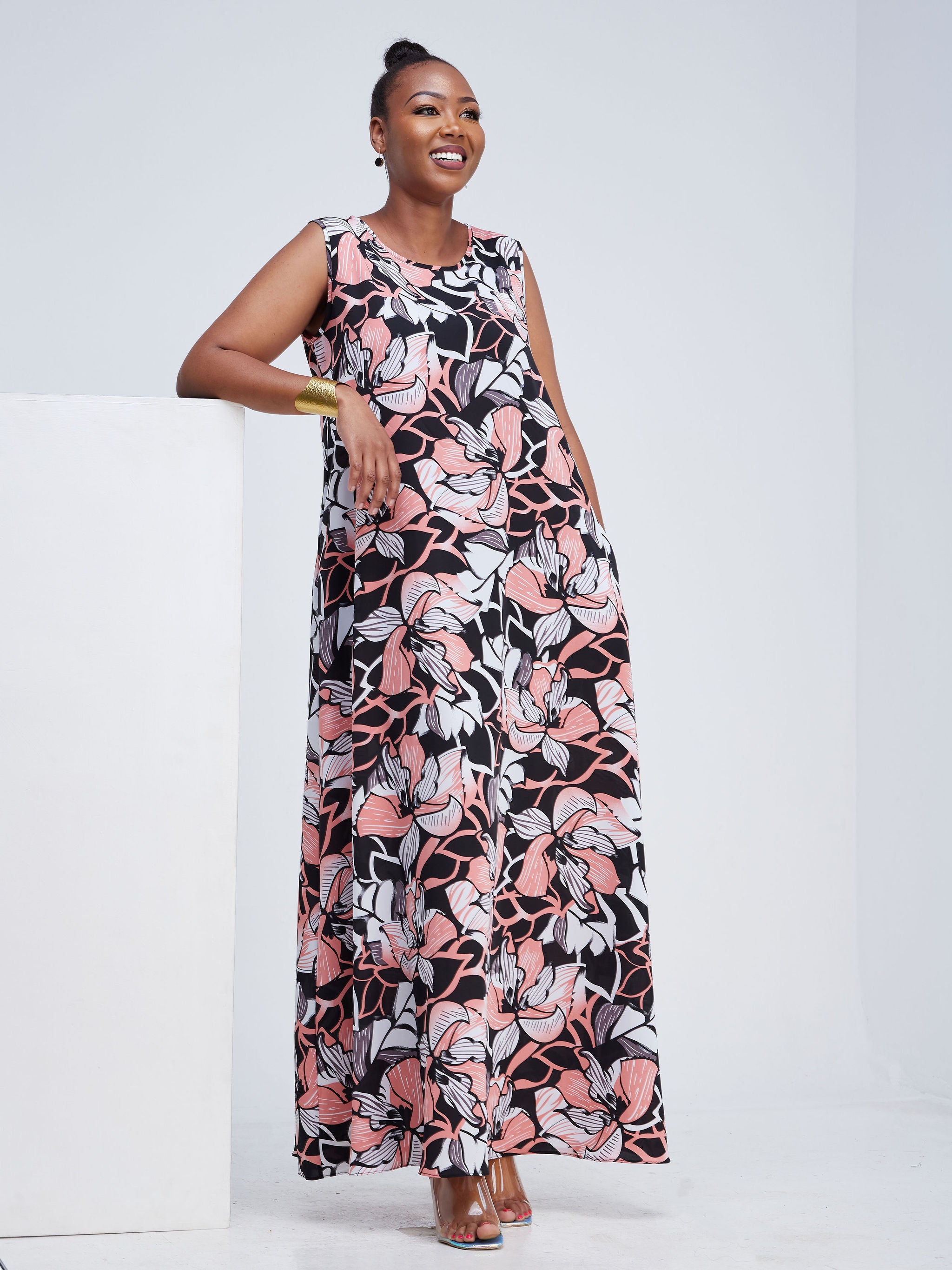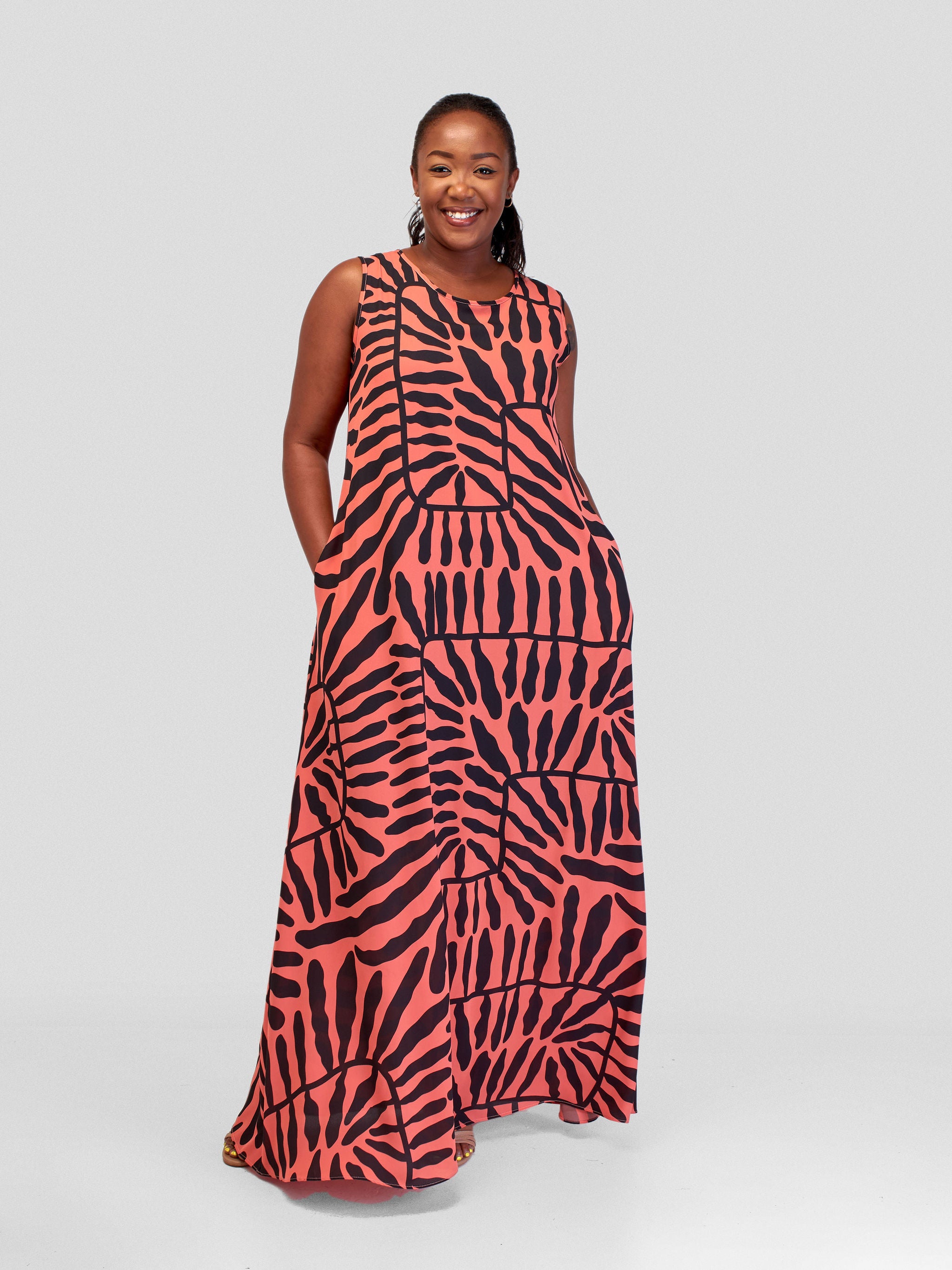 Vivo Basic Sleeveless Tent Maxi Dress - Coral / Black Abstract Print