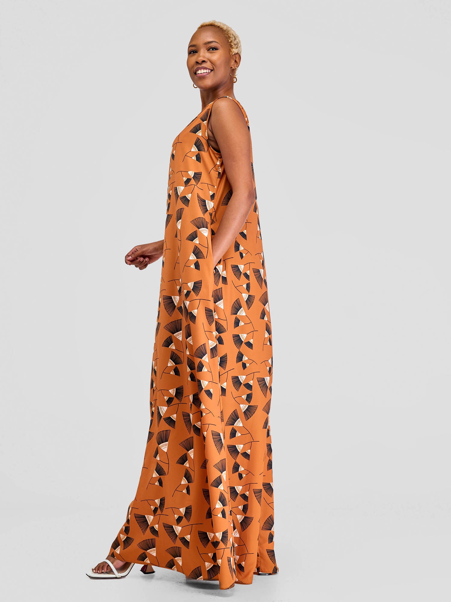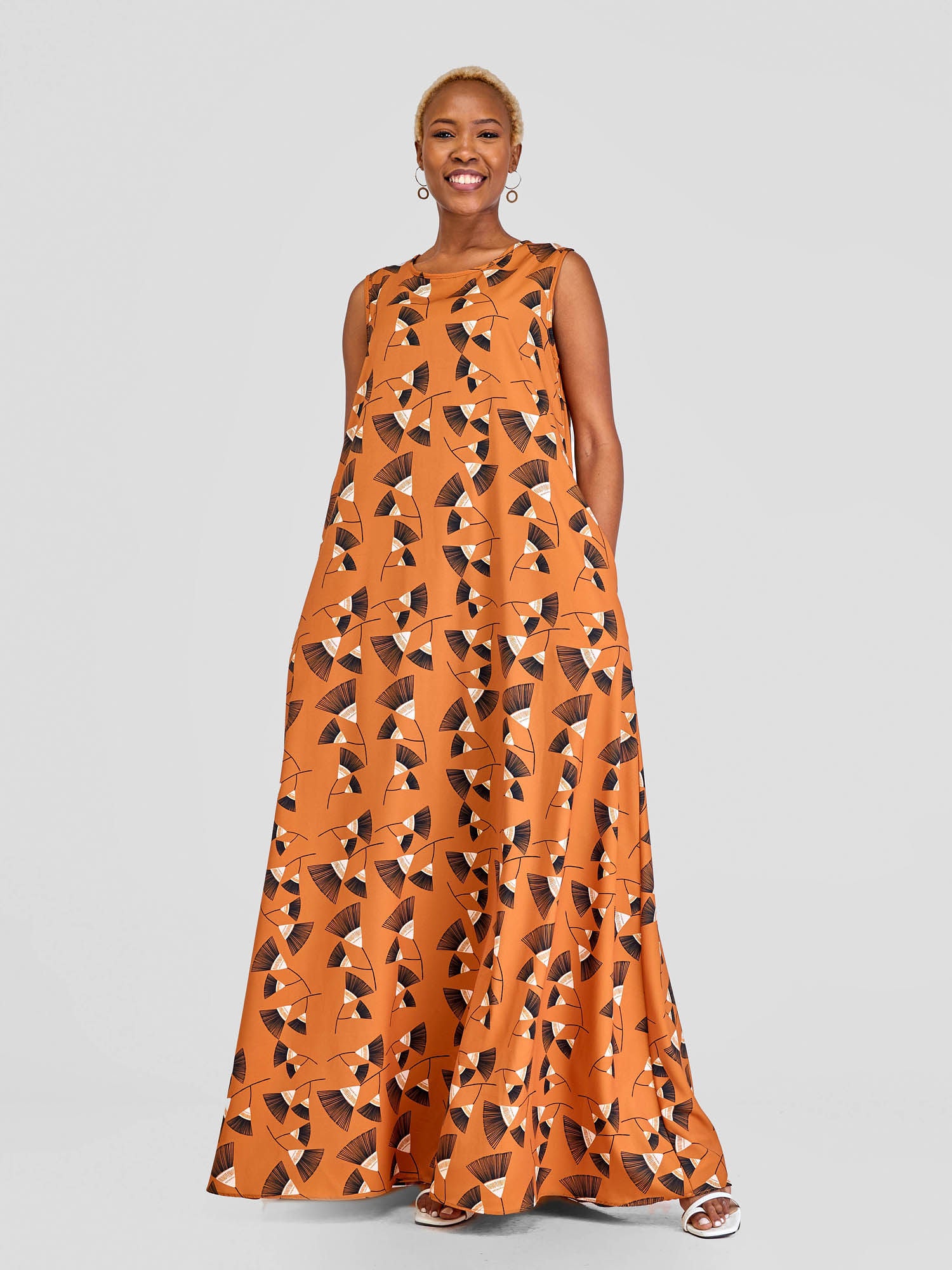 Vivo Basic Sleeveless Tent Maxi Dress - Black / Orange Print