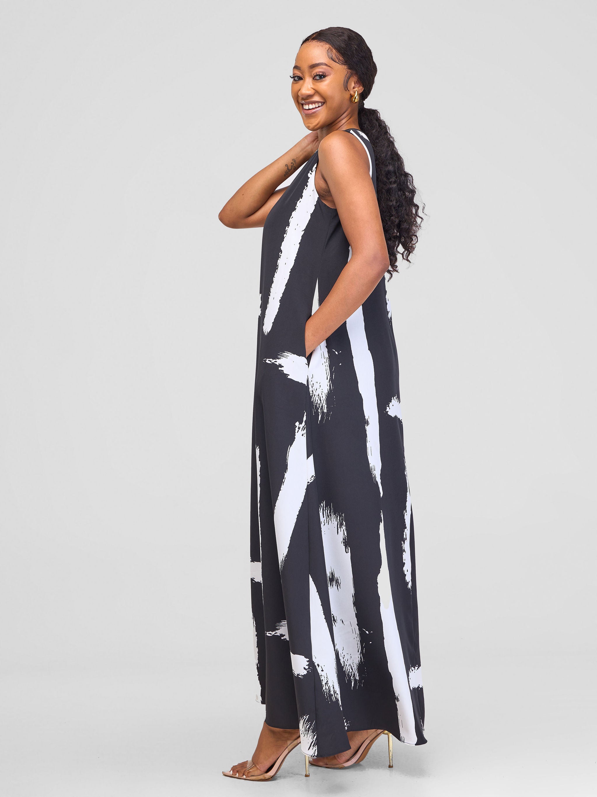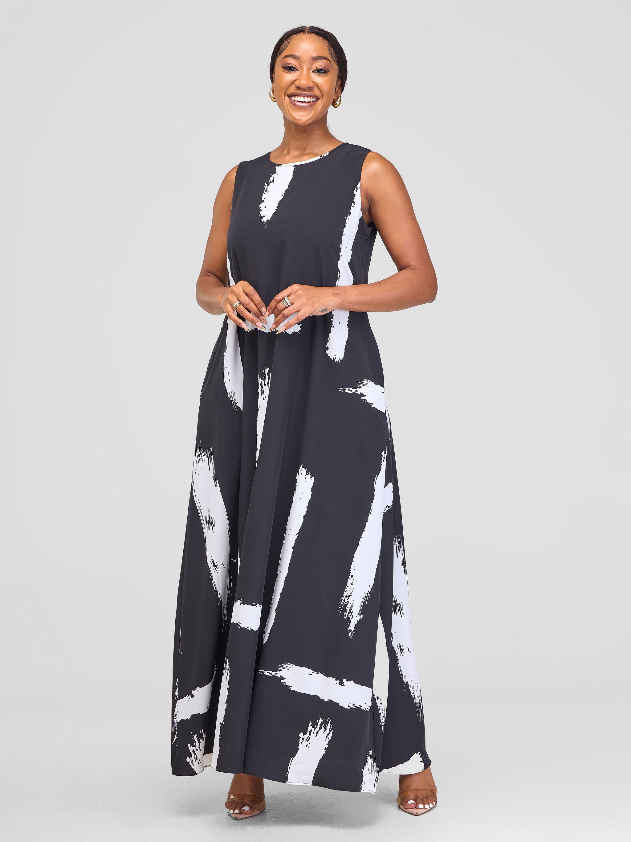 Vivo Basic Sleeveless Tent Maxi Dress - Black / White Print
