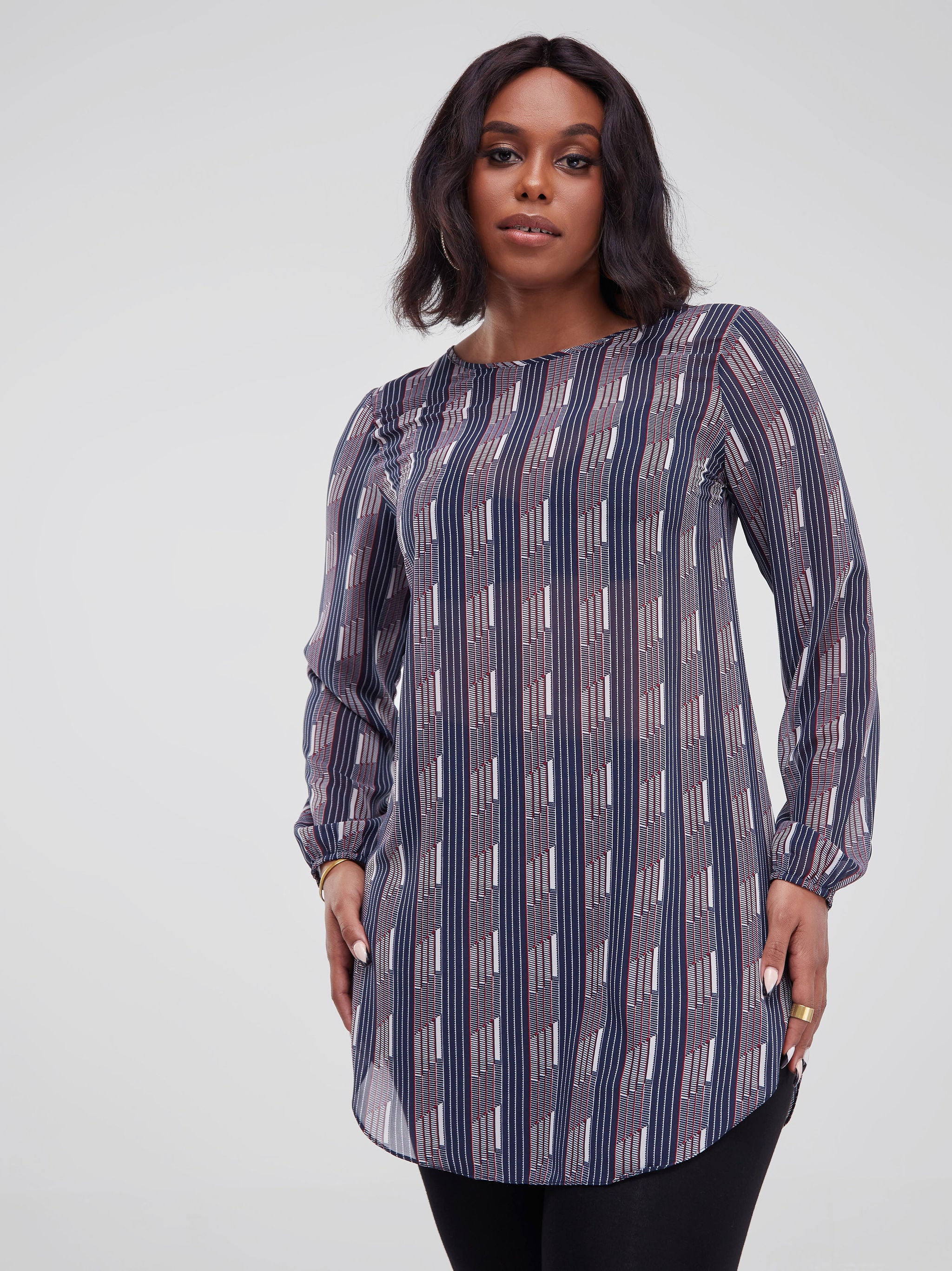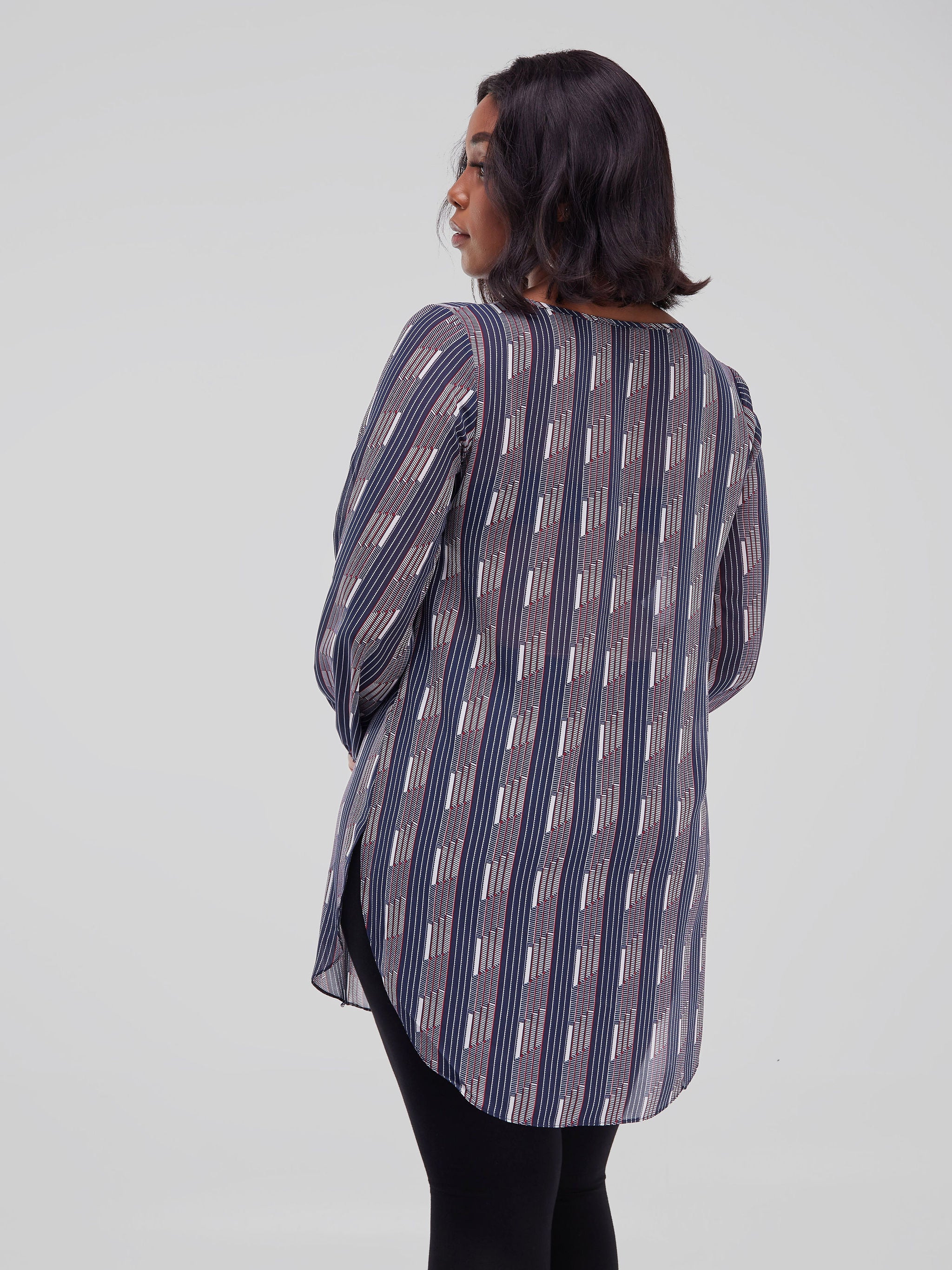 Vivo Basic Tsavo Scalloped Chiffon Top - Navy Blue Geometric Print