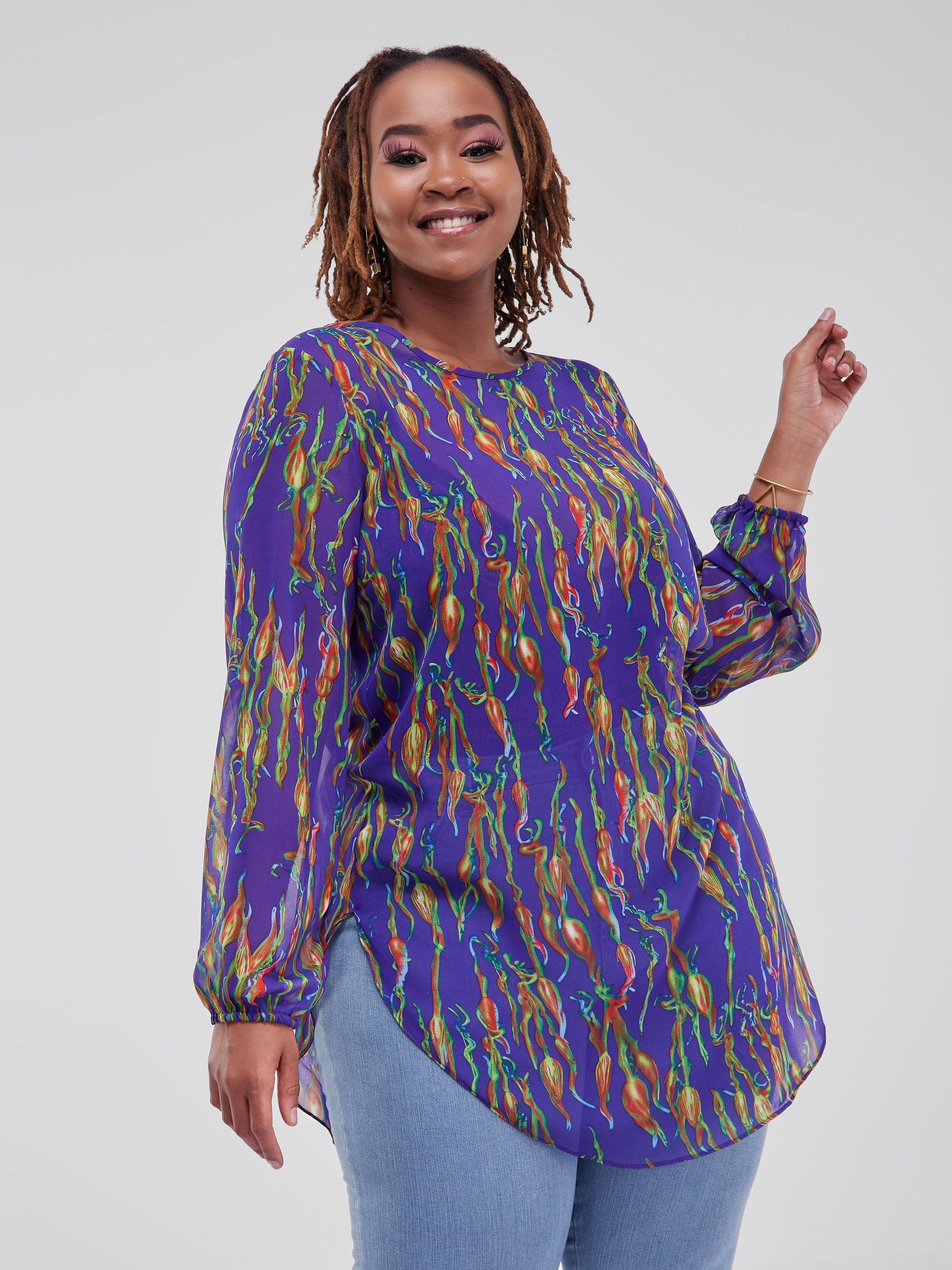 Vivo Basic Tsavo Scalloped Chiffon Top - Purple / Green Print