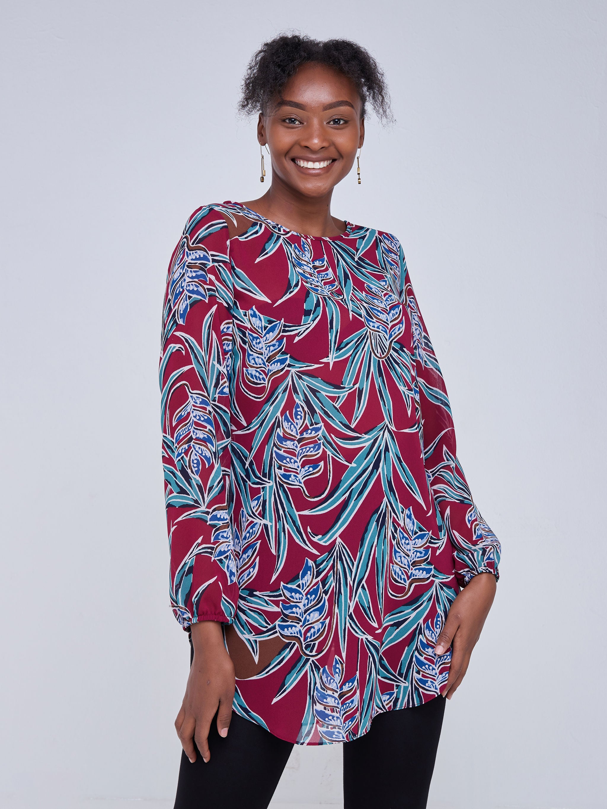 Vivo Basic Tsavo Scalloped Chiffon Top - Maroon Floral Print