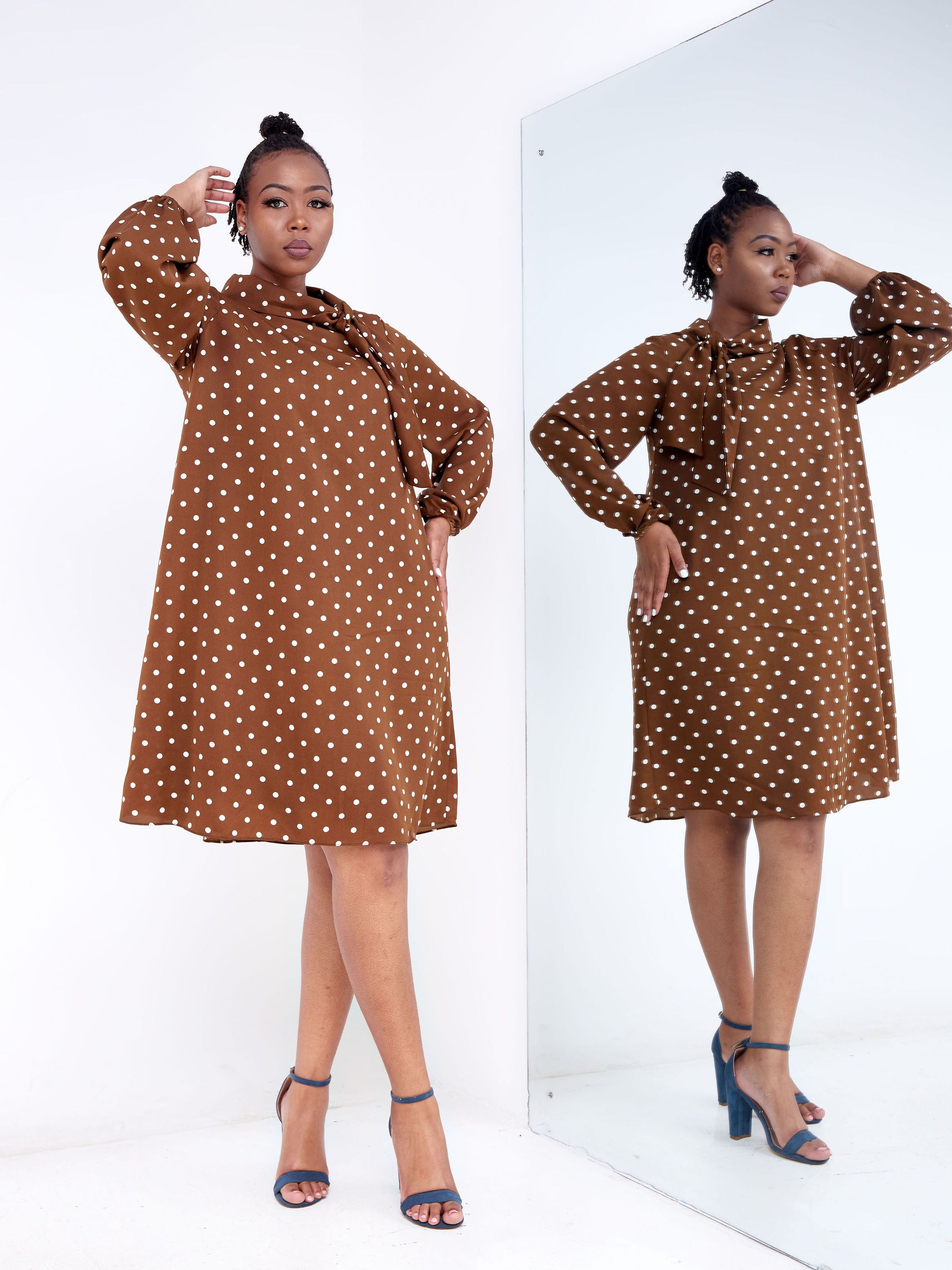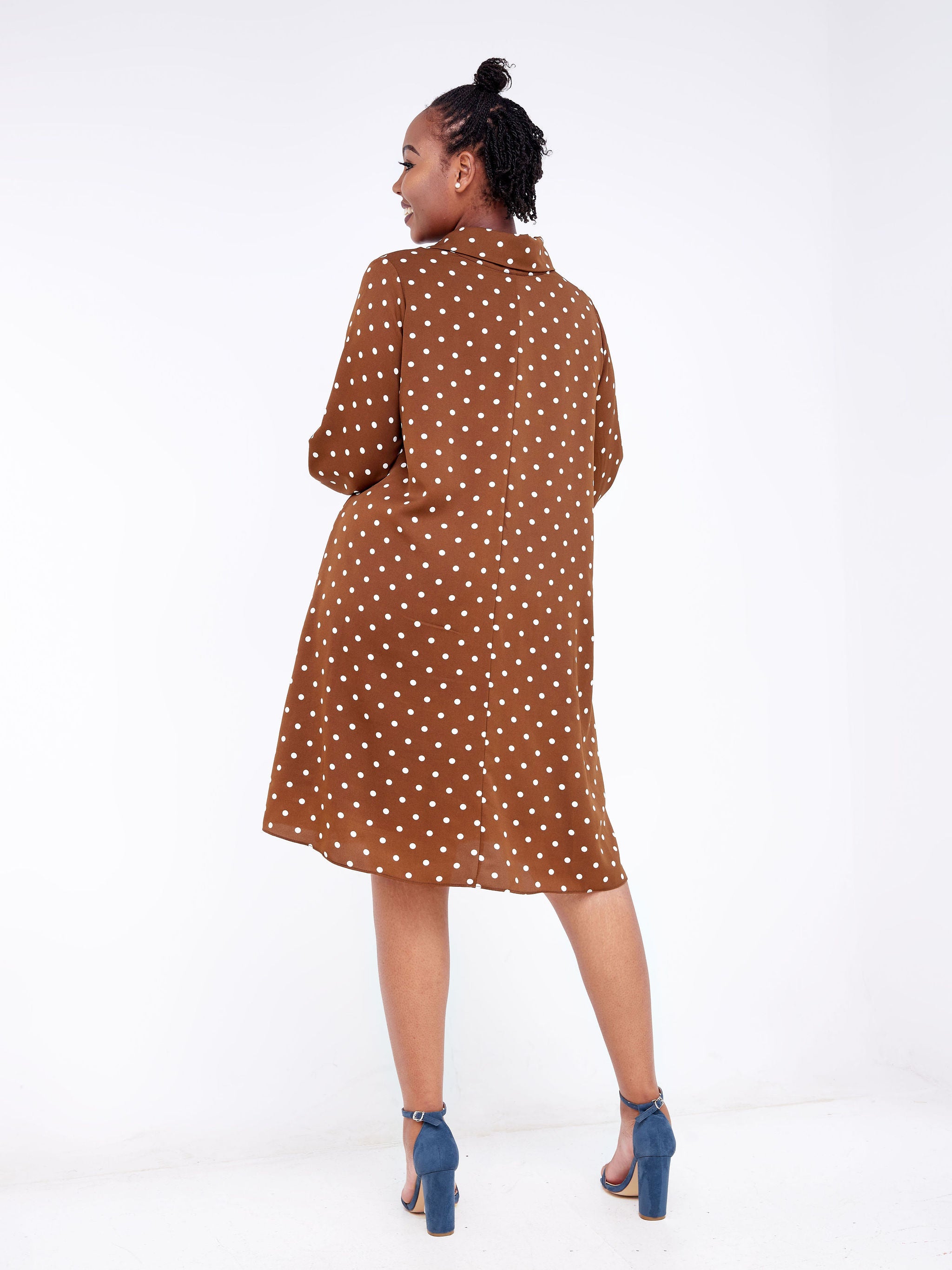 Vivo Bissa Bishop Sleeve Knee Length Dress - Brown / White Polka Dot Print