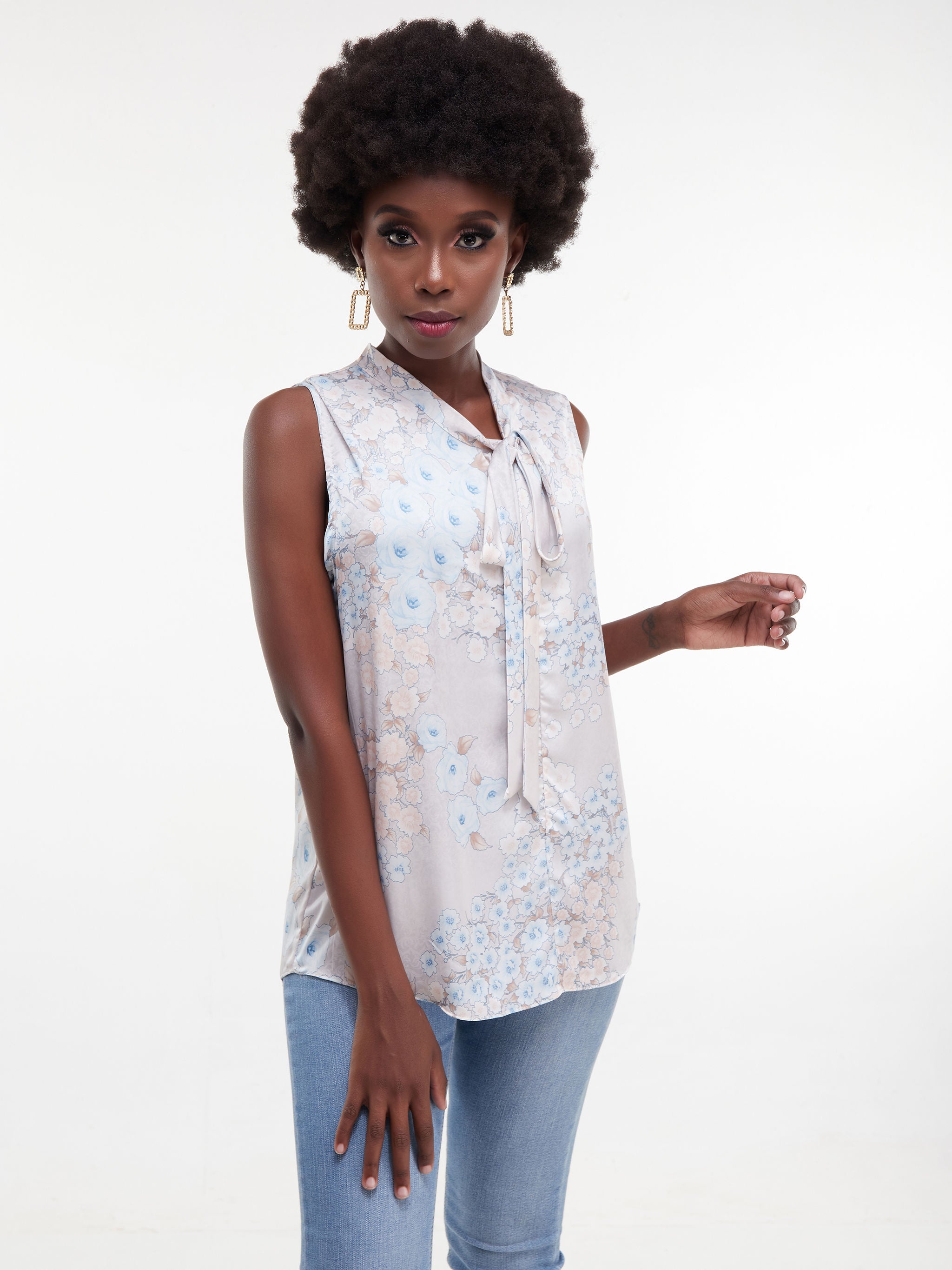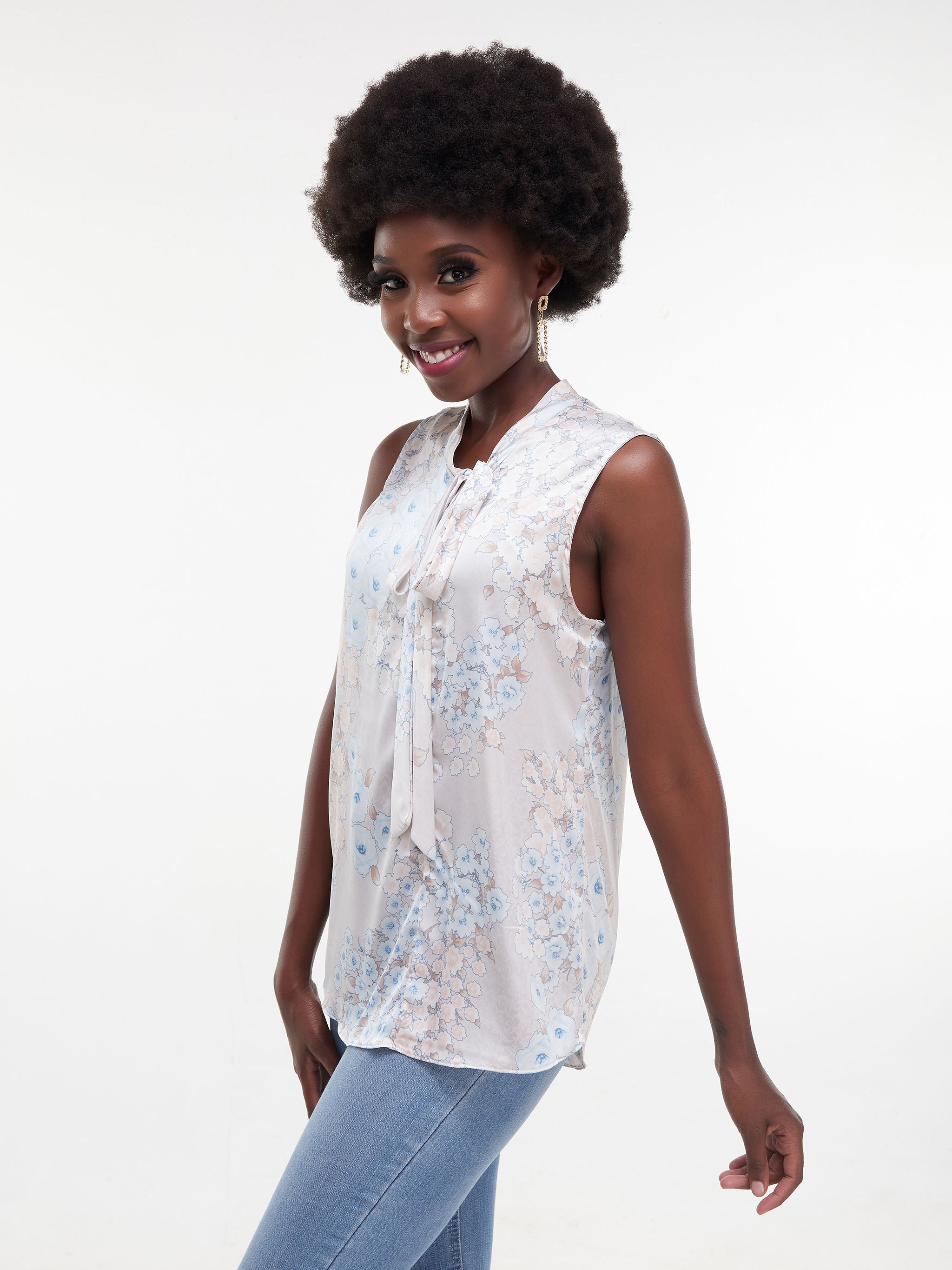 Vivo Bissa Sleeveless Side Bow Top - Beige/Light Blue Print