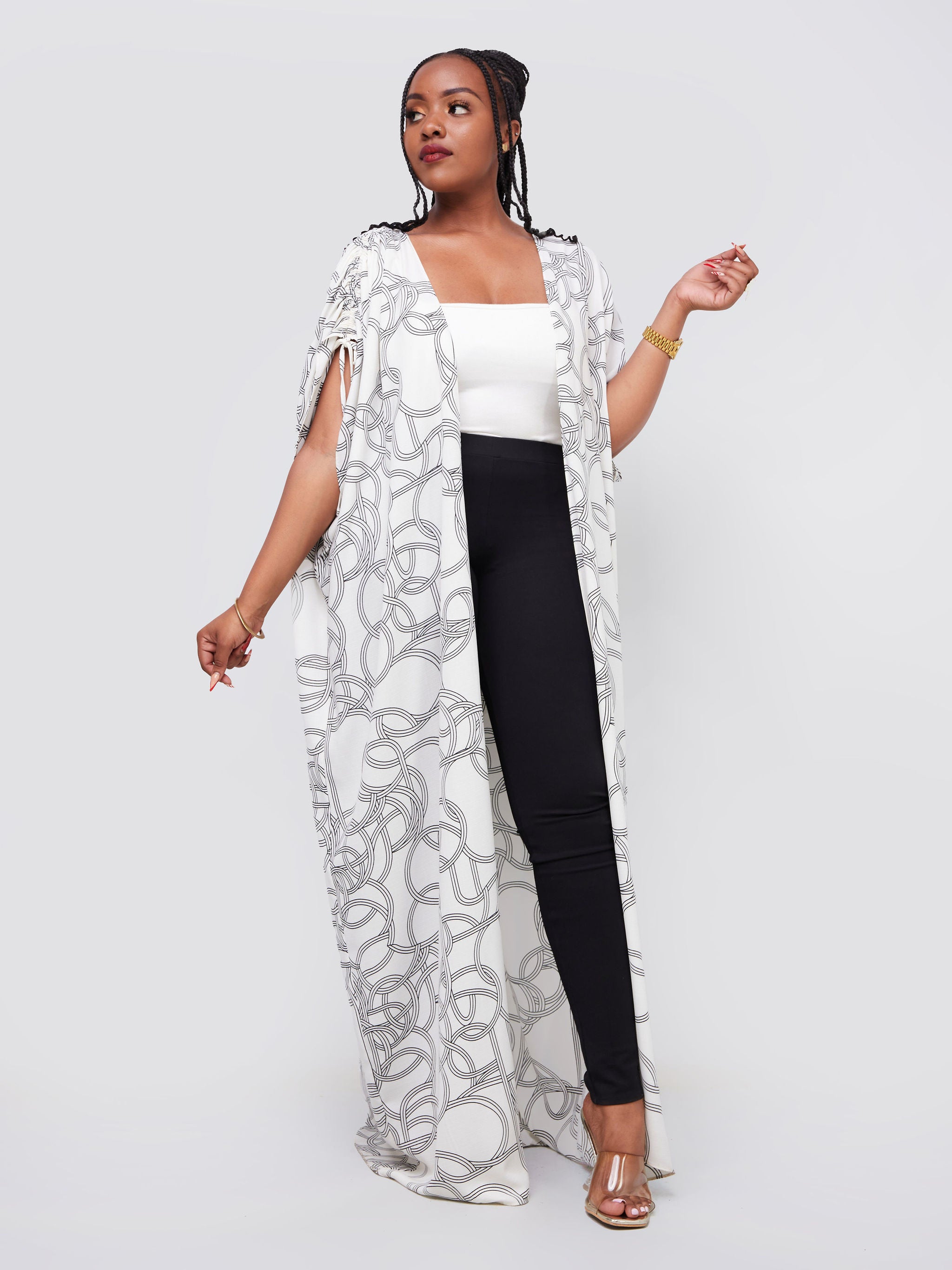 Vivo Dali Drop Shoulder Tie Kimono - White / Black Abstract Print
