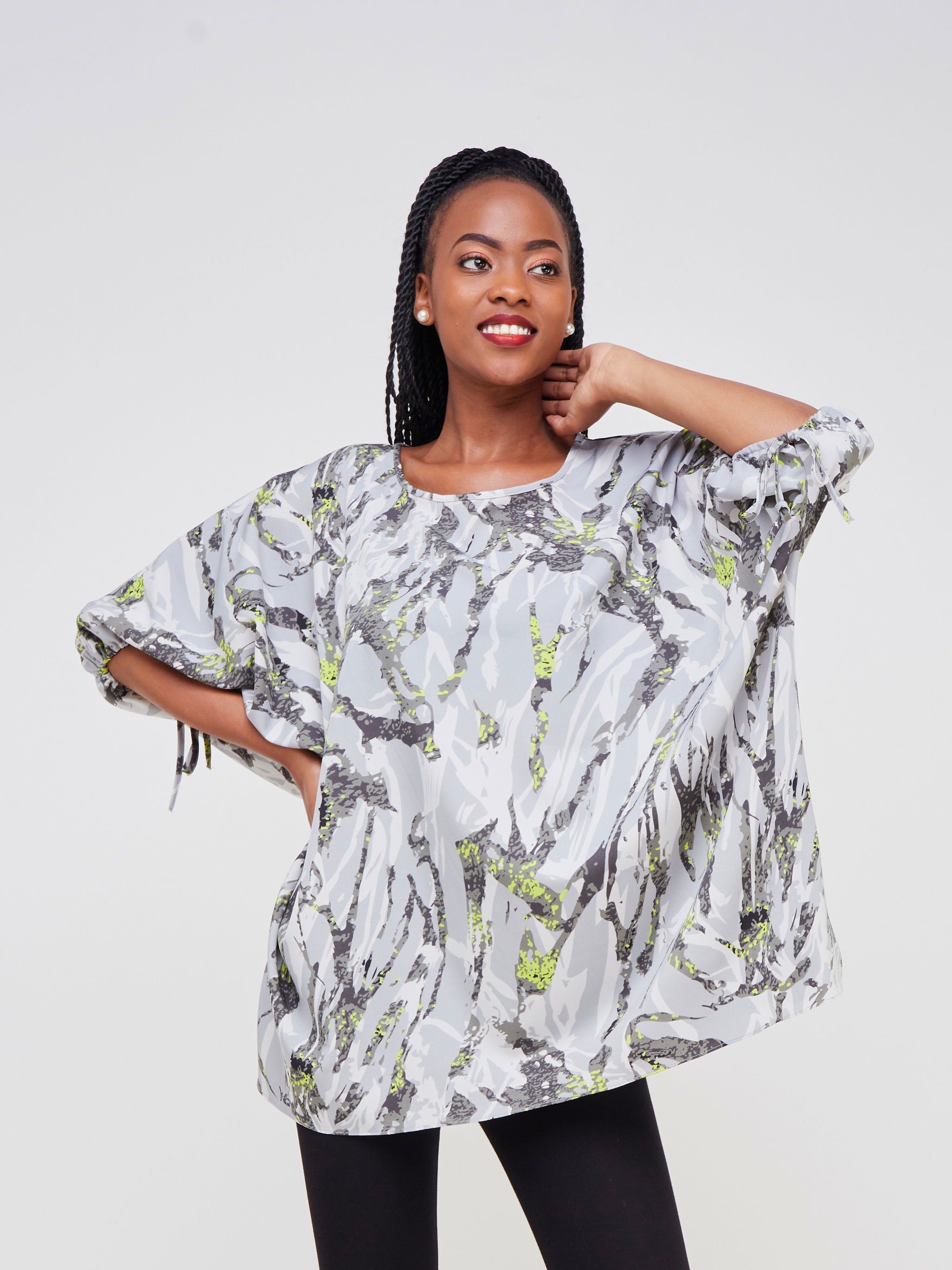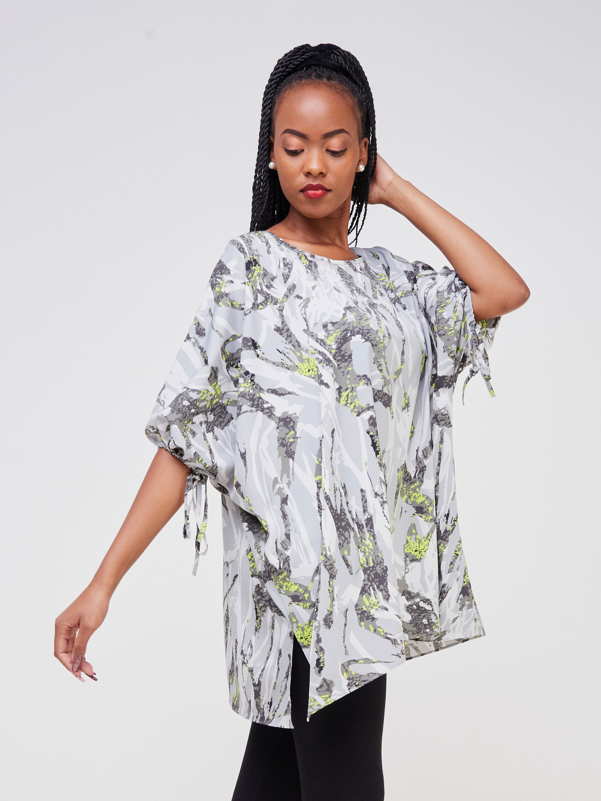 Vivo Dali Drop Shoulder Tie Top - Grey / Lime Green Abstract Print