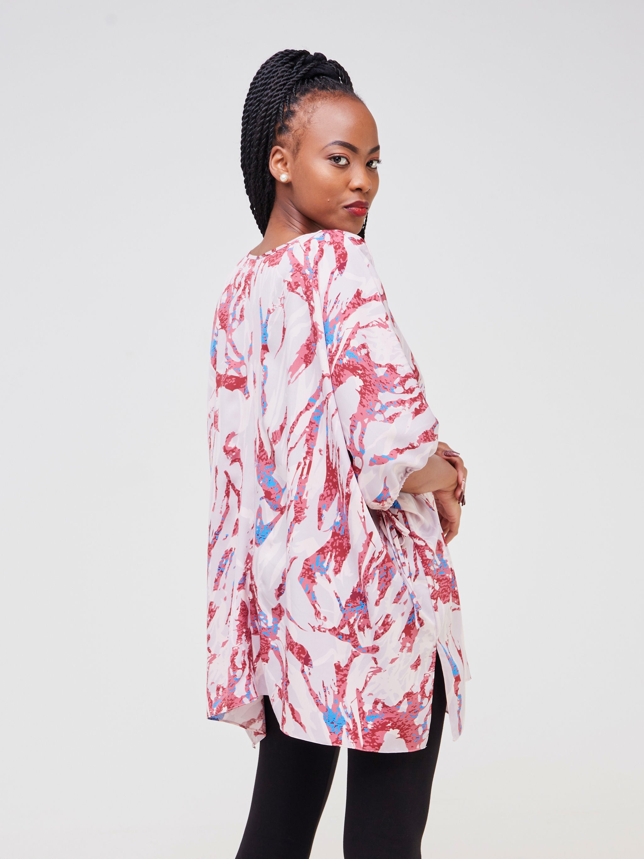 Vivo Dali Drop Shoulder Tie Top - Burgundy / Blue Abstract Print