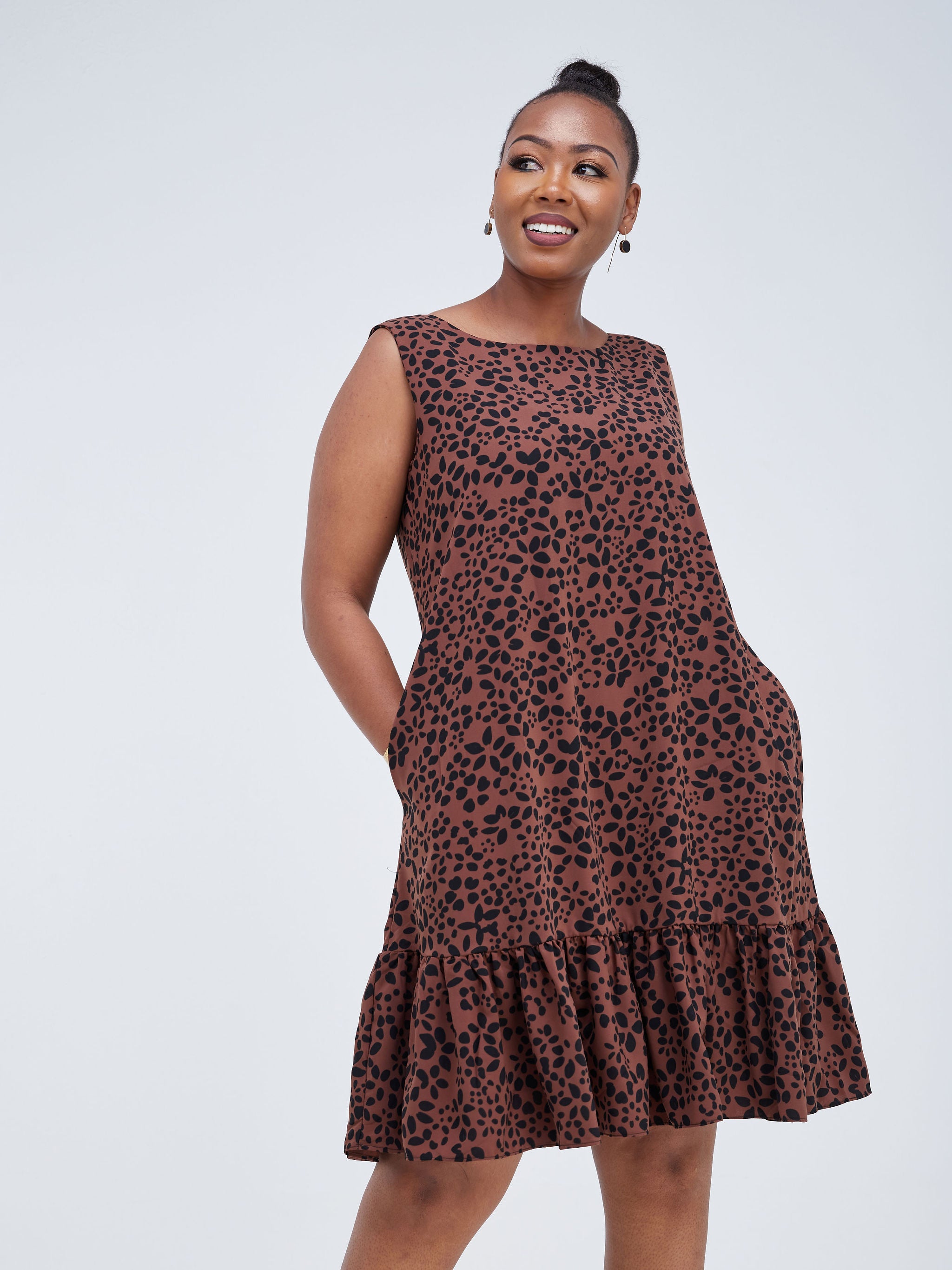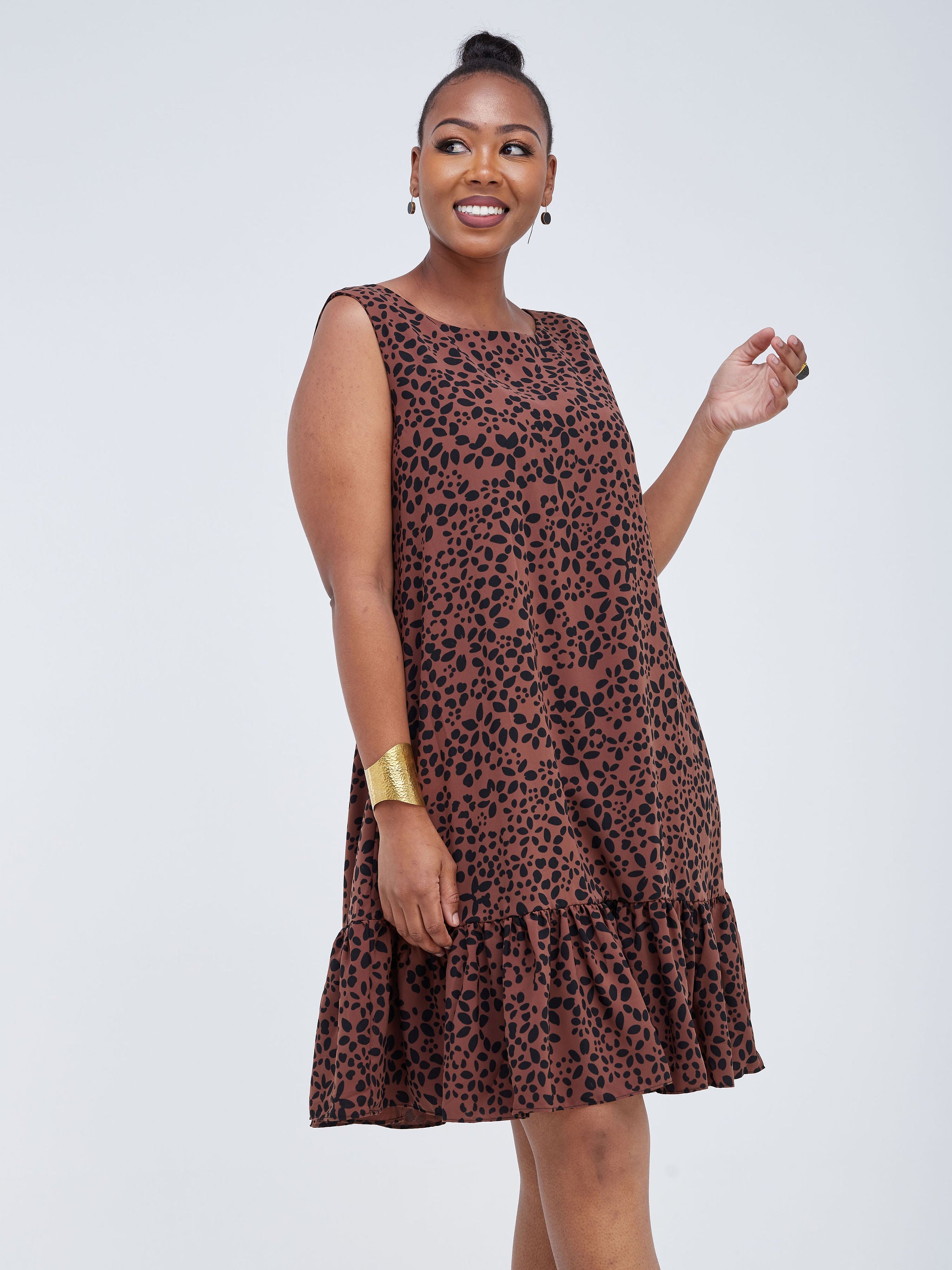 Vivo Dalia Sleeveless Gathered Tent Dress - Brown / Black Print