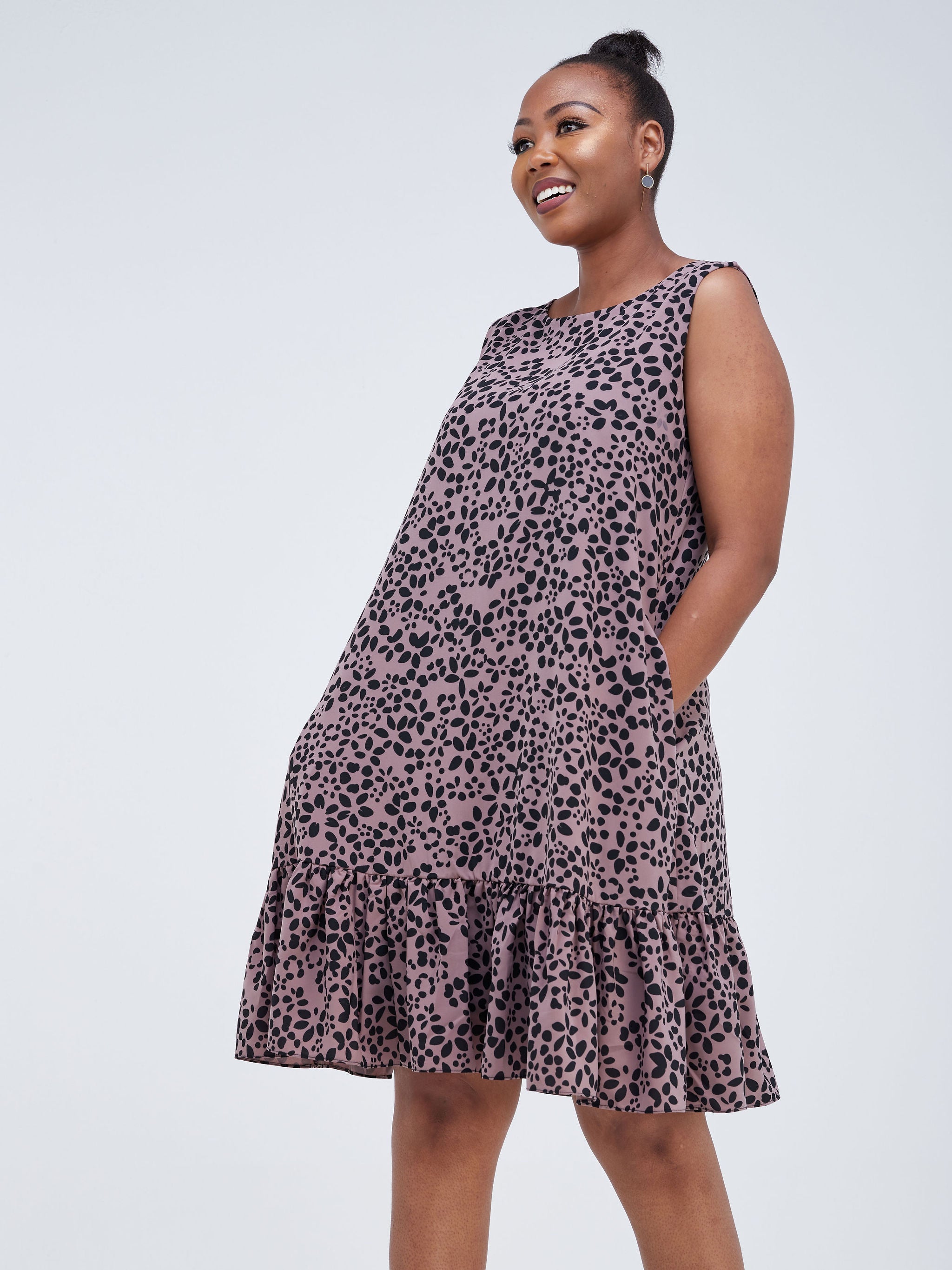 Vivo Dalia Sleeveless Gathered Tent Dress - Light Brown Floral print