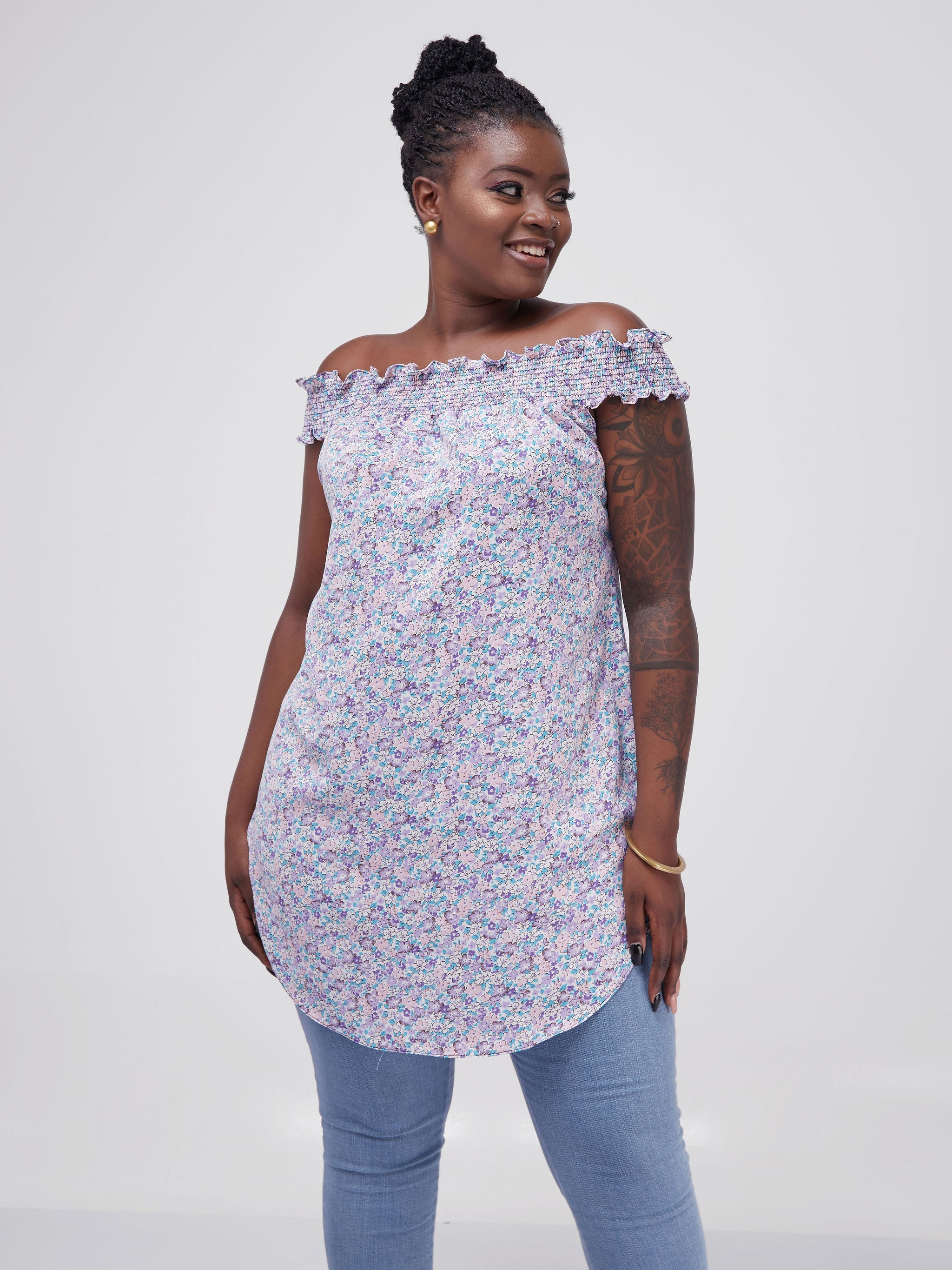 Vivo Alek Off-Shoulder Scalloped Hem Top - Purple / Black Houndstooth Print