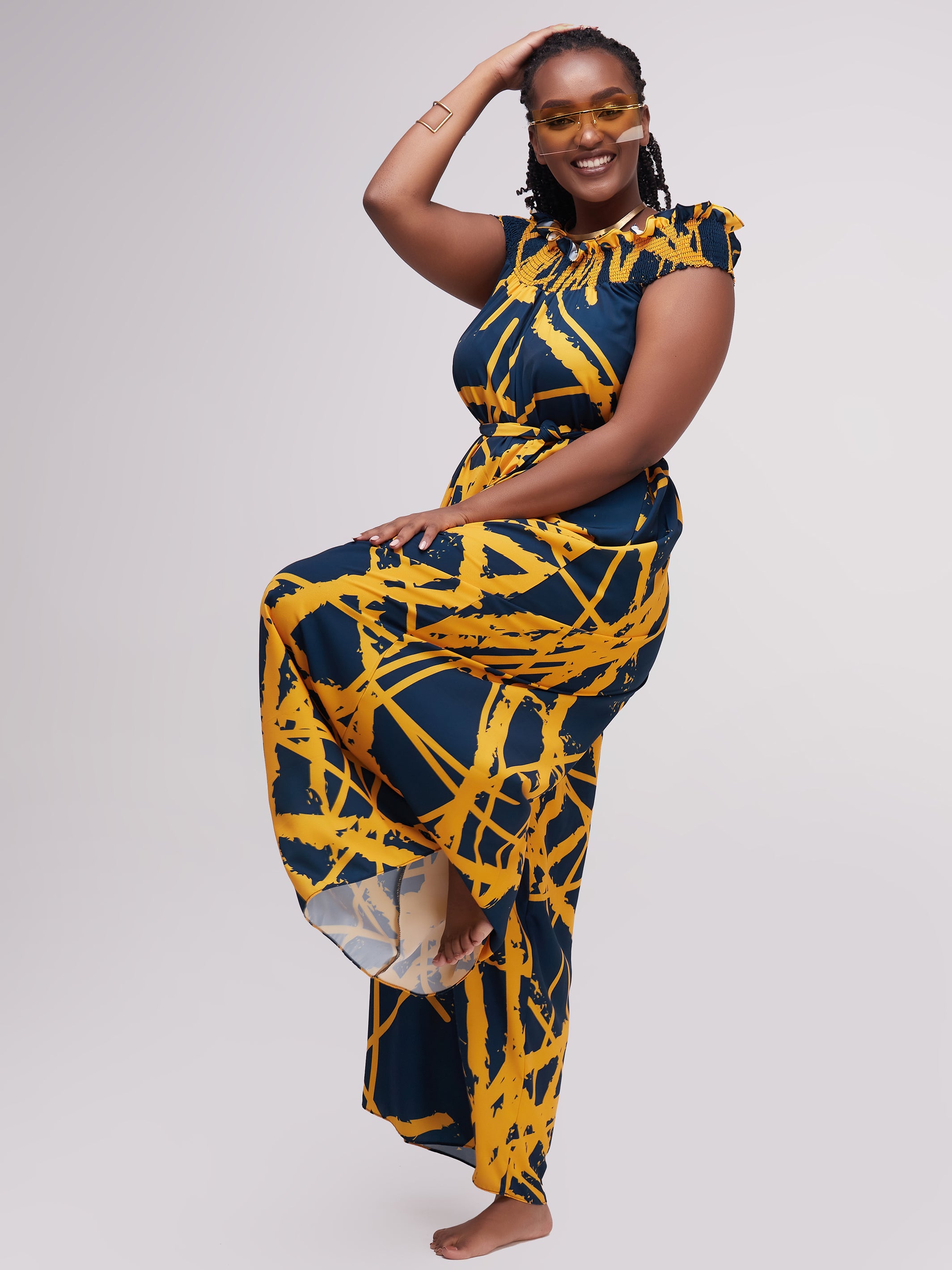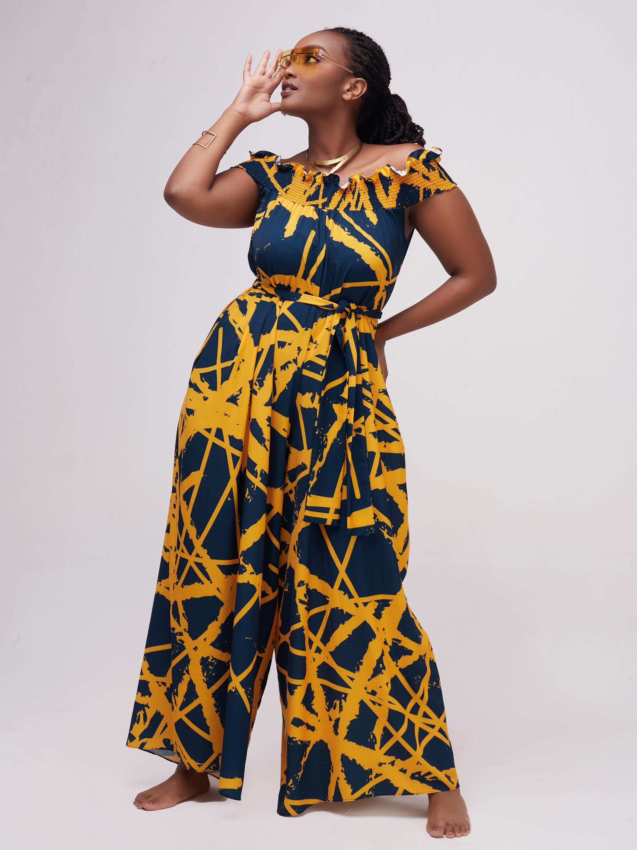 Vivo Alek Shirred Off- Shoulder Jumpsuit - Mustard / Teal Print