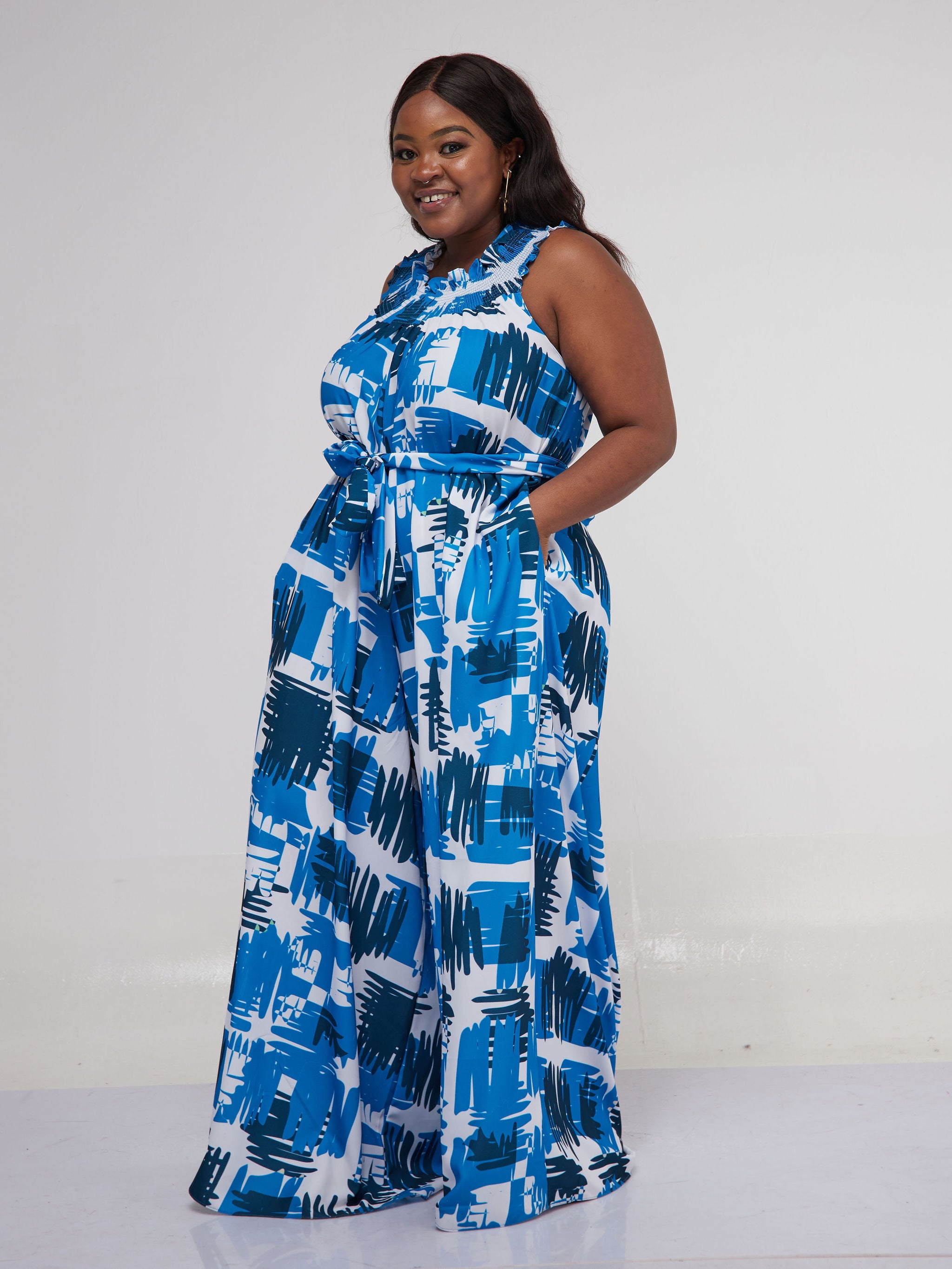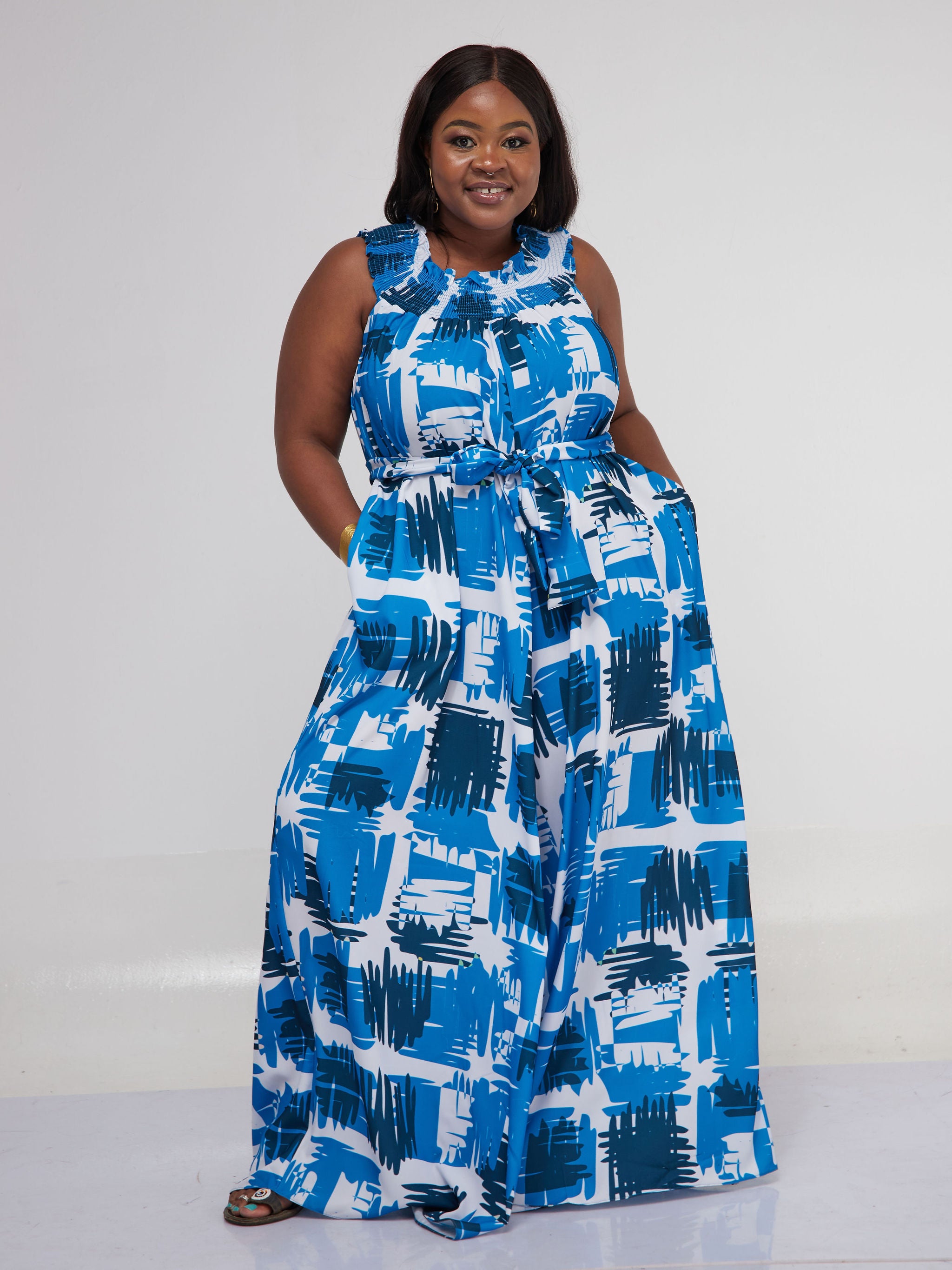 Vivo Alek Shirred Off- Shoulder Jumpsuit - Blue / White Print