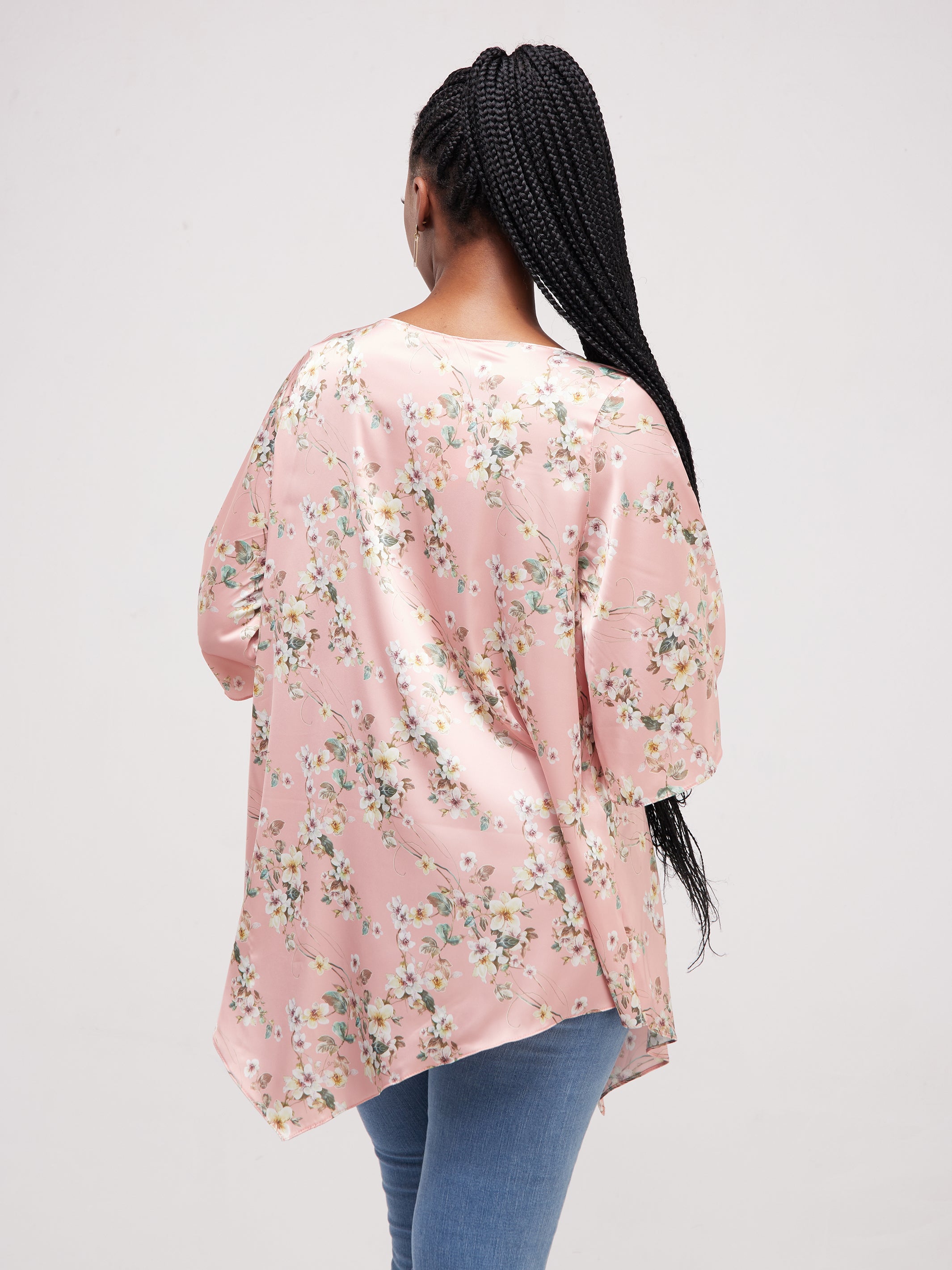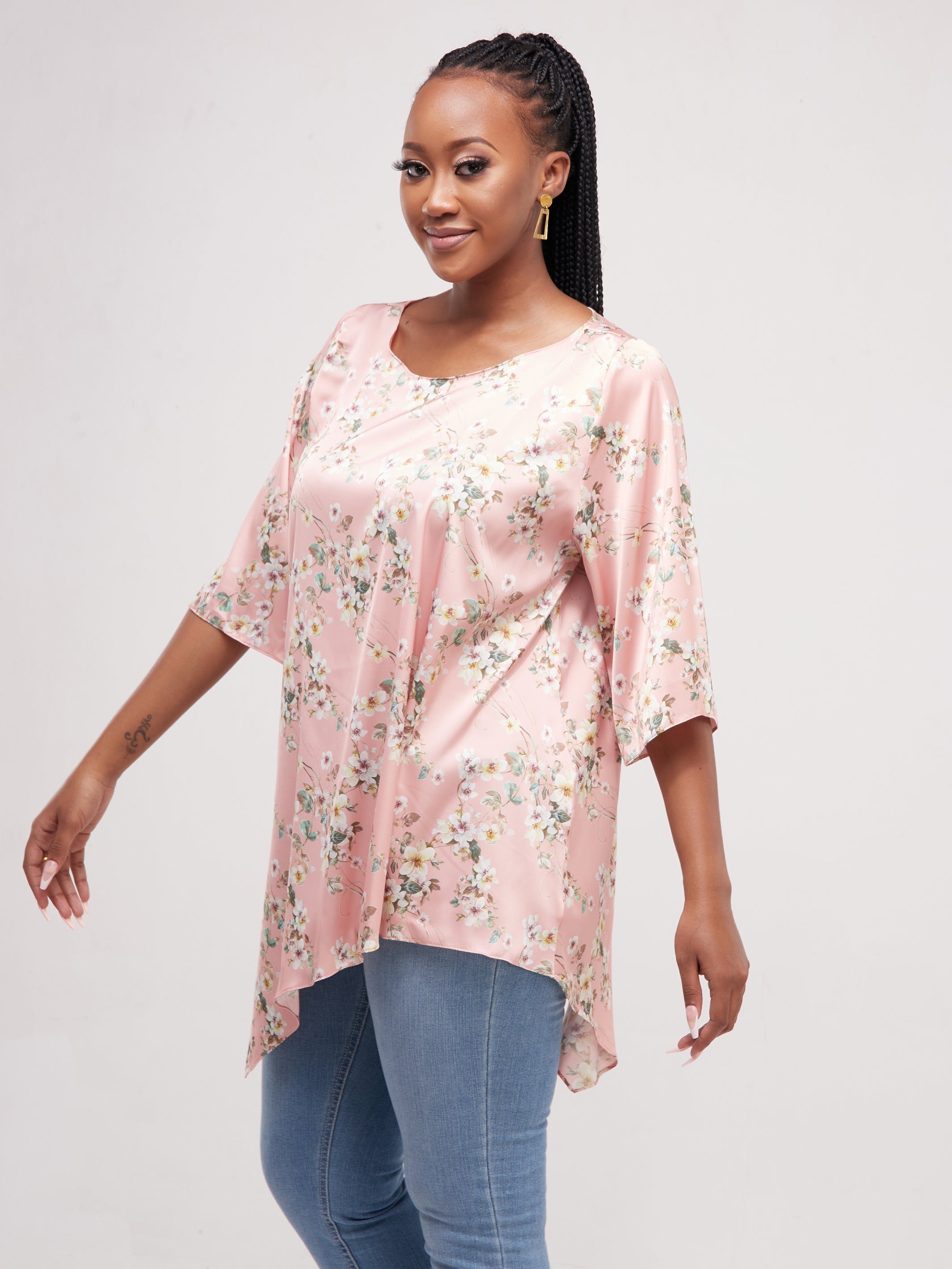 Vivo Asymmetric Angel Satin Top - Pink / Orange Floral Print