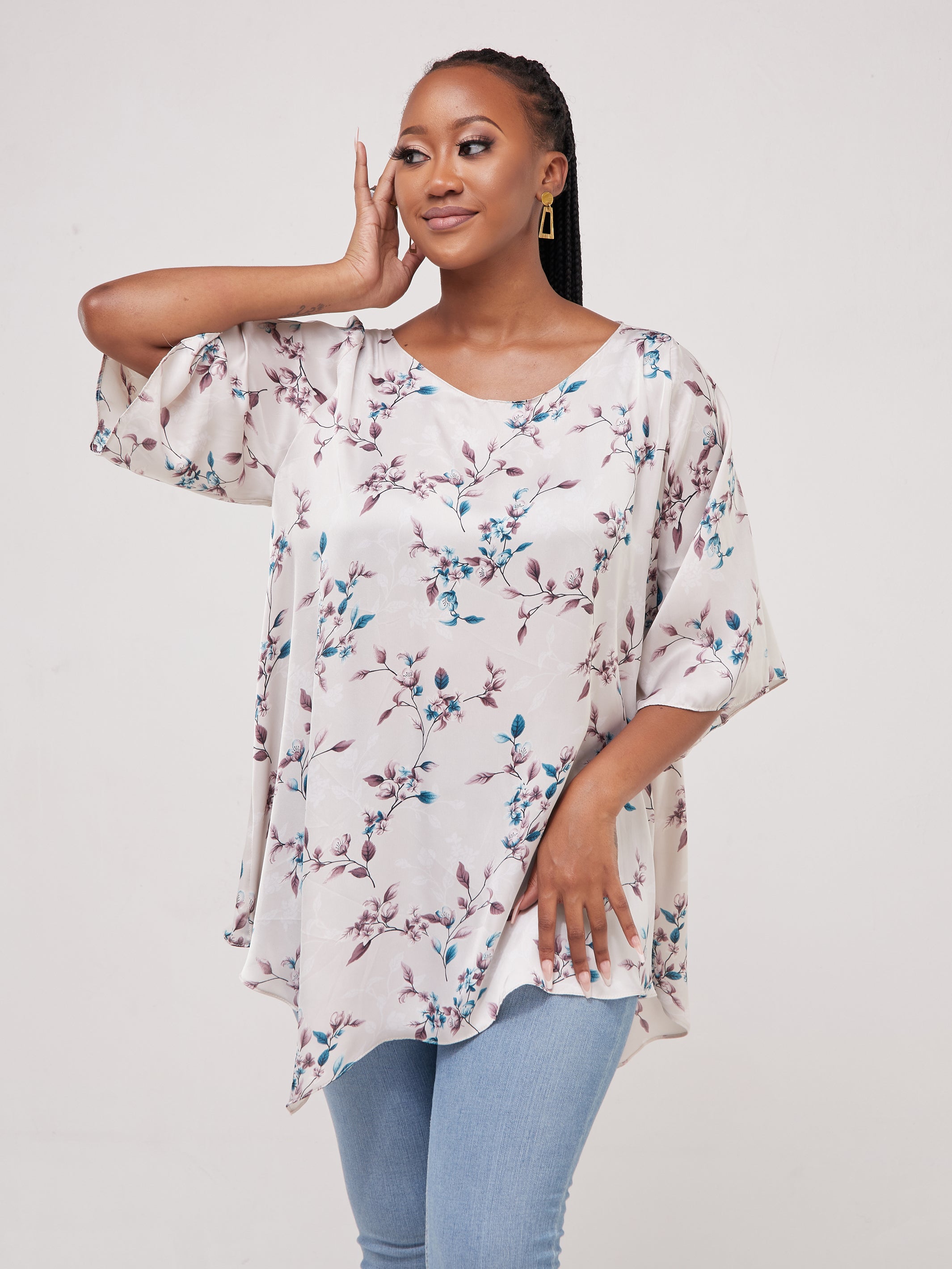 Vivo Asymmetric Angel Satin Top - Purple Floral Print