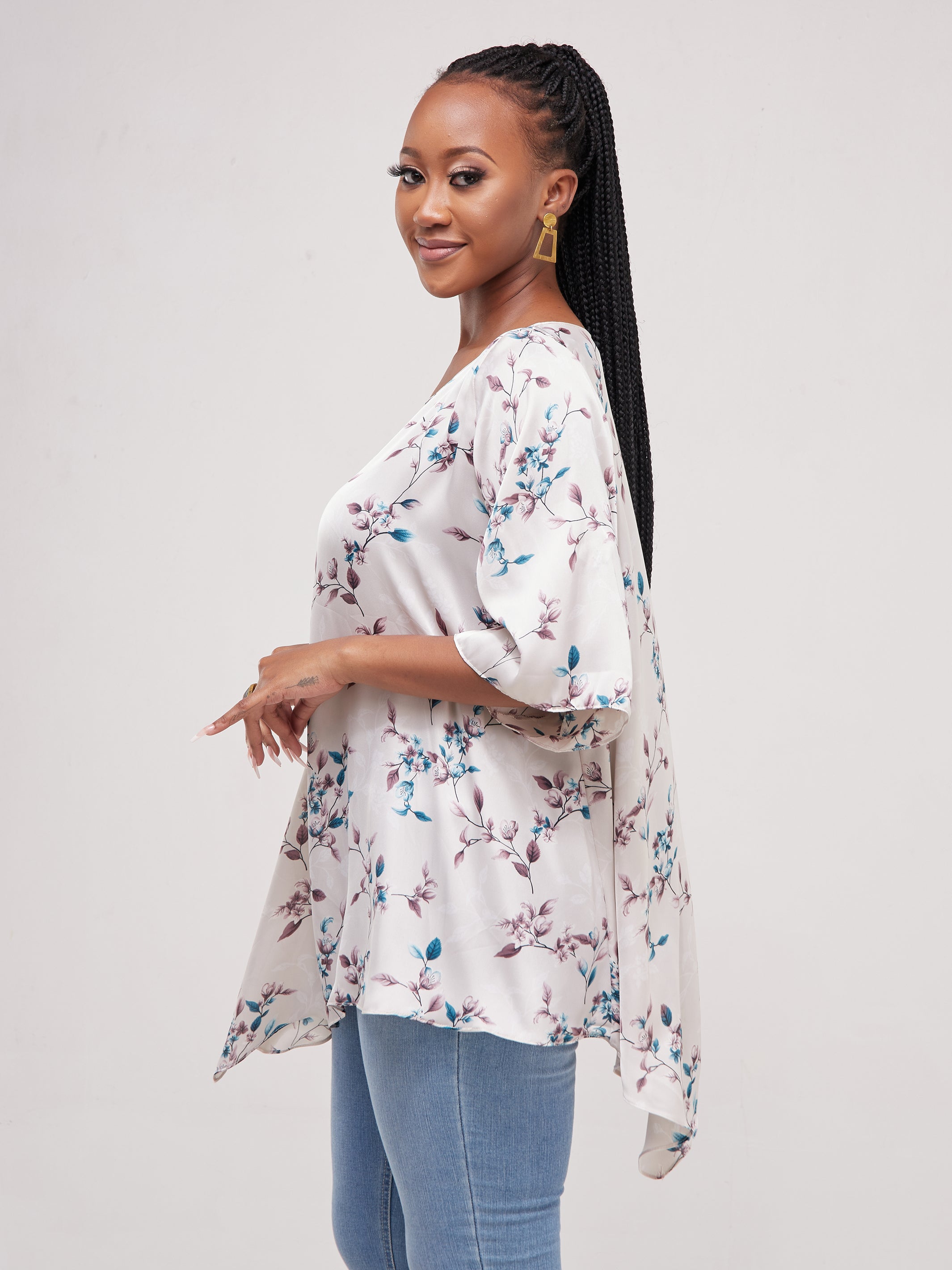 Vivo Asymmetric Angel Satin Top - Off White / Purple Print
