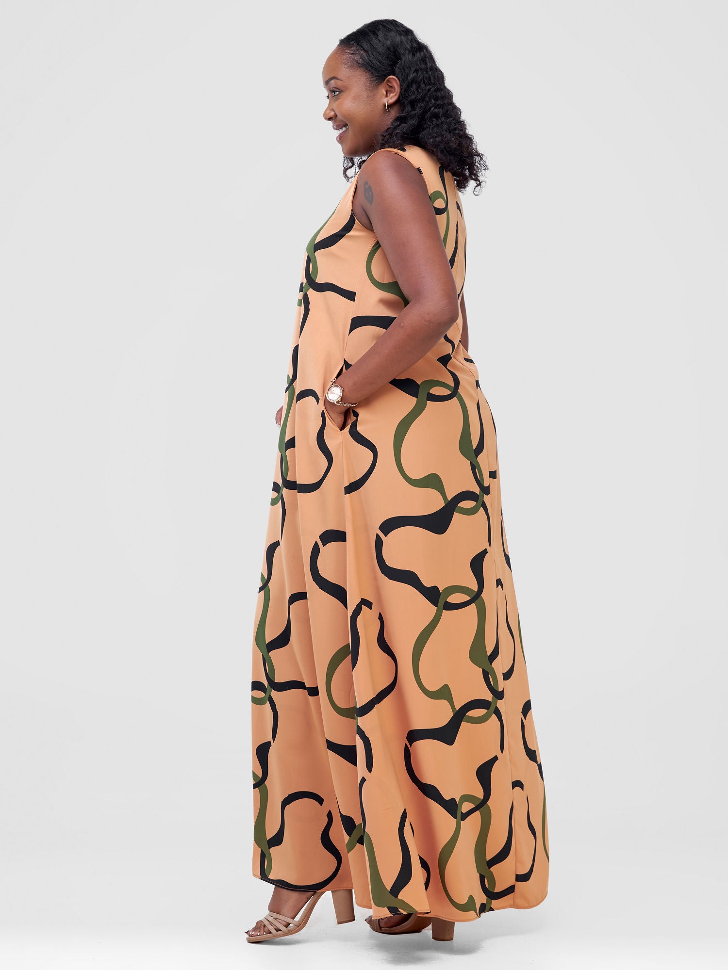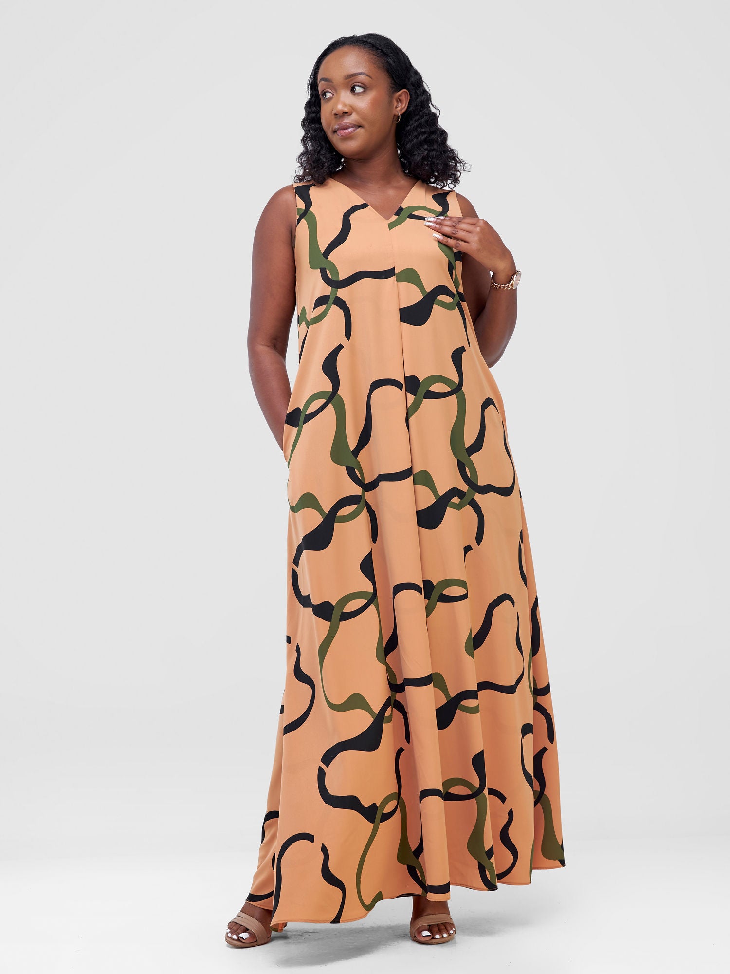 Vivo Ava Front Pleat Maxi Dress - Beaver / Black Samba Print