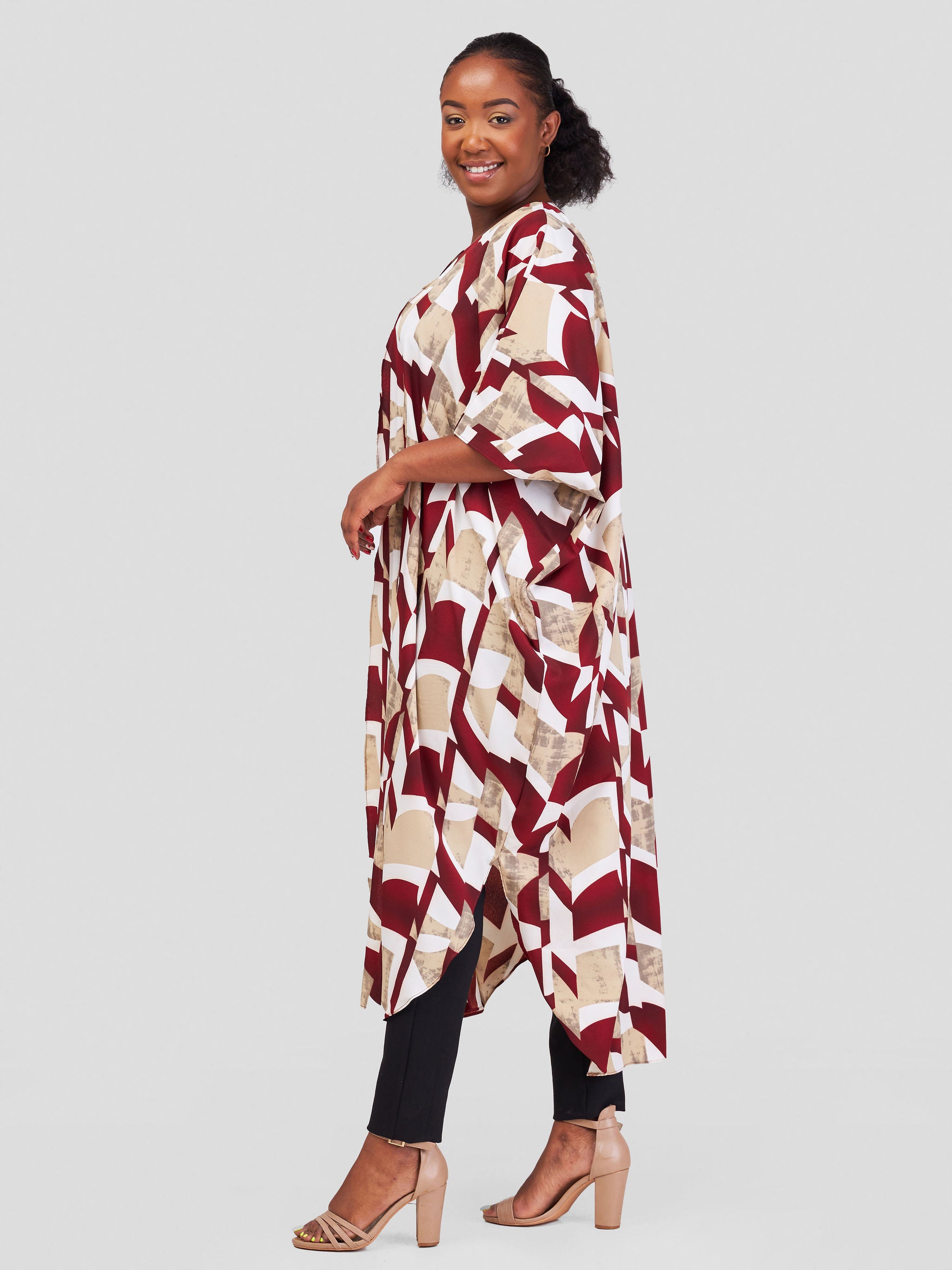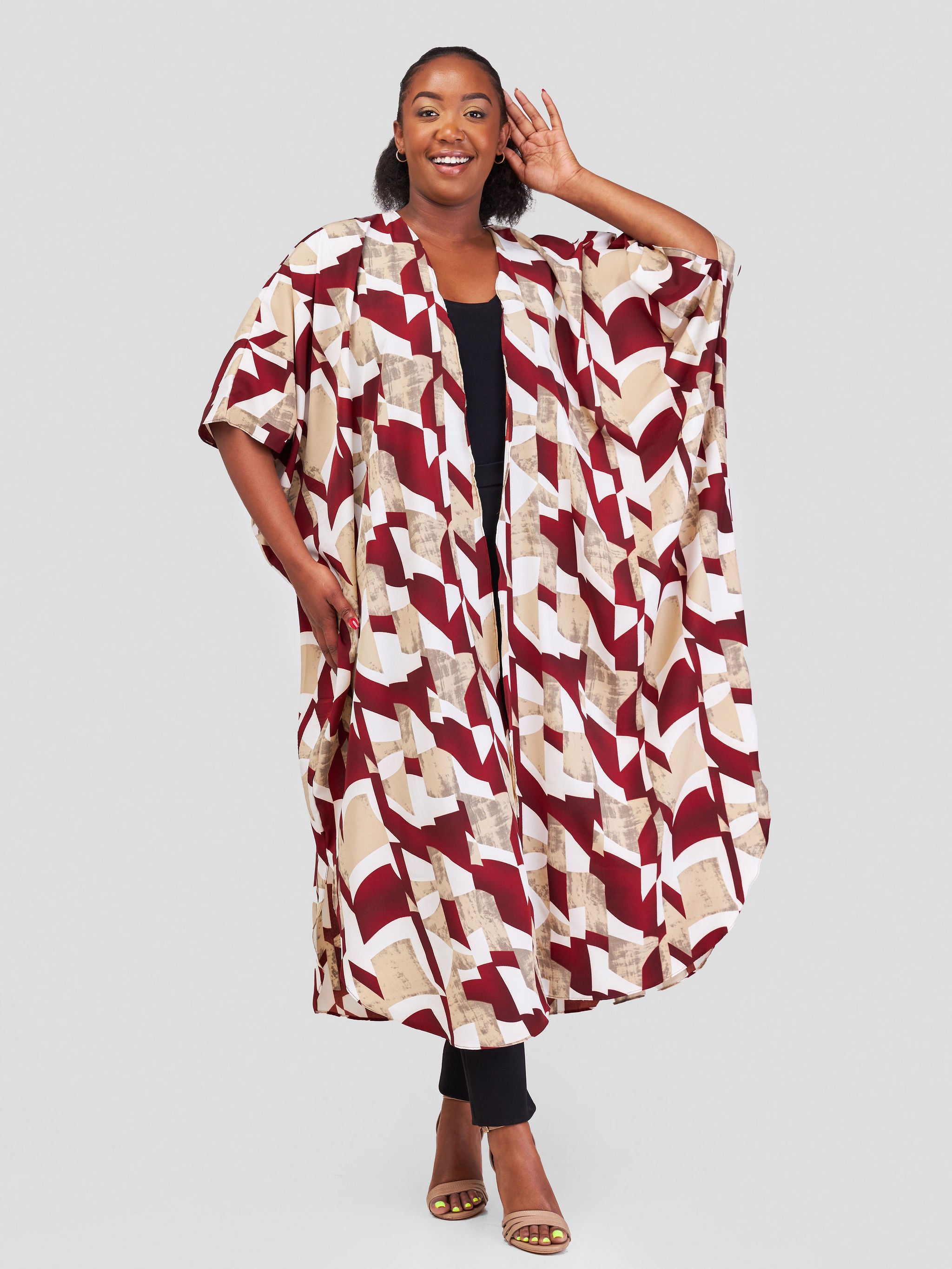Vivo Malindi Maxi Kimono - Taupe / Burgundy Abstract Print
