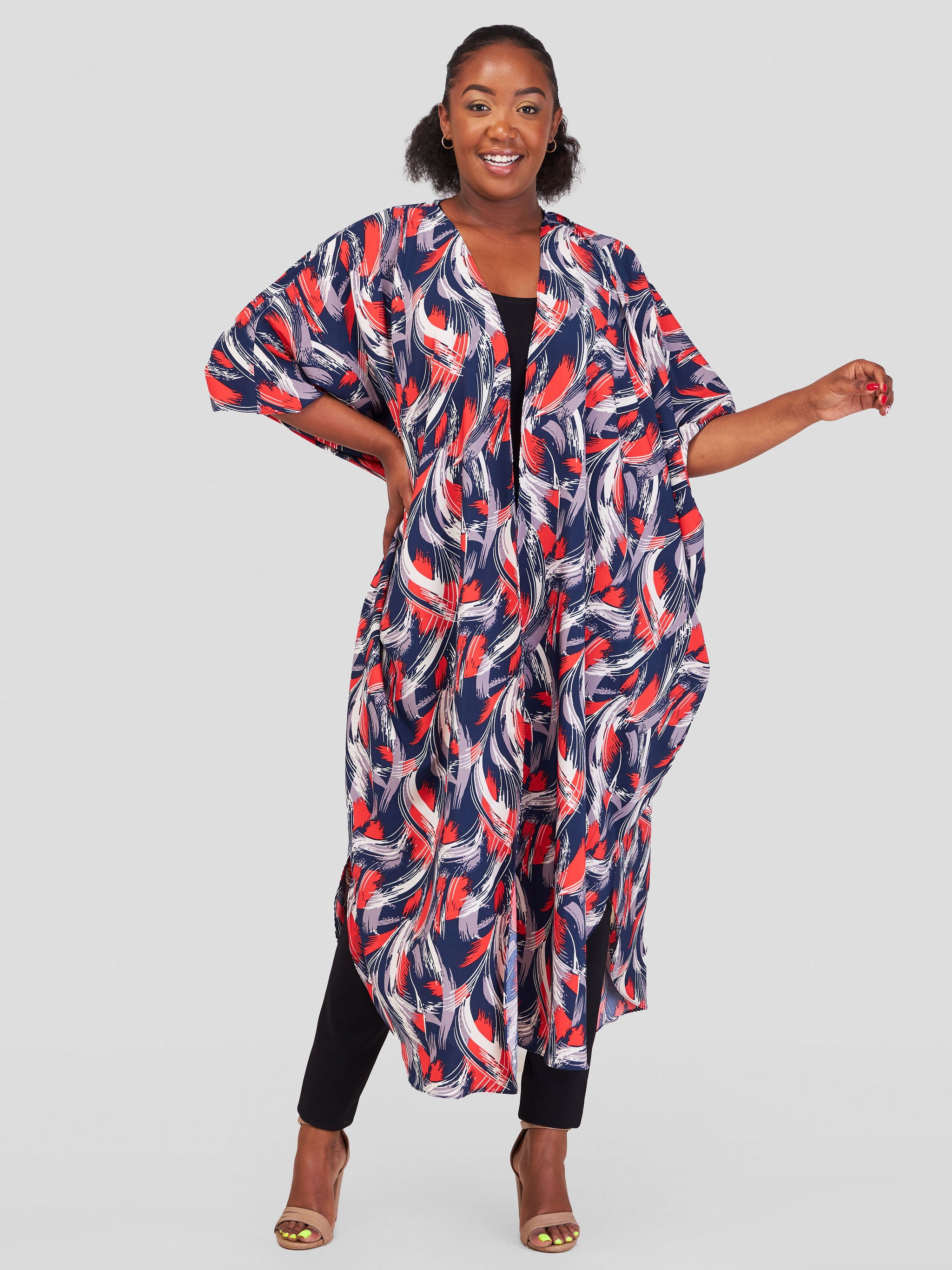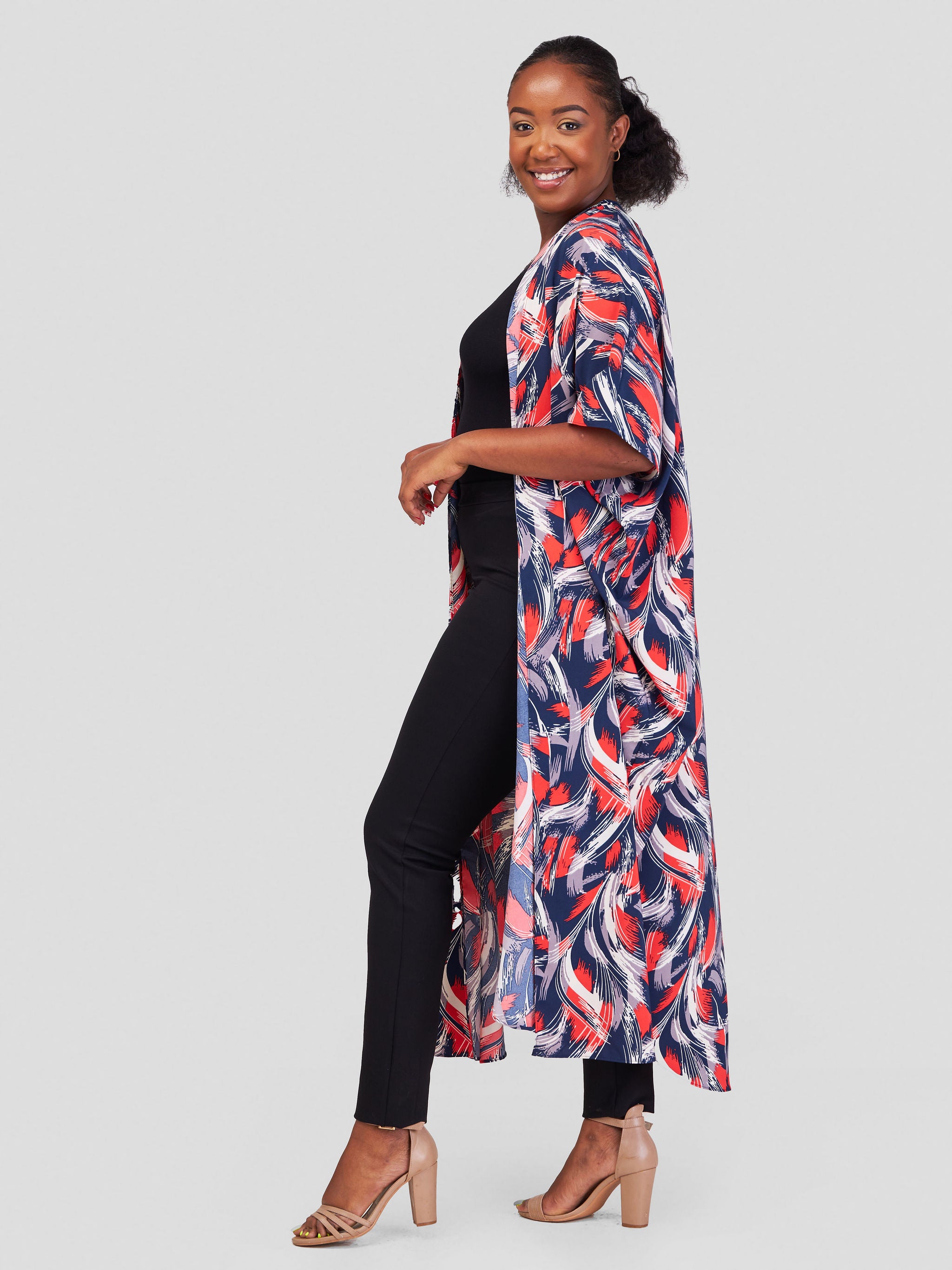 Vivo Malindi Maxi Kimono - Navy Blue / Red Abstract Print