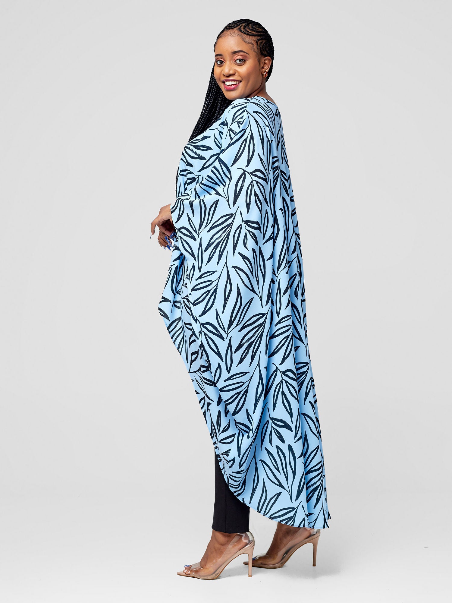 Vivo Malindi V-Neck High Low Kaftan Top - Light Blue / Black Kasai Print