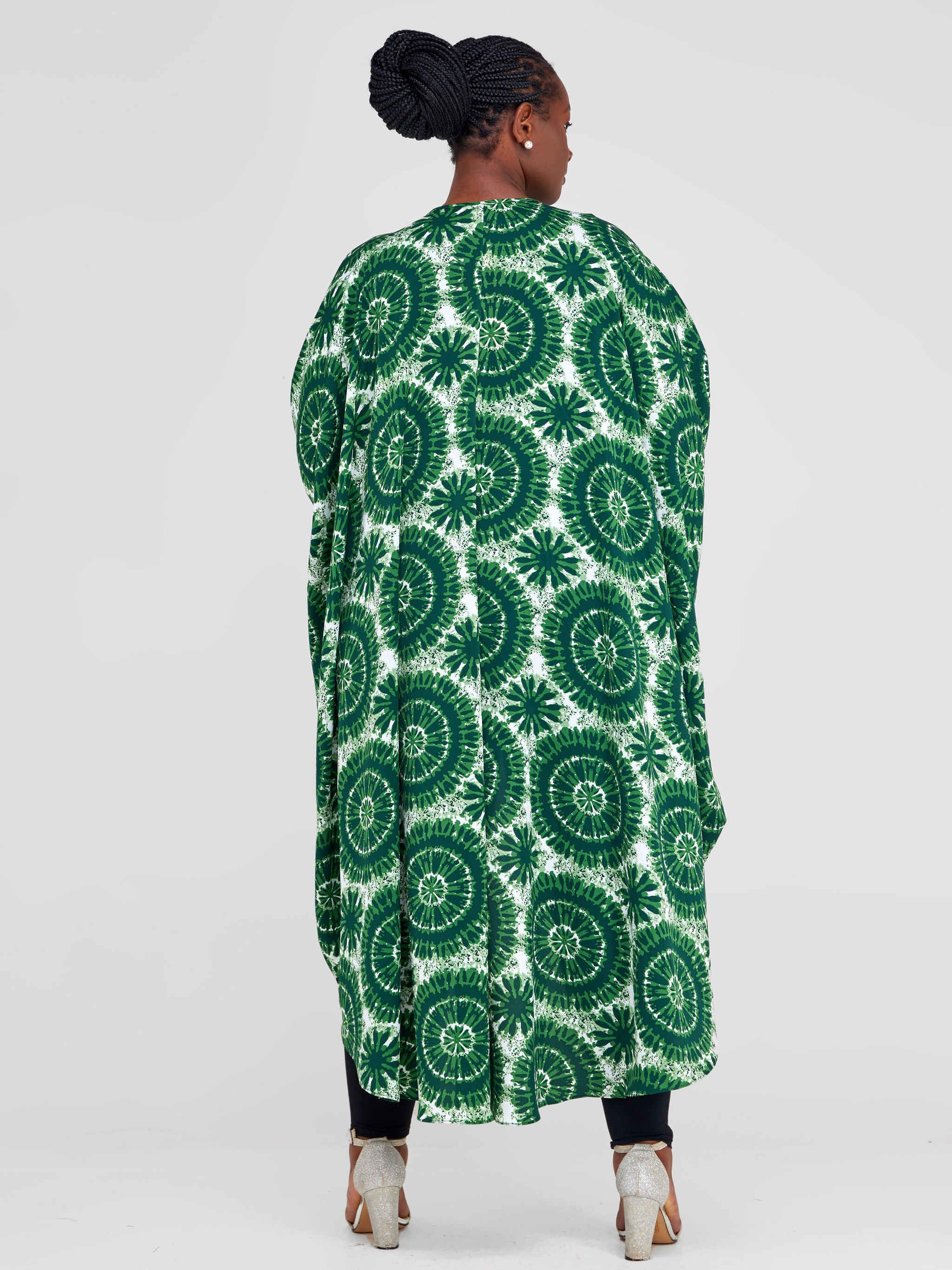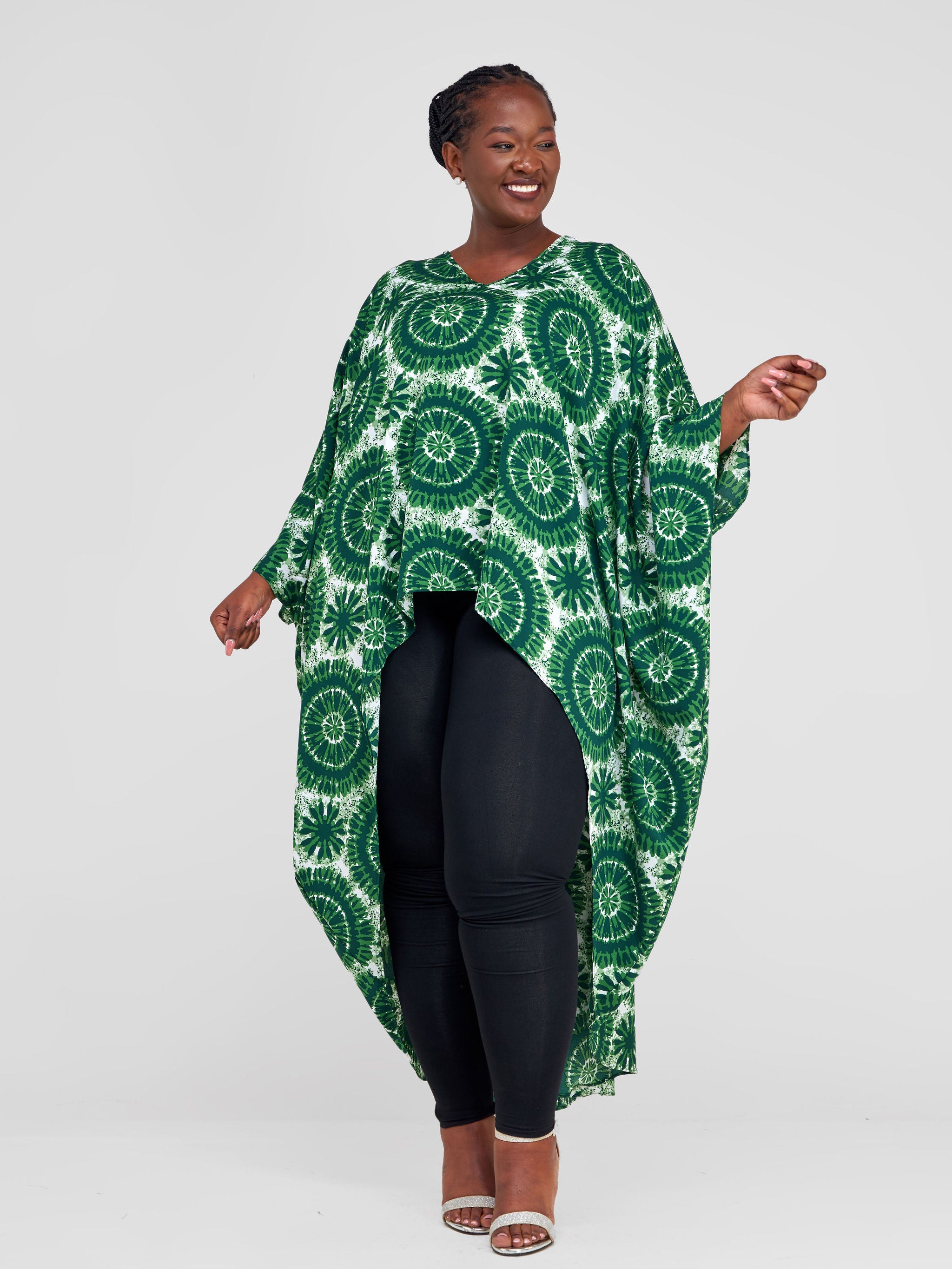 Vivo Malindi V-Neck High Low Kaftan Top - White / Green Abstract Print