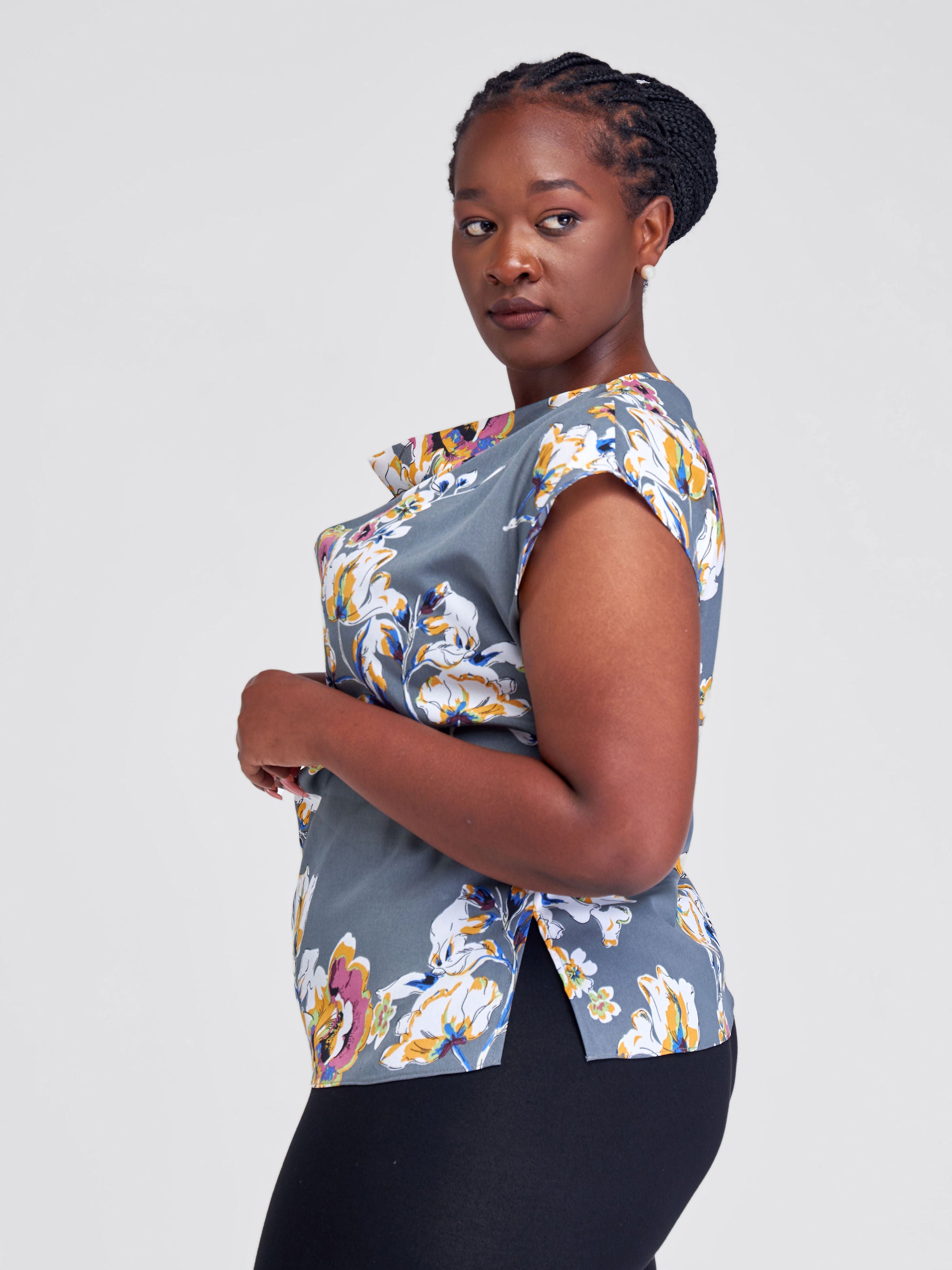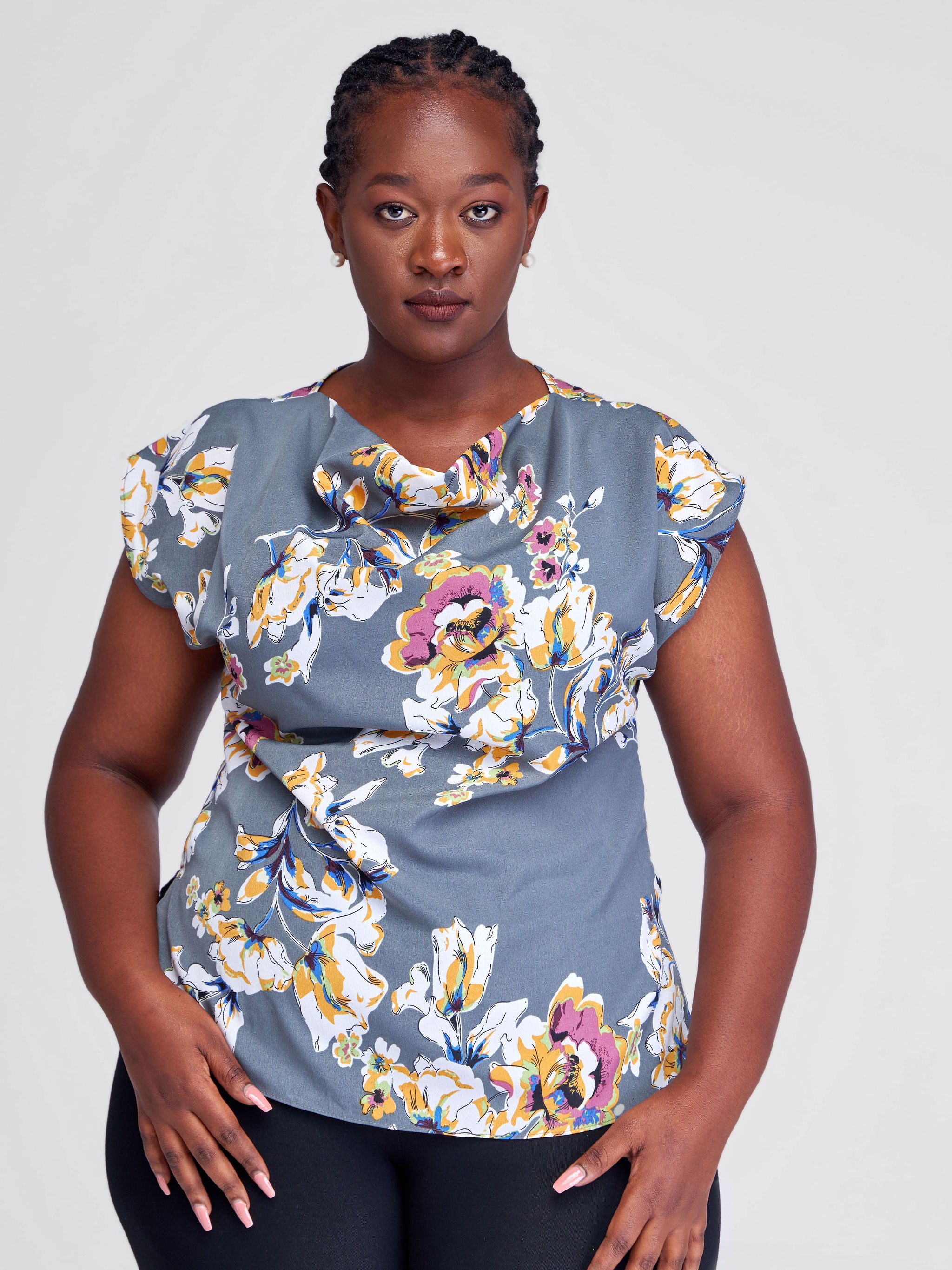 Vivo Fahari Drop Shoulder Cowl Top - Grey / Mustard Floral Print