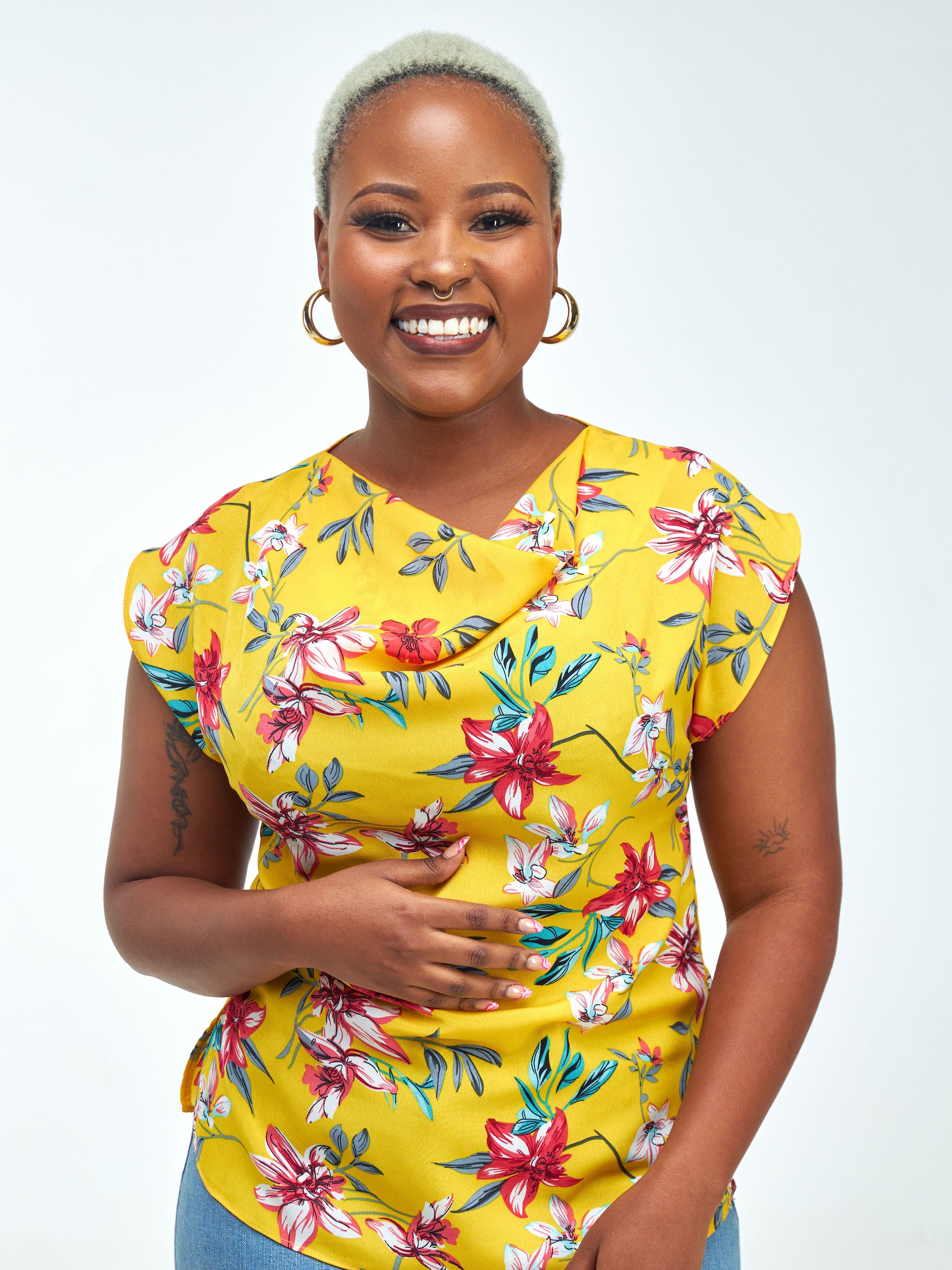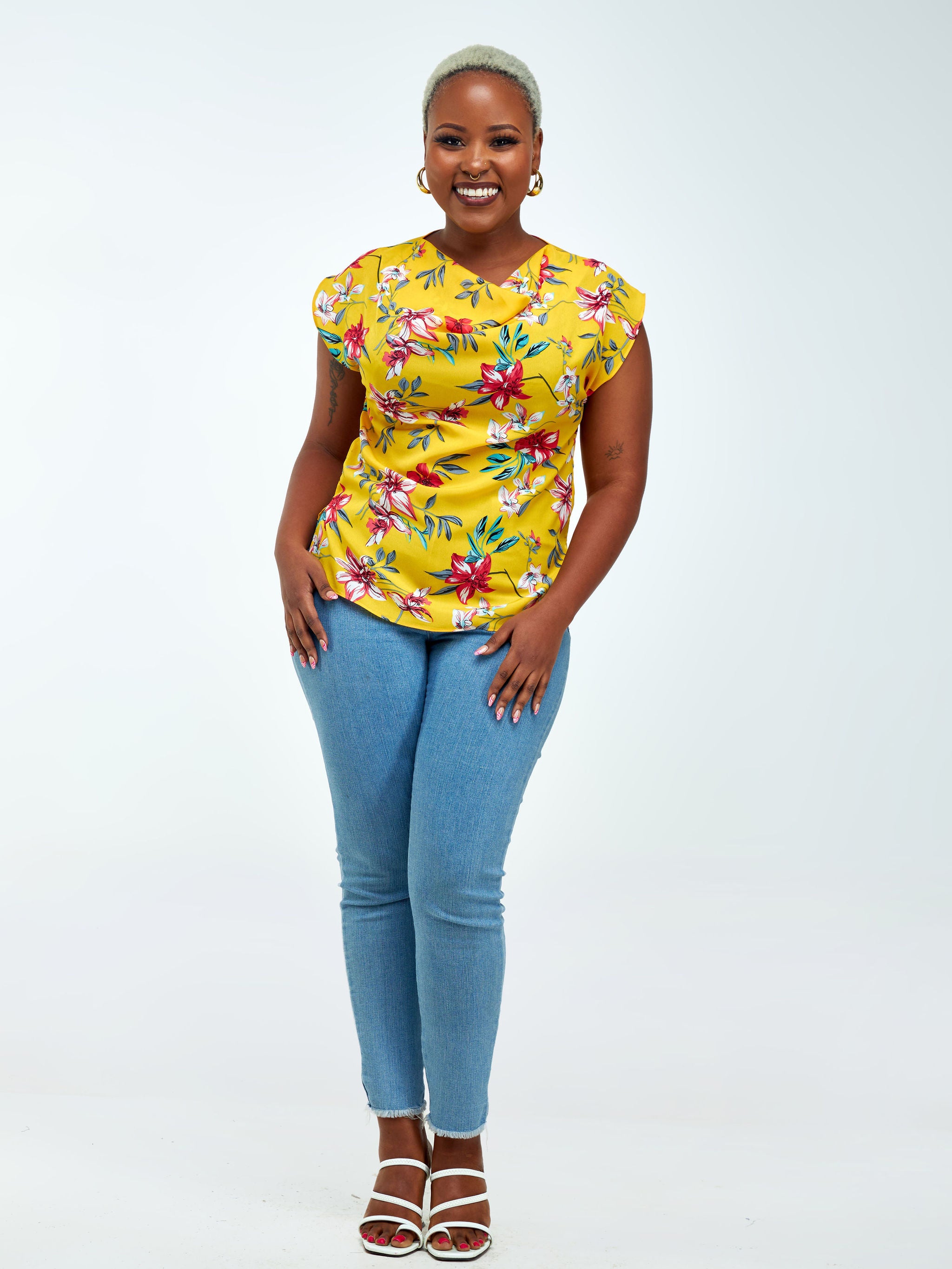 Vivo Fahari Drop Shoulder Cowl Top - Yellow / Pink Floral Print