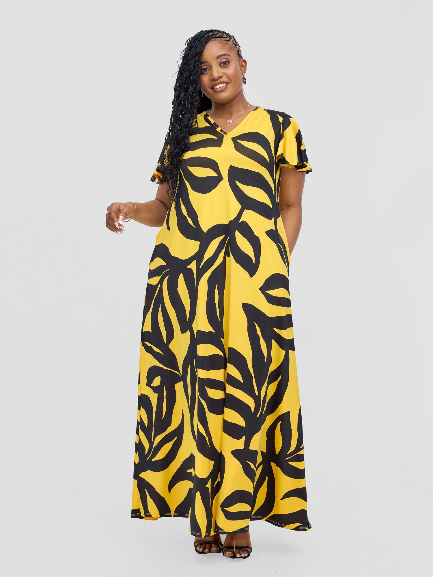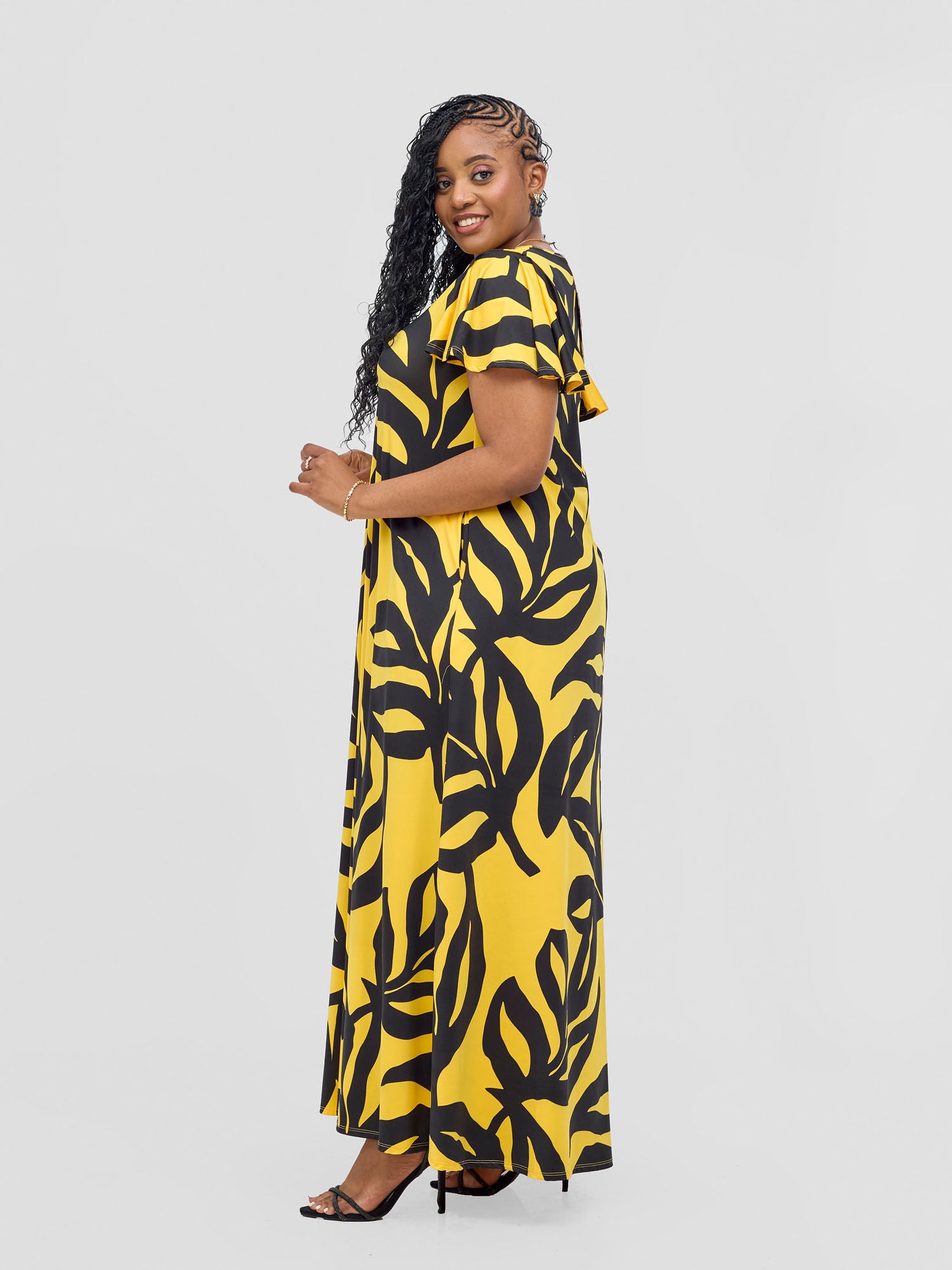 Vivo Ruwa Flounce Sleeve Tent Maxi Dress - Mustard / Black Sese Print