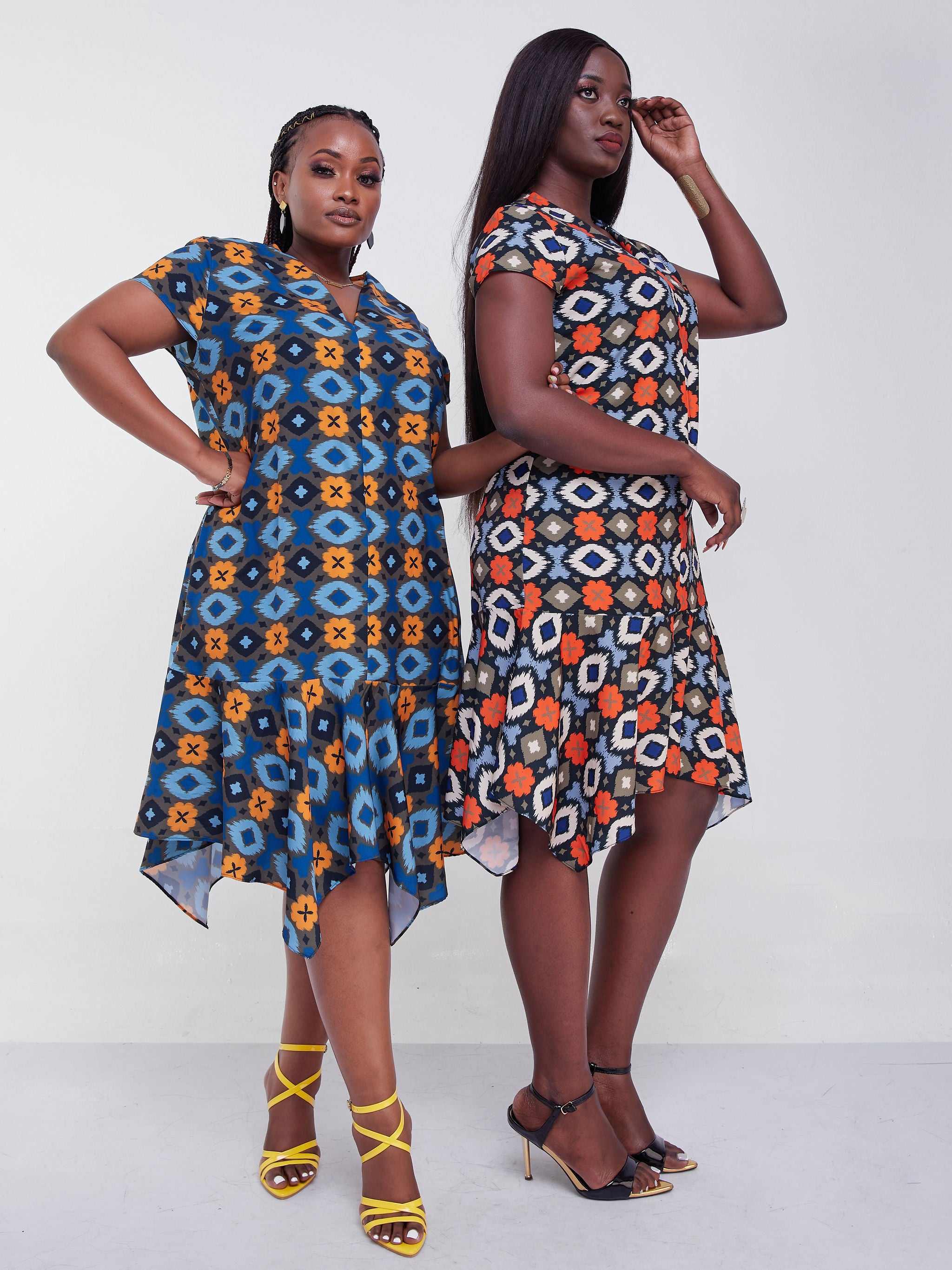 Vivo Jasiri Cap Sleeve V-Neck Handkerchief Drape Flounce Shift Dress -Light Blue Print