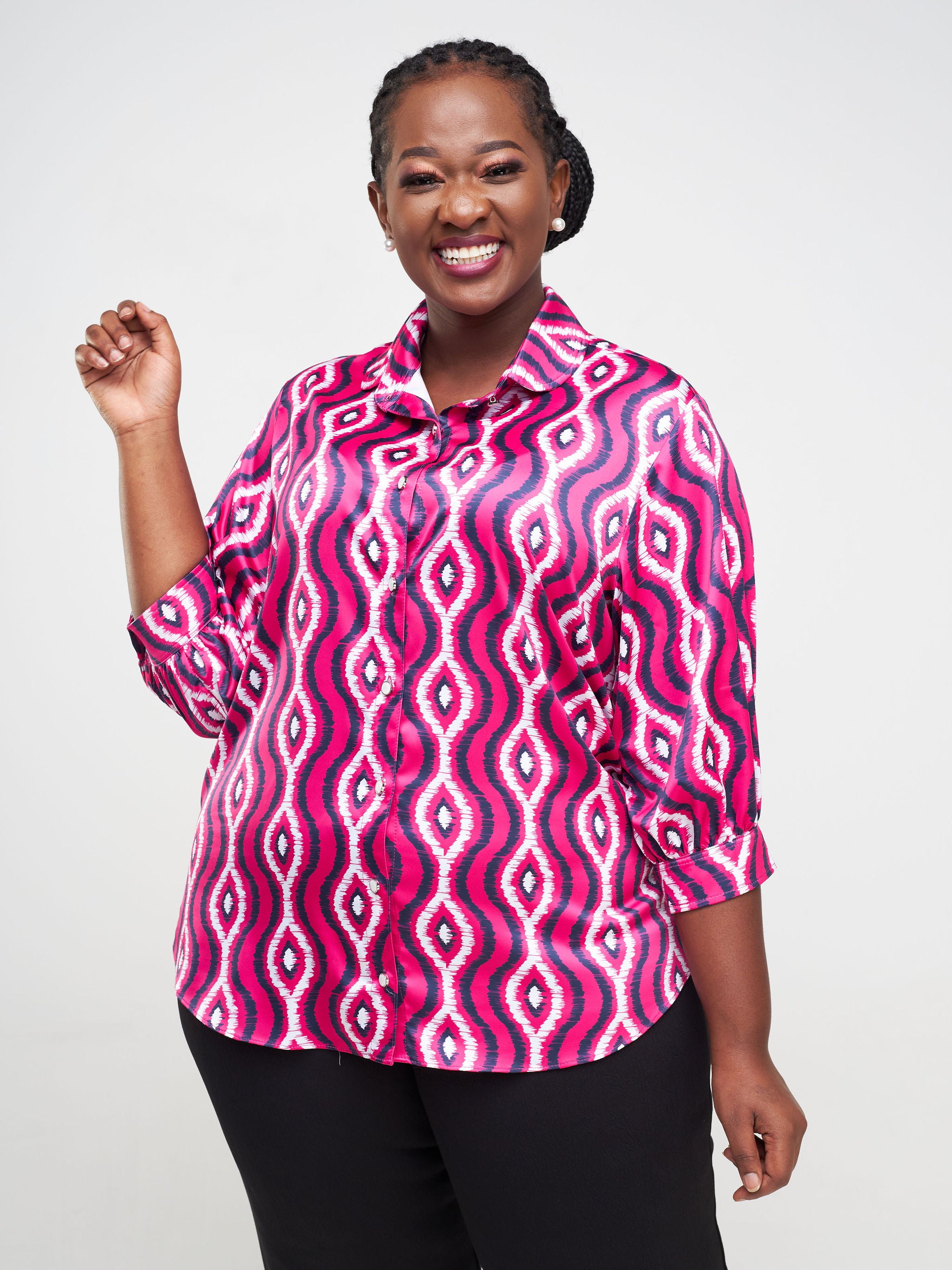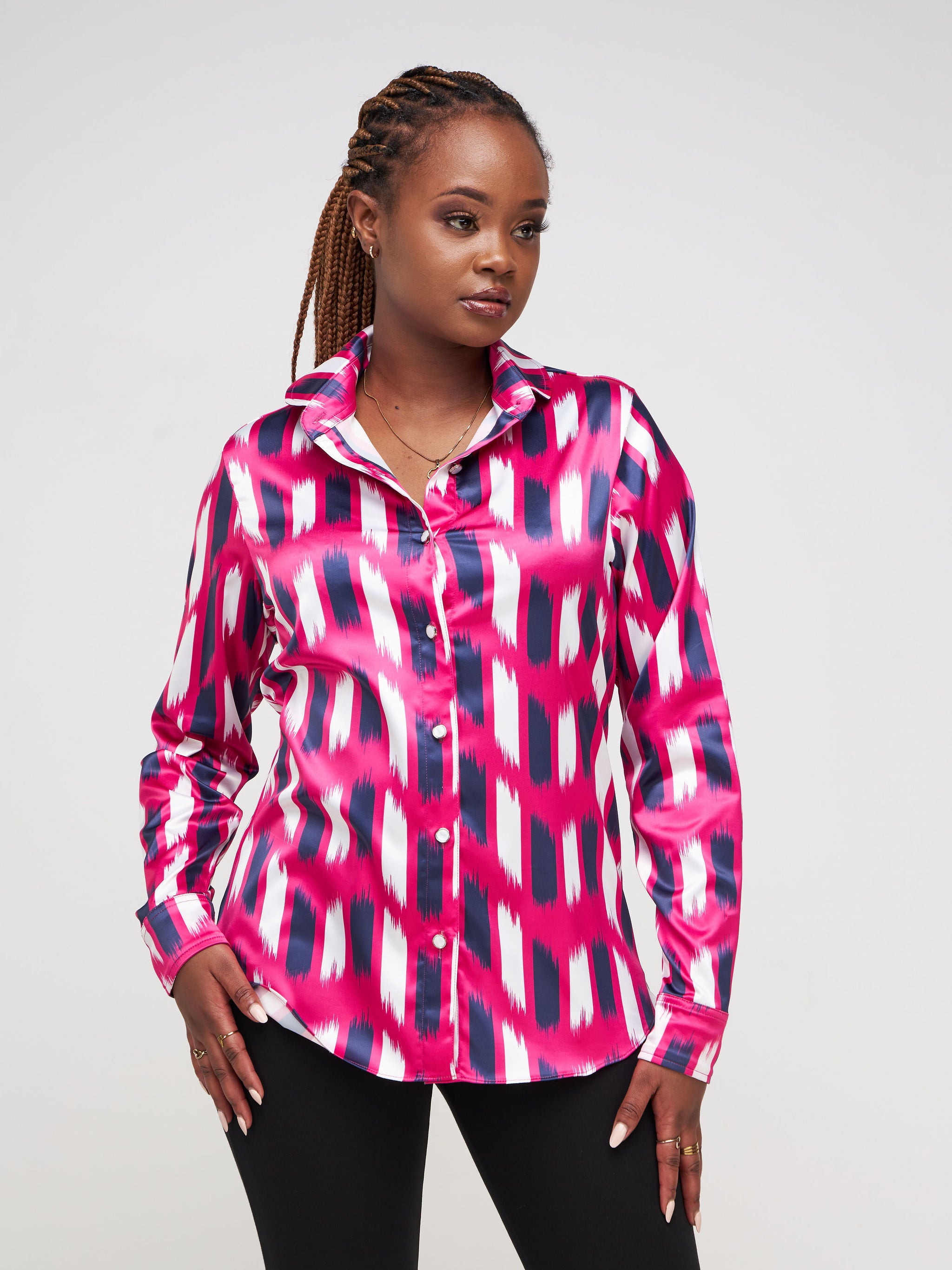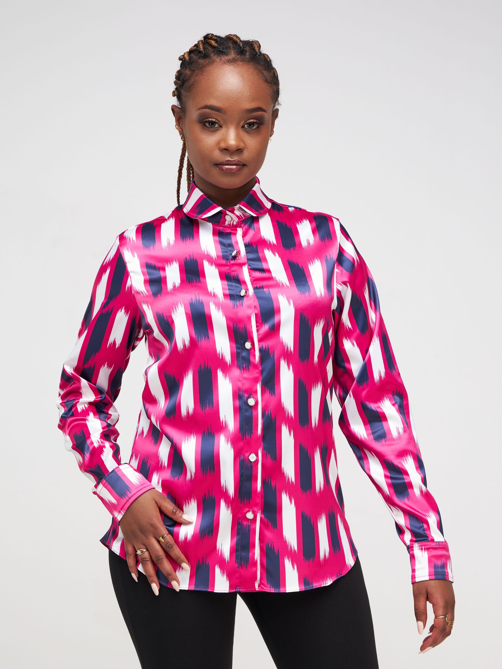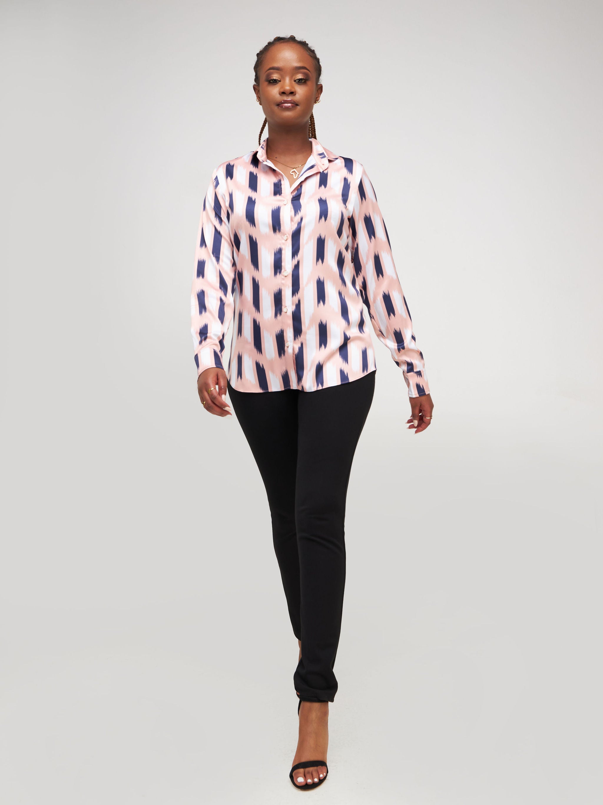 Vivo Neza Satin Long Sleeve Shirt - Pink / Navy Blue Abstract Print
