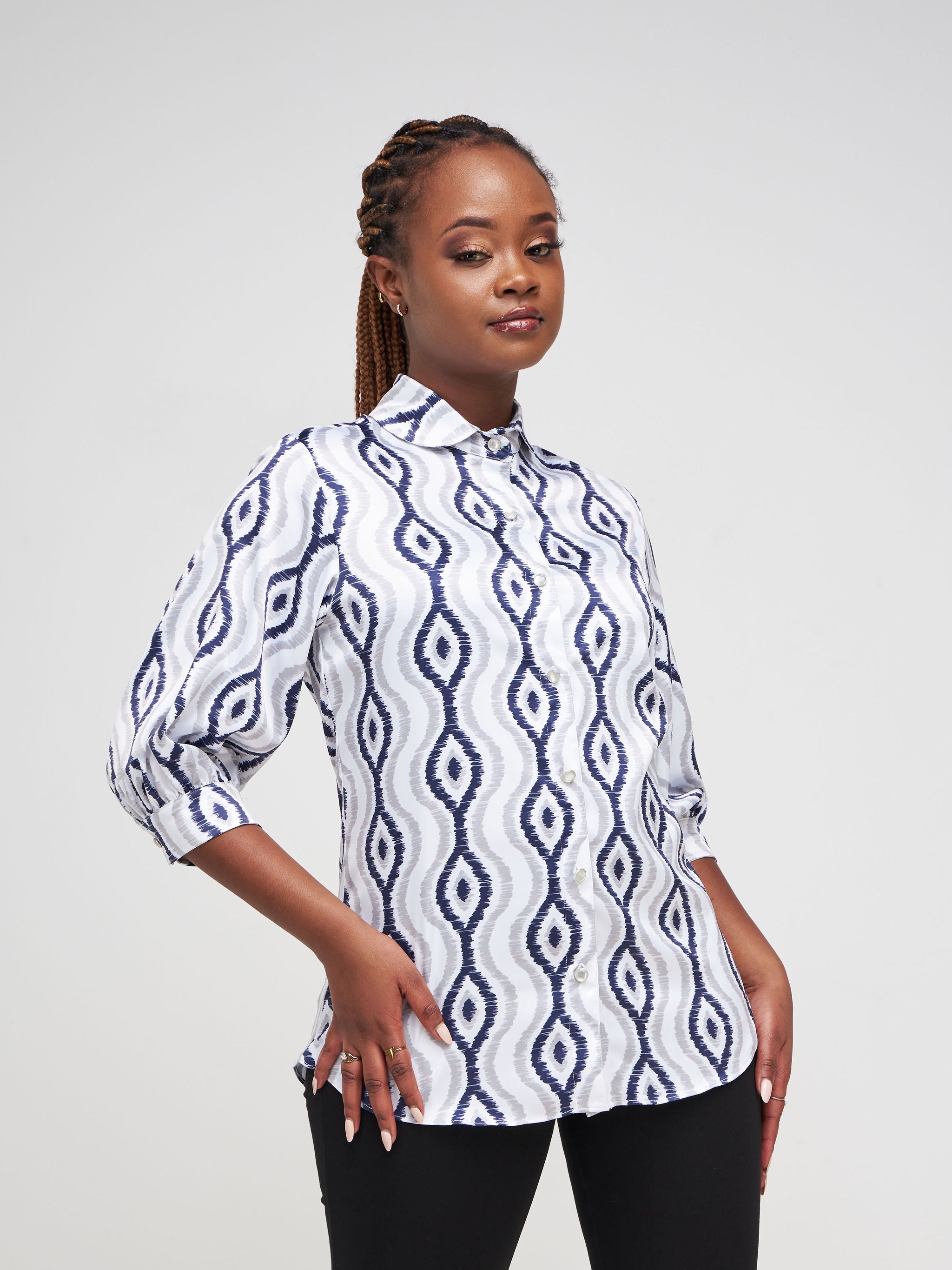 Vivo Neza 3/4 Bishop Sleeve Shirt - Navy Blue / Grey Abstract Print